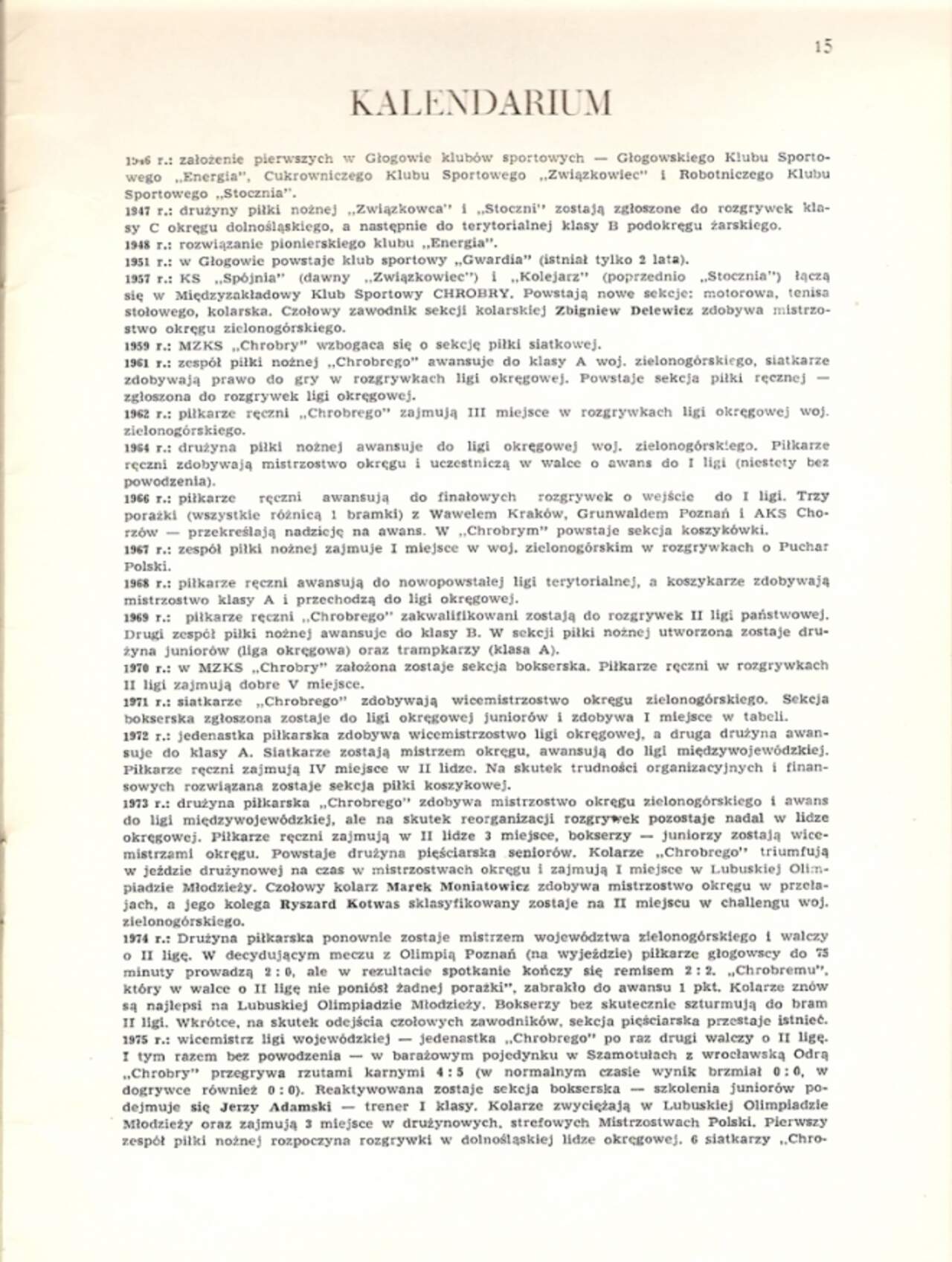 68 lat temu w mieście połączono piłkarskie siły Za początki piłki nożnej w Głogowie, a tym samym klubu uznaje się rok 1946. Jedenaście lat później doszło do połączenia sił istniejących wtedy klubów, Kolejarza i Spójni, na bazie czego powstał Chrobry. 17-01-2025 11:52 autor: ŁJ Za początki piłki nożnej w Głogowie, a tym samym klubu uznaje się rok 1946. Jedenaście lat później doszło do połączenia sił istniejących wtedy klubów, Kolejarza i Spójni, na bazie czego powstał Chrobry, którego prezesem został Jan Marchodej. Miało dojść do tego 17 stycznia 1957 roku, więc dziś mamy 68 rocznicę tego wydarzenia. Chrobry od tego momentu kontynuował dzieło zapoczątkowane w 1946 roku przez działaczy oraz sportowców Energii, Związkowca i Stoczni. Przypominamy materiały tekstowe przybliżające tamten dzień. 17 stycznia 1957 w auli na pierwszym piętrze odbudowywanego gmachu byłej szkoły realnej, w którym mieści się obecnie szkoła zawodowa, odbywa się spotkanie lokalnych działaczy sportowych, przedstawicieli zakładów pracy i władz miasta. Z inicjatywą wystąpili działacze i zawodnicy klubów sportowych "Kolejarz" i "Spójnia". Ten pierwszy kontynuował działalność poprzedników - klubów opartych o głogowską Stocznię. Natomiast Spójnia miała korzenie wśród sportowców Cukrowni a klub związał się z federacjami związków zawodowych. Entuzjaści wspólnych działań wynikających również ze zmian politycznych następujących w kraju, utworzyli dziś nowy klub łączący dotychczasowe podmioty i ich członków. Powstał więc Klub Sportowy "Chrobry" Głogów. Pomysłodawcami nazwy byli Zdzisław Berta i Jan Marchodej, który został pierwszym Prezesem. Klub był wielosekcyjny choć pierwsze skrzypce odgrywała sekcja piłki nożnej. Jednak działacze innych dyscyplin w klubie znaleźli też miejsce dla pracy z młodzieżą. Wbrew intencjom założycieli nie wszystkie zakłady chciały partycypować w finansowaniu działalności sportowej i rozbudowie bazy treningowej. Początki były więc trudne. źródło: Głogowski Wehikuł Czasu Na podstawie własnych zasobów czytamy też m.in.: 17 stycznia 1957 roku w auli obecnego Zespołu Szkół Mechanicznych w Głogowie zebrali się działacze i zawodnicy "Kolejarza" oraz "Spójni", a także aktywiści spoza klubów. Na spotkaniu zapadła decyzja o połączeniu się tych dwóch klubów w jeden Międzyzakładowy Klub Sportowy. Na wniosek sędziego piłkarskiego Jana Marchodeja, poparty przez Zbigniewa Nowotkę i Mariana Kowalika, poprzez aklamację przyjęto nazwę nowego klubu - Międzyzakładowy Klub Sportowy "Chrobry" Głogów. Wyłoniono pierwszy zarząd w składzie: - Jan Marchodej jako prezes klubu - Marian Kowalik jako wiceprezes klubu - Zdzisław Berta jako wiceprezes klubu - Roman Feluś jako sekretarz klubu oraz członkowie zarządu: - Władysław Rybczyński - Jan Komar - Józef Kobczyk - Edward Hipner - Zbigniew Nowotko - Jan Mocek Nakreślono ambitne założenia systematycznego rozwoju klubu, wzrost wyników i sprawniejszej działalności organizacyjnej. Ambitne plany działaczy Chrobrego zmierzające do utworzenia klubu z prawdziwego zdarzenia nie spotkały się wówczas z dużym zainteresowaniem ze strony wszystkich patronujących zakładów pracy. Klub borykał się z trudnościami finansowymi, brakowało należytej bazy treningowej. Nic więc dziwnego, że w latach 1957-1959, tj. w okresie kadencji pierwszego zarządu, nie odnotowano większych sukcesów. W pierwszym sezonie istnienia Chrobry był bliski wywalczenia awansu do klasy A (czwarta klasa rozgrywkowa). Przed ostatnią kolejką głogowianie prowadzili w tabeli, ale niestety w wyjazdowym spotkaniu przegrali niespodziewanie 1:3 ze Zrywem Kotla i nie uzyskali promocji.