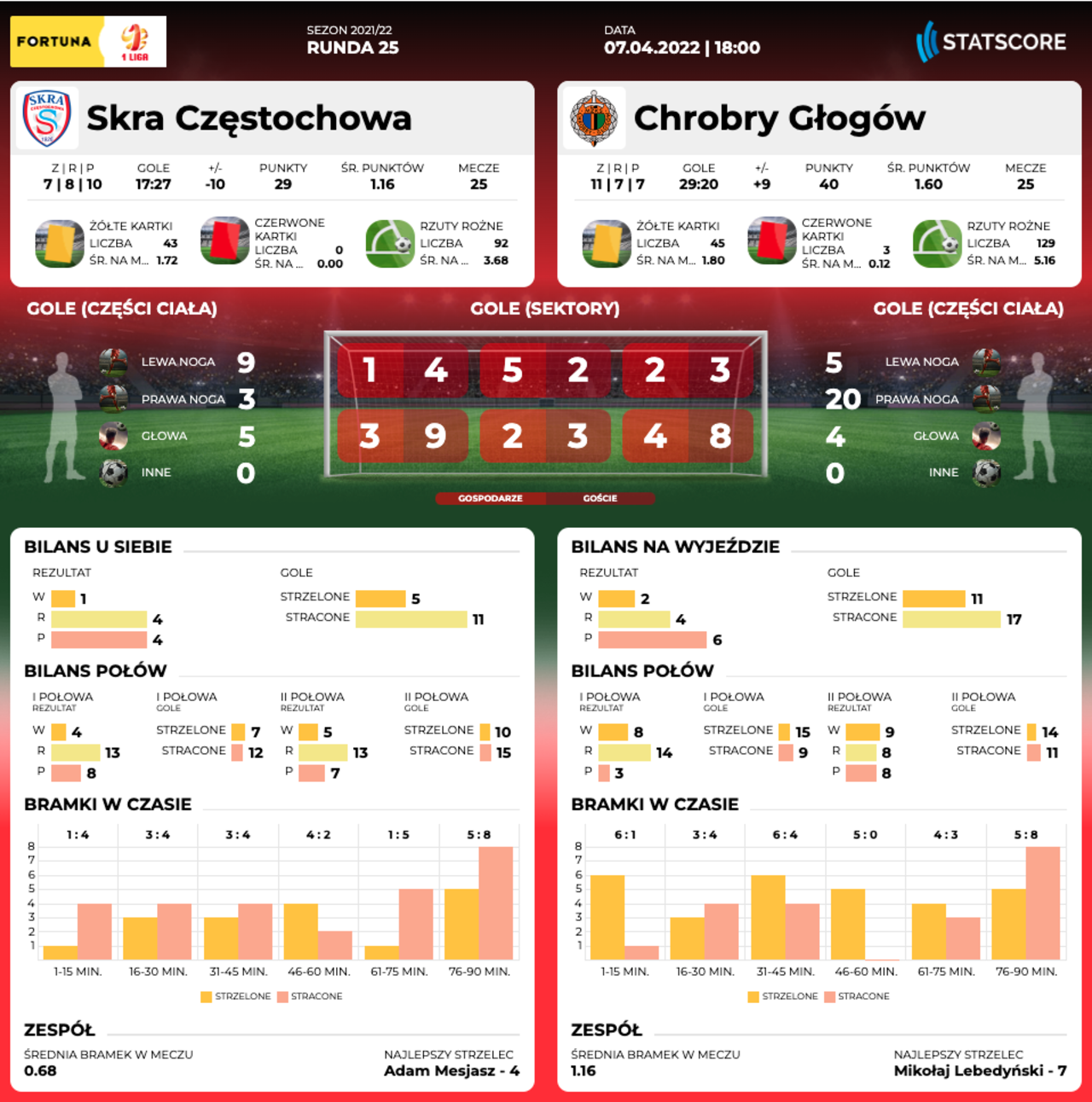 CZW. 18.00: SKRA-CHROBRY W czwartek o godz. 18.00 w Bełchatowie początek zaległego meczu ze Skrą Częstochowa. 06-04-2022 10:35 autor: ŁJ Wyjazdowy dzień meczowy! W czwartek o godz. 18.00 Pomarańczowo-Czarni zmierzą się ze Skrą Częstochowa. Spotkanie 25 kolejki Fortuna 1 Ligi zostanie rozegrane na stadionie w Bełchatowie, który od tego meczu będzie dla Skry „domowym” obiektem. OGLĄDAJ SKRA - CHROBRY NA ŻYWO! PRZEJDŹ DO STRONY I WYKUP JEDNORAZOWY DOSTĘP Pierwotnie mecz miał się odbyć w marcu, jednak z powodu powołań do reprezentacji narodowych większość spotkań 25 kolejki zostało przełożonych i są odrabiane teraz. Wtedy po stronie Chrobrego nieobecny był reprezentant Polski U-20 Dominik Piła, który oczywiście tym razem może zagrać przeciwko Skrze. Do składu może też powrócić pauzujący w niedzielę za żółte kartki Mikołaj Lebedyński. Zastępujący go Dennis van der Heijden rozegrał dobre zawody, które poparł bramką, i kibice są pewnie ciekawi pomysłu na skład trenera Ivana Djurdjevicia. Kadrowicza w swojej kadrze ma również Skra. Aleksander Paluszek jest reprezentacyjnym kolegą Dominika Piły i obu młodzieżowców można spodziewać się na boisku. Młody obrońca został wypożyczony do częstochowskiego klubu z Górnika Zabrze. W kontekście tego spotkania warto wspomnieć o młodzieżowcach, bo oba kluby są w czołówce klasyfikacji Pro Junior System. Trenerzy Chrobrego mocno stawiają na młodzież, dzięki czemu klub jest liderem promującego szkolenie programu. Skra natomiast w ostatnim meczu (2:3 z Arką Gdynia) zagrała w podstawie z czwórką młodzieżowców, a to wszystko stanowi ciekawą otoczkę czwartkowej rywalizacji. Poza młodymi piłkarzami drużyna z Częstochowy opiera się też na bardziej doświadczonych graczach, spośród których najlepszym strzelcem jest 29-letni Adam Mesjasz. 06-04-2022 GRAMY ZE SKRĄ. DOWIEDZ SIĘ WIĘCEJ O RYWALU Skra Częstochowa czwartkowym rywalem Chrobrego. Przedstawiamy naszego najbliższego przeciwnika, z którym zagramy w Bełchatowie. Wszystkie spotkania Fortuna 1 Ligi możesz obstawiać na www.efortuna.pl Kurs w Fortunie, że Chrobry wygra ze Skrą wynosi 2.30. Fortuna online zakłady bukmacherskie sp. z o.o. to legalny bukmacher posiadający zezwolenia na urządzanie zakładów wzajemnych w Polsce. Udział w nielegalnych grach hazardowych grozi konsekwencjami prawnymi. Hazard związany jest z ryzykiem. O KLUBIE Pełna nazwa: Klub Sportowy Skra Częstochowa Spółka Akcyjna (Klub Sportowy Skra Częstochowa) Rok powstania: 1926 Adres: Loretańska 20, 42-226 Częstochowa Internet: www.ks-skra.pl (oficj.) Barwy: biało-niebiesko-czerwone Osiągnięcia: 4. miejsce w II lidze - 1949 Stadion: - pojemność - 990 miejsc - oświetlenie - 550lx - boisko - 105x68m Bramkarze: Jakub Hajda (03), Mateusz Kos (87), Nikodem Sujecki (03). Obrońcy: Mariusz Holik (93), Adam Mesjasz (93), Aleksander Paluszek (01), Milan Posmyk (02), Łukasz Winiarczyk (90). Pomocnicy: Bartosz Baranowicz (03), Rafał Brusiło (89), Bartłomiej Burman (01), Mikołaj Kwietniewski (99), Mateusz Magdziarz (03), Mateusz Malec (03), Krzysztof Napora (90), Dawid Niedbała (94), Piotr Nocoń (90), Adam Olejnik (91), Piotr Pyrdoł (99), Przemysław Sajdak (00), Szymon Szymański (96). Napastnicy: Oskar Krawczyk (05), Kamil Lukoszek (02), Maciej Mas (01), Krzysztof Ropski (96), Kamil Wojtyra (97), Adrian Żabik (03). Trener: Jacek Rokosa.