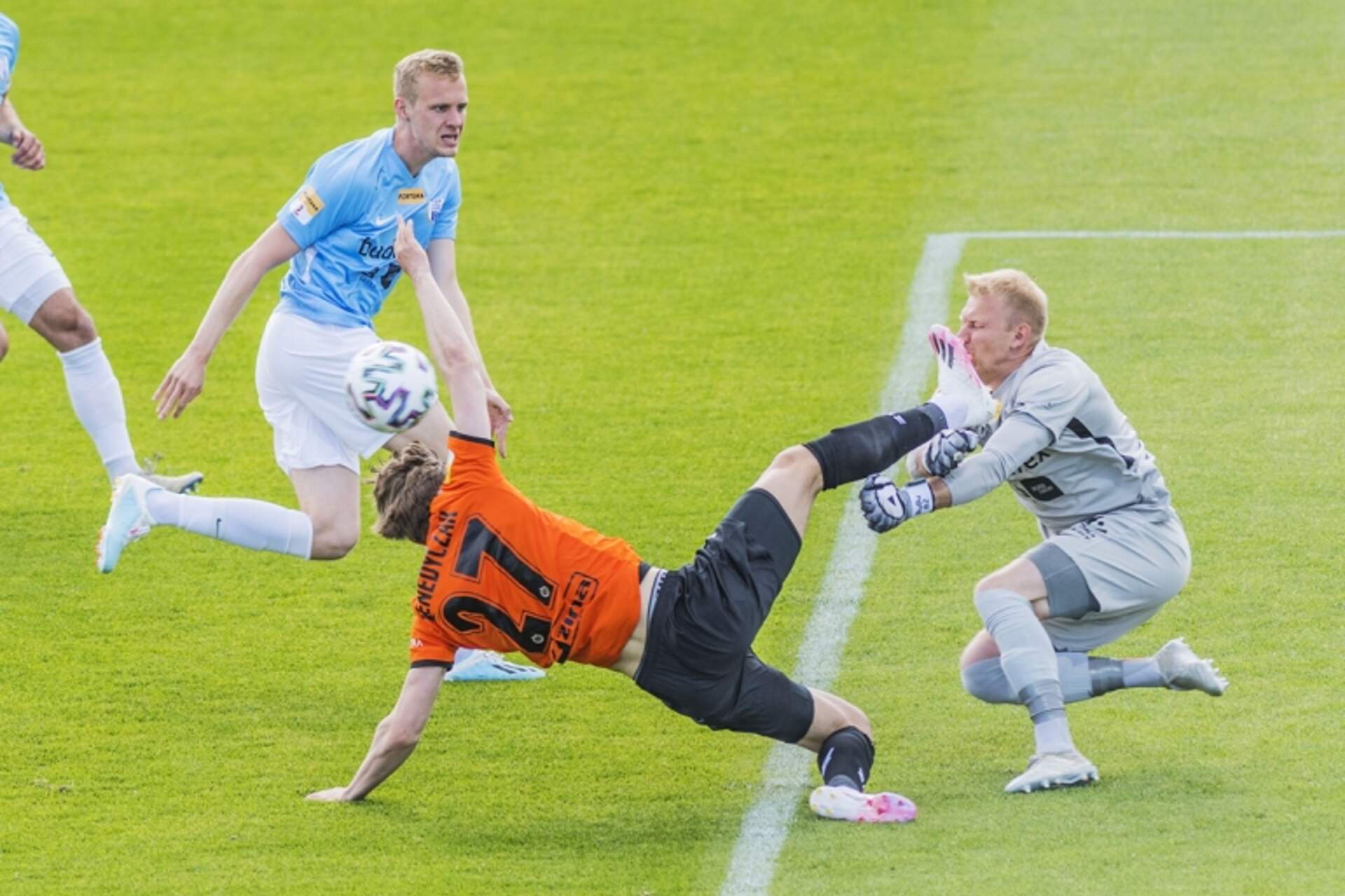 Cenny punkt i piłka meczowa Chrobrego Chrobry pozostaje niepokonany w tym roku i przede wszystkim nie przegrywa z bezpośrednim przeciwnikiem. Wyjazdowe 0:0 ze Stomilem Olsztyn poprawia dorobek Pomarańczowo-Czarnych do siedmiu punktów w trzech tegorocznych występach. Remis… 02-06-2020 10:08 autor: ŁJ Chrobry pozostaje niepokonany w tym roku i przede wszystkim nie przegrywa z bezpośrednim przeciwnikiem. Wyjazdowe 0:0 ze Stomilem Olsztyn poprawia dorobek Pomarańczowo-Czarnych do siedmiu punktów w trzech tegorocznych występach. Remis wydaje się być sprawiedliwym rozstrzygnięciem, choć piłkę meczową - w tej sytuacji wybitą z samej linii bramkowej - w 82 minucie miał Chrobry.Trener Ivan Djurdjević do gry posłał tę samą jedenastkę, która zaczęła ostatni mecz z GKS-em Tychy na początku marca. Wtedy już po pierwszej połowie zobaczyliśmy dwie bramki. Być może długa przerwa i ogółem spore zamieszanie z tym wszystkim spowodowały, że w Olsztynie na ożywienie poczekaliśmy do końcowych minut pierwszej odsłony.Wydawało się, że lekką, optyczną przewagę posiadają Pomarańczowo-Czarni, którzy próbowali przedrzeć się zwłaszcza prawą stroną. Żadna z drużyn nie ryzykowała jednak na tyle wyraźnie, by coś konkretniejszego mieć z przodu i mocniej zaznaczyć swoją obecność. Za to jak już do tego doszło, to mieliśmy akcję za akcję. Jako pierwsi zagrozili gospodarze. W 39 minucie ruszyli z niebezpieczną kontrą, którą w okolicach szesnastki mógł wykończyć Artur Siemaszko. Wtedy bardzo dobrze zachował się Michał Szromnik, wybijając piłkę po jego strzale. 120 sekund później odpowiedział Chrobry. Futbolówkę wymieniali między sobą Miłosz Kozak z Marcelem Ziemannem, zresztą byłym zawodnikiem Stomilu, lecz przy strzale drugiego skutecznie interweniował także golkiper olsztynian Piotr Skiba. Po pierwszych 45 minutach mieliśmy bezbramkowy remis.Żywsza końcówka poniekąd zapowiedziała drugą część, bo w niej okazji było więcej, a wśród nich setka głogowian. Początkowo sytuacje brały się ze stałych fragmentów. W 58 minucie po wrzutce Szymona Drewniaka z rzutu wolnego sprytnie lobował głową Michał Michalec, lecz zmierzająca w kierunku dalszego słupka futbolówka ostatecznie nie znalazła drogi w światło bramki. 10 minut później w odpowiedzi Stomil - tym razem niecelna okazała się główka Wiktora Biedrzyckiego. O asystę bardzo starał się Drewniak, który w 77 minucie po raz kolejny dobrze dośrodkował, tym razem z rzutu rożnego. Starający się to wykorzystać Oliver Praznovsky przymierzył za wysoko.Piłkę meczową w 82 minucie miał Chrobry. Na czystą pozycję wyszedł Adrian Benedyczak i choć zdołał nawet minąć bramkarza Stomilu, futbolówkę po jego strzale wybito już z samej linii bramkowej… Wielu oglądających transmisję pewnie już widziało ją w środku. I choć chwilę później swoją szansę mieli gospodarze (Michał Szromnik obronił strzał z ostrzejszego kąta w wykonaniu Szymona Sobczaka), końcówka zdawała się należeć do głogowian. W 86 minucie dobrym podaniem Adrian Benedyczak pozwolił wyjść sam na sam Maksymilianowi Banaszewskiemu, lecz wprowadzony w tej części pomocnik przegrał pojedynek z Piotrem Lechem.Szkoda zwłaszcza świetnej okazji Benedyczaka, ale Chrobry w trzecim tegorocznym występie zdobywa siódmy punkt i to jest jak najbardziej powód do zadowolenia. W piątek kolejny mecz z bezpośrednim rywalem - o godz. 20.10 w Głogowie rozpocznie się spotkanie z GKS-em Bełchatów.Fot. Kacper Kirklewski/400mm
