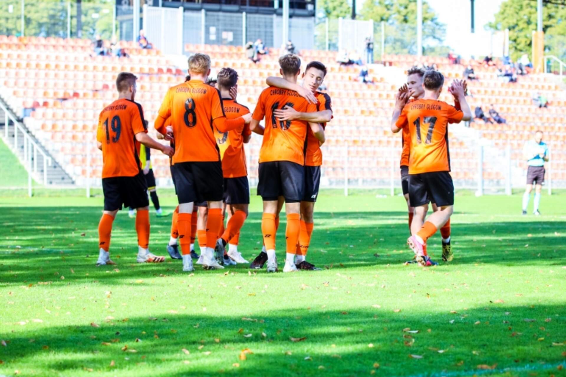 ChG II: pewne trzy punkty. 6:1 z Kuźnią Rezerwy Chrobrego z pewnym zwycięstwem w Koleje Dolnośląskie 4 Lidze. Pomarańczowo-Czarni pokonali Kuźnię Jawor 6:1 i to druga tak wysoka wygrana w tym sezonie. Wcześniej takim samym wynikiem zakończyło się spotkanie z Odrą… 11-10-2020 02:58 autor: ŁJ Rezerwy Chrobrego z pewnym zwycięstwem w Koleje Dolnośląskie 4 Lidze. Pomarańczowo-Czarni pokonali Kuźnię Jawor 6:1 i to druga tak wysoka wygrana w tym sezonie. Wcześniej takim samym wynikiem zakończyło się spotkanie z Odrą Ścinawa.Chrobry prowadził od 17 minuty, a podanie wzdłuż bramki od Przemysława Siudaka wykorzystał wtedy Olaf Zygmunt. W 36 minucie wynik podwyższył wychodzący sam na sam Siudak i ta połowa zakończyła się na dwubramkowym prowadzeniu. Dobre sytuacje mieli jeszcze Miłosz Jóźwiak i po stronie Kuźni Kacper Chudzik, ale w obu piłka nie zmierzała w światło bramki.Groźnie zrobiło się na początku drugiej odsłony. W 54 minucie sędzia podyktował rzut karny, który na kontaktowego gola zamienił Emilian Borek. Na szczęście głogowianie niewiele sobie z tego zrobili i pewnie ruszyli z akcjami. W tej połowie mieli ich więcej, więc kolejne bramki dołożyli Maksym Iwanowicz po wrzutce Przemka Siudaka z rzutu rożnego, za sprawą pięknego uderzenia z dystansu Miłosz Jóźwiak, Wiktor Kobiela i Kacper Staszkowian.Chrobry pozostaje na pozycji wicelidera. W środę o godz. 19.00 w zaległym spotkaniu podejmie Orkana Szczedrzykowice i stanie przed szansą zmniejszenia straty do lidera do trzech punktów.Chrobry II Głogów - Kuźnia Jawor 6:1 (2:0)1:0 Zygmunt 172:0 Siudak 362:1 Borek 54 (k)3:1 Iwanowicz 674:1 Jóźwiak 705:1 Kobiela 846:1 Staszkowian 87Chrobry: Szafer (78 Lasoń) - Staszkowian, Iwanowicz, Kobiela, Michalczyk (75 Grzymisławski), Siudak (84 Malczuk), Antochów, Zygmunt (67 Jandziak), Boksiński, Pietrzczyk, Jóźwiak.Kuźnia: Kulik - Borek, Pastuła (53 Gwiździał), Chudzik, Wiśniewski, Karbowiak (70 Olanin), Dunaj (69 Bieniusiewicz), Janoś, Suchecki (46 Bagiński), Dworakowski, Trzeciak (69 Duda).Żółte kartki: Chudzik (Kuźnia).