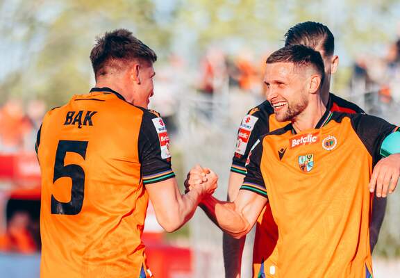 Efektowna pogoń nie została nagrodzona Dobry mecz, efektowna pogoń Chrobrego i pech w ostatniej akcji meczu. Chrobry - ŁKS 2:3. 06-08-2022 09:42 autor: ŁJ To był efektowny pościg Chrobrego do samego końca, włącznie z grą w jedenastu na połowie rywala, i szkoda że nie zostało to nagrodzone choćby punktem. Mateusz Bochnak zdobył dwa gole, mógł więcej, lecz z punktami pozostaje wygrywający 3:2 ŁKS Łódź. Po raz pierwszy w meczowej kadrze znalazł się nie tylko dołączony do drużyny w tym tygodniu Jakub Górski, ale też powracający do zdrowia Patryk Mucha. Z powodu kontuzji Patryk nie był do dyspozycji trenera w trzech dotychczasowych kolejkach. W samym składzie, w porównaniu do meczu z Chojniczanką, nastąpiła jedna zmiana na „pozycji” młodzieżowca, bo Dawida Hanca zastąpił Patryk Kusztal. Pierwsza połowa była dla Chrobrego… ciężka. ŁKS narzucił swoje tempo, a dający się zepchnąć do defensywy Chrobry już po kwadransie przegrywał 0:2. W 10 minucie miała miejsce pierwsza groźna sytuacja rywali, przy której bronił Karol Dybowski, jednak dosłownie sekundę wcześniej w szesnastce faulował Oliver Praznovsky. Został ukarany żółtą kartką, a zespół rzutem karnym, którego na gola zamienił Pirulo. Ten sam zawodnik pięć minut później podwyższył na 0:2, bliżej bramki kończąc drużynową akcję. Pomarańczowo-Czarni zaczęli się rozpędzać dopiero w końcowych minutach pierwszej odsłony i wypracowywali coraz większe zagrożenie, ale wynik nie uległ zmianie. To łodzianie na przerwę schodzili w komfortowej sytuacji. W drugiej połowie głogowianie zakasali rękawy i bardzo mocno wzięli się za odrabianie strat. Już w 51 minucie Mateusz Bochnak pięknym uderzeniem z pierwszej piłki, która po stałym fragmencie wyszła poza obręb szesnastki, pozwolił złapać kontakt. Chrobry próbował pójść za ciosem, cały czas napierał i pachniało wyrównującym golem. Zwłaszcza w 67 minucie. Wtedy na pierwszy plan mógł wysunąć się wchodzący na boisko chwilę wcześniej Paweł Tupaj, jednak zamykając wrzutkę na dalszy słupek trafił tylko w boczną siatkę. Nic tego ni zapowiadało, lecz gola zdobyli nie Pomarańczowo-Czarni, a łodzianie. W 76 minucie prowadzenie ŁKS-u podwyższył Mateusz Kowalczyk. Nawet to nie spowodowało, że z Chrobrego zeszło ciśnienie. Może trochę i tylko na jakiś czas, bo w 90 minucie Mateusz Bochnak po raz drugi pokonał golkipera gości. Czasu pozostawało niewiele, bo sędzia doliczył cztery minuty, choć w tym czasie działo się sporo. Karol Dybowski przy stałym fragmencie wbiegł nawet w pole karne rywali, a w ostatniej akcji meczu będący w świetnej sytuacji Mateusz Bochnak posłał futbolówkę za wysoko. Mógł zostać bohaterem tego pojedynku, lecz i tak należy pochwalić go za występ, a zespół za dobre widowisko z walką do samego końca. Przed Chrobrym bardziej intensywny tydzień, bo z dwoma meczami o ligowe punkty. W czwartek o godz. 18.00 spotkanie z Bruk-Bet Termaliką Nieciecza na stadionie rywala, a w niedzielę 14 sierpnia również o 18.00 z Podbeskidziem Bielsko-Biała na Wita Stwosza.