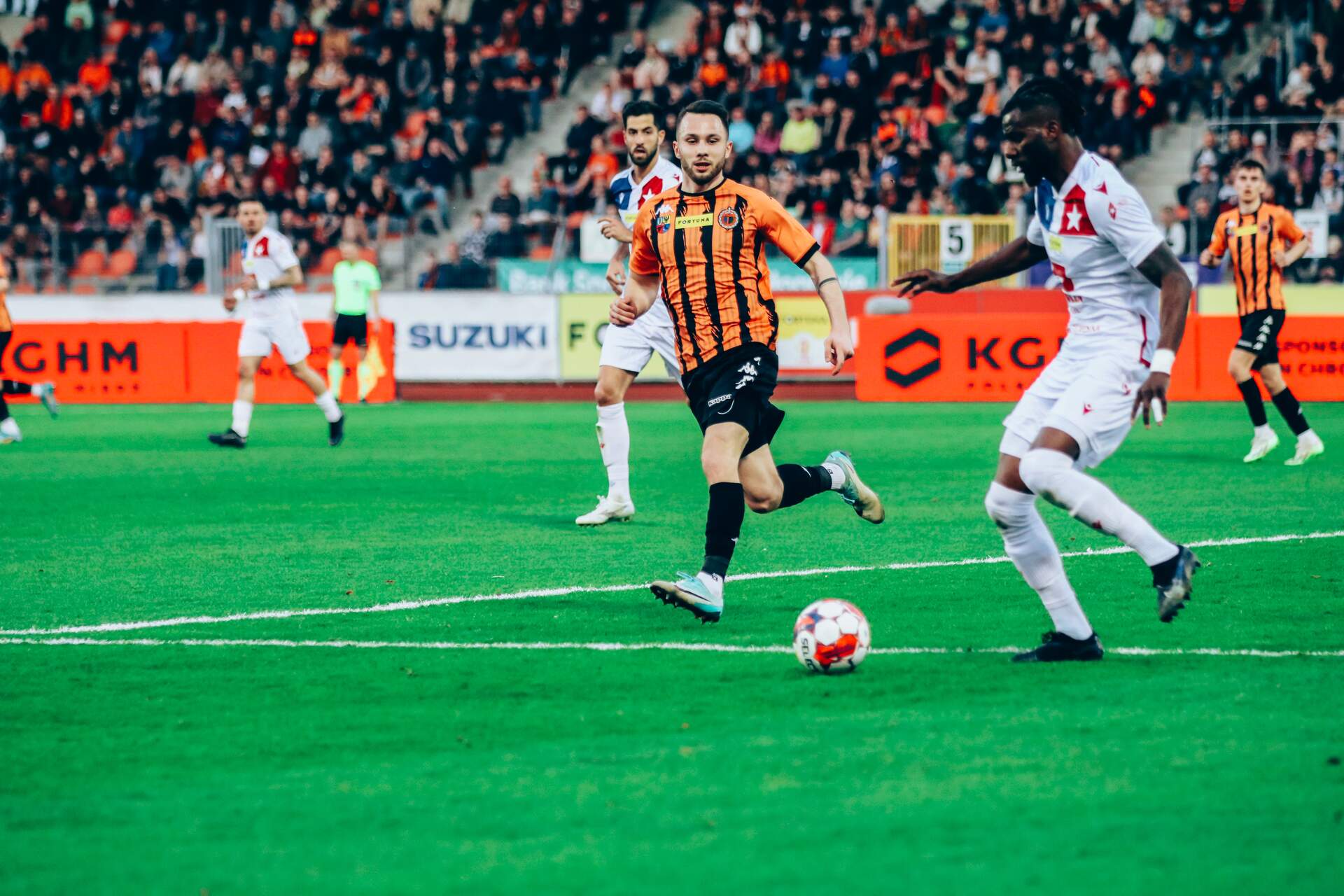Wielka sobota Chrobrego! Co za mecz Chrobrego Głogów, który mimo straty gola do szatni i 0:1 pokonał Wisłę Kraków 3:2! 30-03-2024 07:54 autor: ŁJ Przed tym meczem Damian Węglarz zapowiadał, że Chrobry zamierza zagrać odważnie i rzeczywiście tak było. Już w pierwszych kilkunastu minutach Pomarańczowo-Czarni mieli kilka szans. Szkoda tych tuż po upływie kwadransa. W 16 minucie po dośrodkowaniu Patryka Muchy niebezpiecznie główkował Mikołaj Lebedyński, przy czym interweniować musiał golkiper krakowian. Po chwili za głowę złapał się Jakub Kuzdra, po którego strzale z kilkunastu metrów piłka odbiła się od poprzeczki. Później okazje mieli jeszcze Robert Mandrysz, Bartosz Biel czy posyłający mocną piłkę zza pola karnego Albert Zarówny, ale jeśli futbolówka zmierzała w światło bramki - jak przy próbie Zarównego - bronił Alvaro Raton. Kiedy wydawało się, że ta część zakończy się na bezbramkowym remisie, końcówkę i chwilowe zamieszanie spowodowane przerwą po kontuzji Bartosza Biela wykorzystali Wiślacy. Tuż przed końcowym gwizdkiem Damiana Węglarza pokonał Szymon Sobczak - niespodziewanie, bo kilkadziesiąt wcześniejszych minut nie wskazywało na taki obrót sprawy. Chrobry jednak nic sobie z tego nie zrobił i po przerwie zaatakował z jeszcze większą mocą. Już w 48 minucie Szymon Bartlewicz strzałem z woleja doprowadził do wyrównania. I po tym za ciosem. W 57 minucie było już 2:1. Chwilę wcześniej bramkarz Wisły w pojedynku 1 na 1 sfaulował Mikołaja Lebedyńskiego i sam poszkodowany dał swojej drużynie prowadzenie. Miki mógł podwyższyć po kolejnej chwili, lecz piłkę po jego główce jakimś sposobem wyciągnął Alvaro Raton. Zabójcza była za to główka Alberta Zarównego, który w ten sposób zamknął akcję w 74 minucie i dosyć sprawnie zrobiło się 3:1. Świetną atmosferę mógł zmącić doliczony czas gry. To wtedy Alan Uryga doprowadził do stanu 3:2. Byłoby jednak wielce niesprawiedliwe, gdyby tak grający Chrobry zakończył swój występ na remisie. Na szczęście tej sprawiedliwości stało się zadość i Pomarańczowo-Czarni po kapitalnym widowisku zostali z kompletem punktów.
