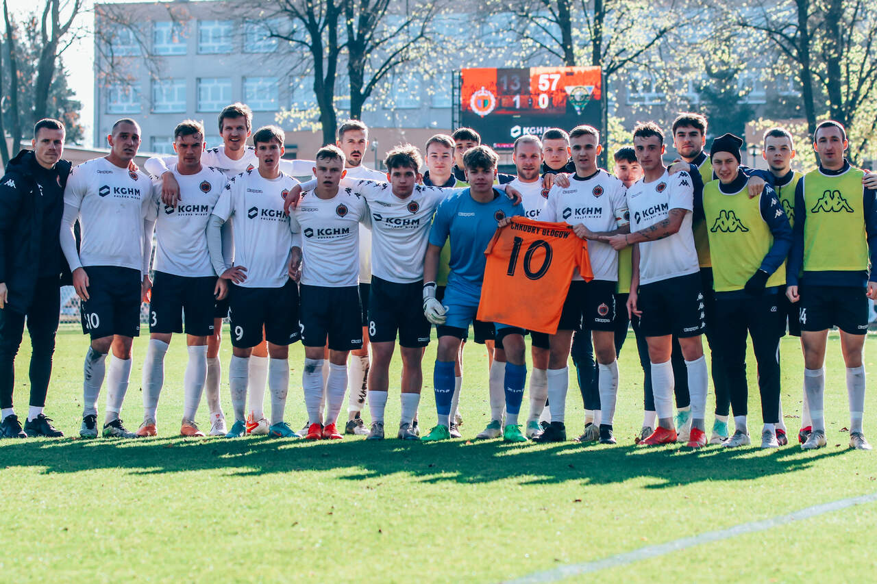 Chrobry II Głogów - Górnik Nowe Miasto Wałbrzych 5:0 Pięć goli Chrobrego II i trzy punkty w meczu Koleje Dolnośląskie 4 Ligi z Górnikiem Nowe Miasto Wałbrzych. 11-11-2023 12:41 autor: ŁJ Głogowianie dość szybko opanowali sytuację na boisku i już w 14 minucie Kamil Wojtyra otworzył wynik. W 35 minucie efektownie piłkę pod poprzeczką umieścił Sebastian Steblecki, a w samej końcówce, w 45 minucie swojego drugiego gola zdobył Wojtyra. Po 45 minutach Chrobry prowadził trzema bramkami, jedną z nich dedykując Adrianowi Marciniakowi. Uniesiona w górze przez Miłosza Jandziaka koszulka z nr „10” to gest i życzenia powrotu do zdrowia dla kolegi z boiska. Po przerwie długo nie oglądaliśmy kolejnych bramek, choć wstrzelić się starali Eryk Pieczarka, Artur Bogusz czy Elvis Stuglis. Pomarańczowo-Czarni nie zadowolili się jednak długo utrzymującym się 3:0 i mocno naciskali na rywali w samej końcówce. W efekcie gole zdobyli ci, którzy na boisku pojawili się dopiero w tej odsłonie: w 84 minucie trafił Tomasz Wojciechowski, a 180 sekund później okazałą wygraną Chrobrego przypieczętował Stanisław Antosik. CHROBRY II GŁOGÓW - GÓRNIK NOWE MIASTO WAŁBRZYCH 5:0 (3:0) 1:0 Wojtyra 14 2:0 Steblecki 35 3:0 Wojtyra 45 4:0 Wojciechowski 84 5:0 Antosik 87 CHROBRY II: Gawłowski - Bartecki (86 Fryzowicz), Górski (67 Krawiec), Bogusz (71 Antosik), Stuglis, Jandziak, Maćkowiak, Pieczarka (83 Jurgo), Zygmunt (81 Wojciechowski), Wojtyra (67 Antkowiak), Steblecki. ŻÓŁTE KARTKI (CHROBRY II): Bartecki.