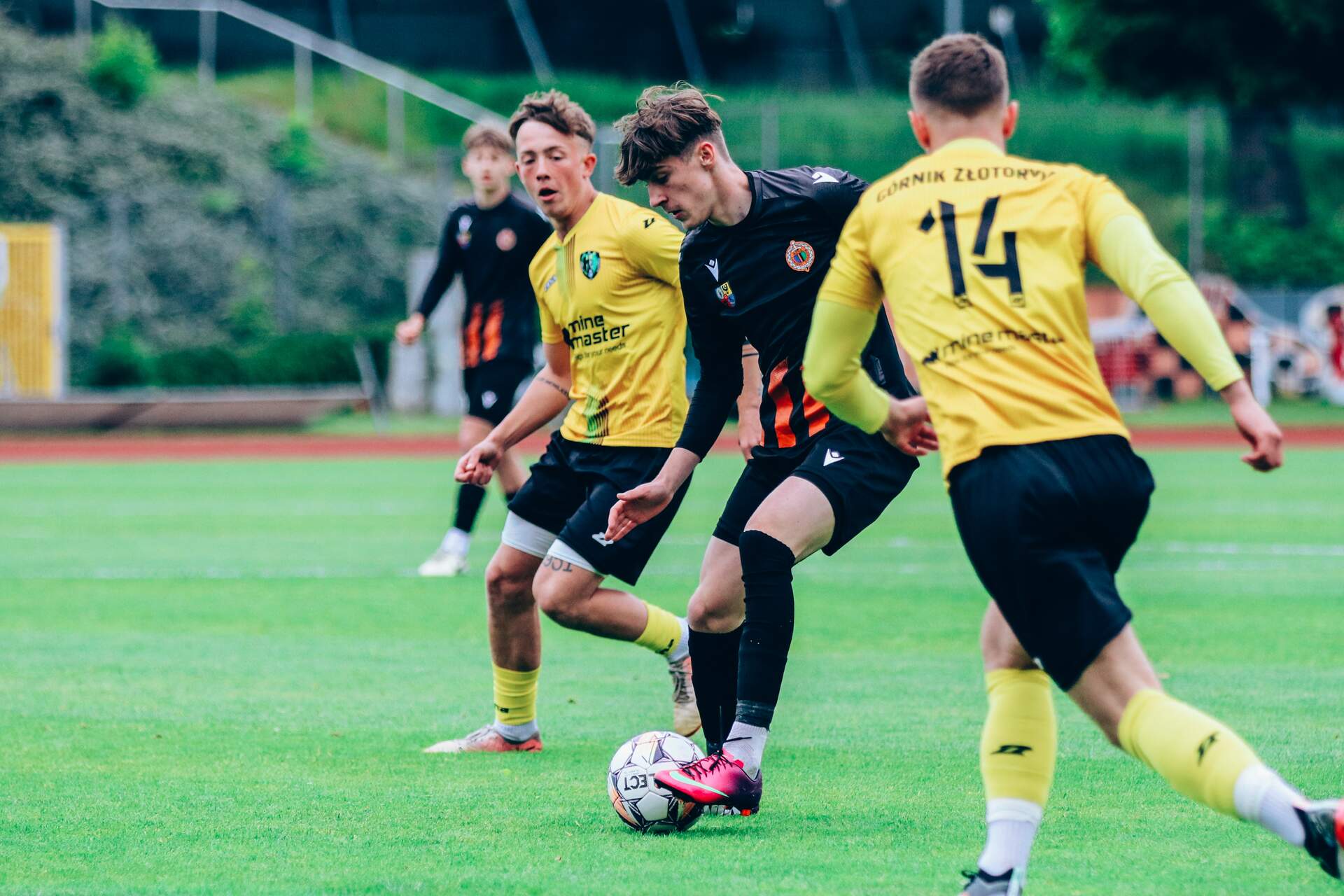 ChG II: punkt po golu w doliczonym czasie Bardzo dobre widowisko z wieloma sytuacjami stworzyły zespoły Chrobrego II i Górnika Złotoryja. Po bramce Tomka Wojciechowskiego w doliczonym czasie gry Pomarańczowo-Czarni zostają z punktem. 17-05-2025 06:14 autor: ŁJ Jak przystało na spotkanie sąsiadów z czołówki ligowej tabeli, w tym meczu od pierwszej do 90 minuty działo się sporo. Były świetne okazje do zdobycia gola, momentami akcja za akcję i efektowane interwencje bramkarzy. Bramkowe emocje przeniosły się jednak na samą końcówkę. W 85 minucie goście wyszli na prowadzenie, ale Chrobry powalczył do samego końca. Dosłownie, bo w doliczonym czasie wywalczył rzut karny. Do ustawionej na jedenastym metrze piłki podszedł Tomasz Wojciechowski i pewnym strzałem doprowadził do wyrównania. Chwilę później sędzia zagwizdał po raz ostatni. CHROBRY II GŁOGÓW - GÓRNIK ZŁOTORYJA 1:1 (0:0) 0:1 Ruszczak 85 1:1 Wojciechowski 90 (k) CHROBRY II: Gawłowski – Janik (90 Kistowski), Marcinkowski (46 Antkowiak), Wojciechowski, Francus (80 Hajłasz), Wojtal (46 Tworzydło K.), Grzelak (46 Gaweł), Bartecki, Cichy (74 Tworzydło A.), Rosa, Witczak. ŻÓŁTE KARTKI (CHROBRY II): Witczak.