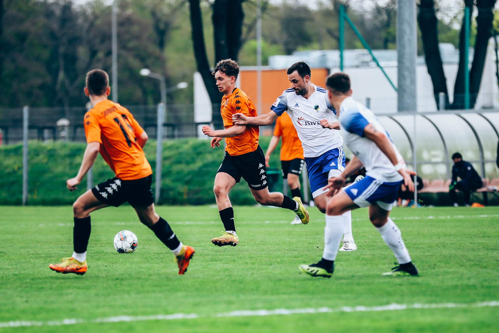 Chrobry II Głogów - Pniówek Pawłowice 1:2 Porażka Chrobrego II w 26 kolejce 3 Ligi. Pniówek Pawłowice wywozi z Głogowa komplet punktów, zwycięskiego gola zdobywając w ostatnim kwadransie gry. 28-04-2023 07:00 autor: ŁJ W pierwszych minutach optyczną przewagę mieli głogowianie, ale nie przełożyła się ona na bramkowe sytuacje. Długo w tym spotkaniu nic, jeśli chodzi o zagrożenie bramkowe się nie działo, ale z tej walki wytworzyła się ciekawa końcówka. W 38 minucie Pniówek objął prowadzenie, a Bartka Szafera pokonał Dawid Hanzel. Rywale mieli też świetną okazję podwyższenie rezultatu, ale bardzo dobrze w sytuacji sam na sam interweniował Szafer. Kiedy wydawało się, że pierwsza połowa skończy się na jednobramkowej przewadze gości, na strzał zza pola karnego zdecydował się Jakub Górski. I była to dobra decyzja pomocnika Chrobrego – piłka po rękach interweniującego bramkarza Pniówka wpadła do środka. W drugiej połowie Chrobry dążył do przechylenia szali na swoją korzyść, ale zrobili to przyjezdni. W 78 minucie po wrzutce ze stałego fragmentu wstrzelił się Bartosz Szary. Głogowianie byli skutecznie powstrzymywani, nie mieli aż tak dobrych okazji i w efekcie muszą pogodzić się z faktem, że ich dorobek punktowy pozostanie po tej kolejce bez zmian. CHROBRY II GŁOGÓW – PNIÓWEK PAWŁOWICE 1:2 (1:1) 0:1 Hanzel 38 1:1 Górski 45 1:2 Szary 78 CHROBRY II: Szafer – Malczuk (74 Antkowiak), Praznovsky, Wawrzyniak, Pieczarka, Marciniak, Wojciechowski, Bartlewicz (60 Matysiak), Sewerzyński (74 Jaszczyk), Górski J. (46 Hanc (86 Maćkowiak)), Ilków-Gołąb. PNIÓWEK: Gocyk – Szary, Szczęch, Glenc, Morcinek (68 Herman), Groborz, Spratek, Szkatuła (87 Baranskyi), Hanzel, Musioł, Brychlik (80 Wyciński). ŻÓŁE KARTKI: Praznovsky, Wojciechowski, Sewerzyński, Pieczarka, Szafer, Marciniak – Szczęch, Groborz, Wyciński, Baranskyi. ZOBACZ TABELĘ 3 LIGI