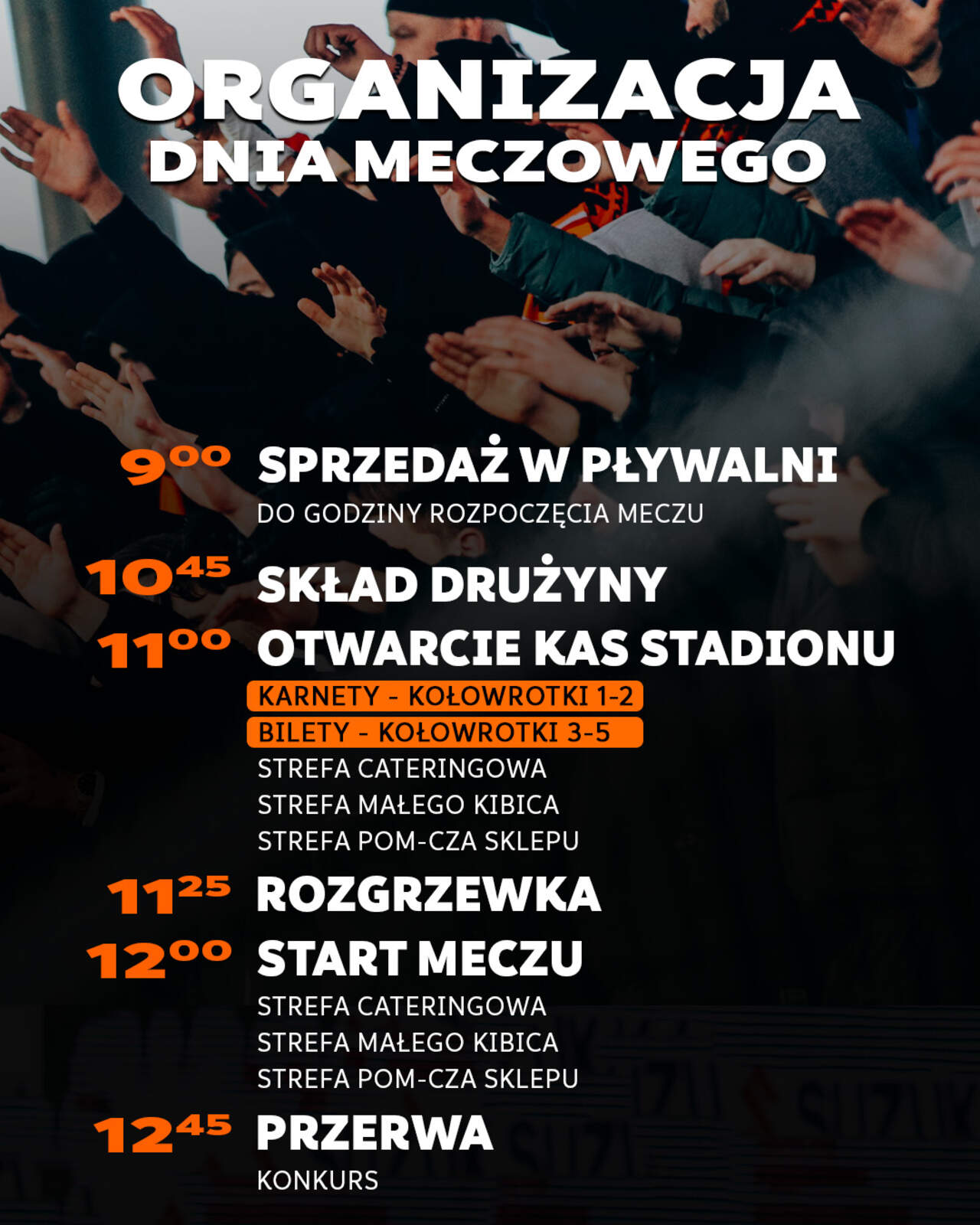 Organizacja dnia meczowego na #CHRPOG Najważniejsze organizacyjne informacje przed niedzielnym meczem z Pogonią Siedlce (godz. 12.00). 30-11-2024 04:00 autor: ŁJ Kasy stadionu zostaną otwarte na godzinę przed meczem, o godz. 11.00. Bilety w kasach stadionu będą w cenach 20 / 30 zł. W celu uniknięcia kolejek zachęcamy do tańszych alternatyw, jak zakup biletu on-line na www.bilety-chrobry-glogow.pl, gdzie są one w cenach 10 / 20 zł, a internetowa sprzedaż będzie dostępne aż do godziny rozpoczęcia meczu, tj. do godz. 12.00. Nawet podchodząc do kas stadionu i widząc kolejkę po zakup, warto wyciągnąć telefon i dokonać zakupu w tej formie, bo nie ma konieczności drukowania biletu - wystarczy go okazać w posiadanym urządzeniu. Wejście dla posiadaczy karnetów będzie odbywać się poprzez kołowrotki nr 1 i 2. Natomiast wejście dla kibiców posiadających bilet będzie odbywać się będzie kołowrotkami nr 3, 4 5. Przy wejściu na stadion, za małą trybuną, otwarta będzie Strefa Pomarańczowo-Czarnego Sklepu z koszulkami meczowymi marki Macron i innymi klubowymi akcesoriami, w tym czapkami z nowej, zimowej kolekcji. Na stadionie czynna będzie strefa cateringowa i zachęcamy do dokonywania zakupów w tym punkcie prowadzonym przez znaną głogowską restaurację Fortepiano-Ristorante. Najmłodszych kibiców zapraszamy do Strefy Małego Kibica, którą w tym sezonie przy obecności trenerów Akademii Piłki Nożnej prowadzi Przedszkole Niepubliczne Jarzębinki. Strefa z malowaniem twarzy, kolorowankami, grami i zabawami będzie aktywna za małą trybuną i na przylegającym do niej pasie zieleni. W przerwie meczu na murawie odbędzie się konkurs dla kibiców. Do udziału w nim zaprosimy kibiców, którzy złapią rzucone przez piłkarzy Chrobrego bezpośrednio po zakończeniu pierwszej połowy piłki. Zachowajcie uwagę, przygotujcie się na konkurencję piłkarską i na murawie porywalizujcie o przygotowane przez nas nagrody!
