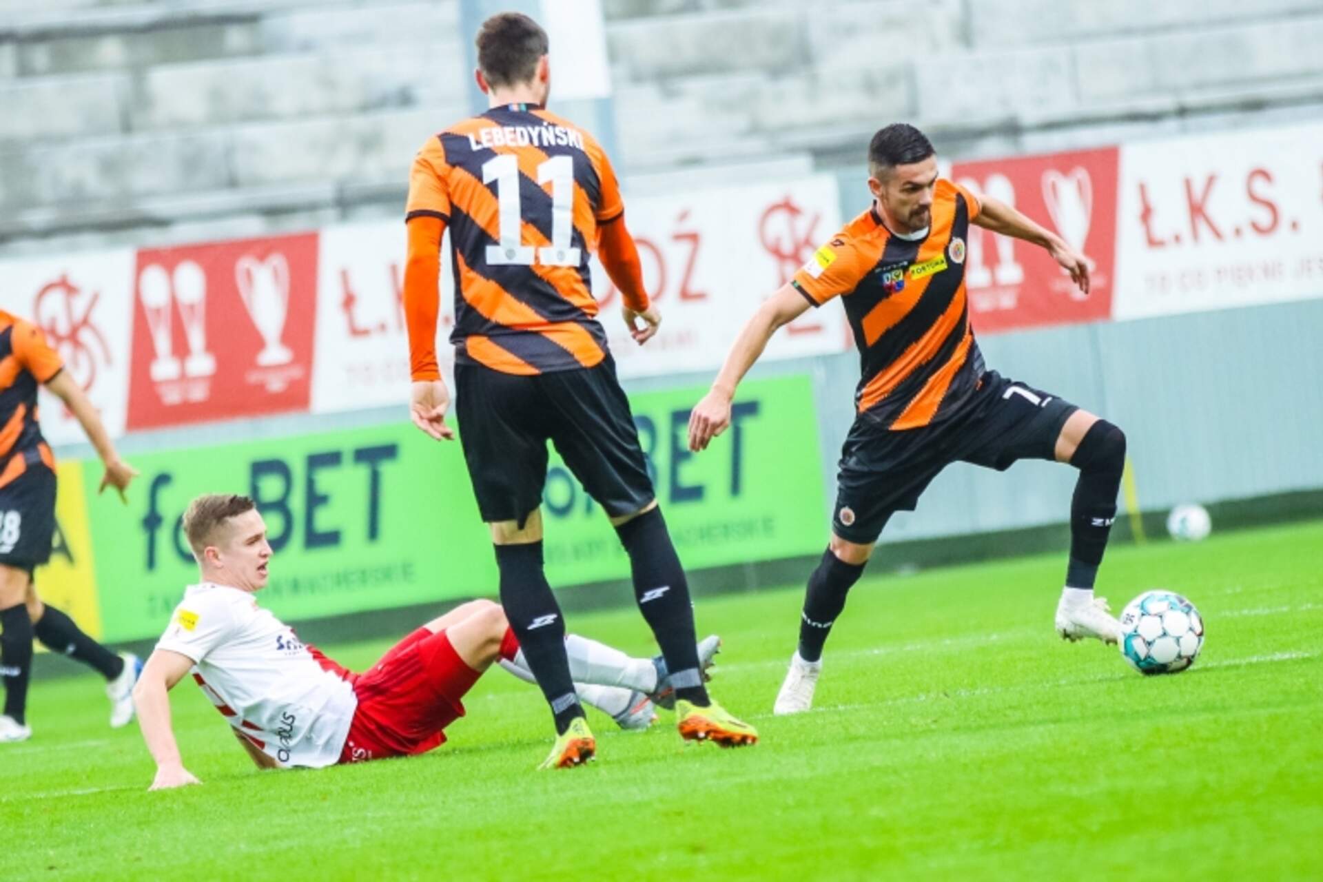 Chrobry poległ po 60 minucie Powrót z Łodzi bez punktów. Przez 60 minut Chrobry stawiał na terenie wicelidera solidny opór. Tyle nie wystarczyło. Po tym czasie ŁKS zdobył cztery gole i pewnie wygrał 4:0.W pierwszych minutach ŁKS potwierdzał dużą… 07-11-2020 03:07 autor: ŁJ Powrót z Łodzi bez punktów. Przez 60 minut Chrobry stawiał na terenie wicelidera solidny opór. Tyle nie wystarczyło. Po tym czasie ŁKS zdobył cztery gole i pewnie wygrał 4:0.W pierwszych minutach ŁKS potwierdzał dużą piłkarską jakość. Długo utrzymywał się przy piłce i przez to w pierwszych dziesięciu minutach nie dopuścił Chrobrego bliżej swojej bramki. Sam jednak oddawał niecelne strzały (Maksymilian Rozwandowicz czy Antonio Dominguez), i to musząc próbować uderzać z kilkunastu metrów. Na bliższy kontakt głogowianie nie pozwalali. Z czasem Pomarańczowo-Czarni sami jakby uwierzyli w siebie. Potrafili ruszyć z wysokim pressingiem i zagrozić Arkadiuszowi Malarzowi. W 18 minucie oddali pierwszy poważniejszy strzał. Wówczas z dystansu przymierzył Marcel Ziemann, ale piłka poszybowała ponad poprzeczką. Pomocnik Chrobrego jeszcze kilkukrotnie podejmował podobne próby, lecz najbardziej szkoda okazji z 27 minuty. Lewą stroną ruszył Robert Mandrysz, w końcowej fazie akcji posyłając futbolówkę wzdłuż bramki. Tam nabiegał na nią Mikołaj Lebedyński, jednak nie zdołał jej trącić. W tych 45 minutach obie drużyny zagrały na remis.Po przerwie również wyglądało to nieźle, ale popsuło się w 60 minucie. Gospodarze ruszyli z kontrą, piłka po strzale Pirulo wylądowała na poprzeczce, lecz Samuel Corral nie pomylił się przy dobitce. Trener chciał zareagować potrójną zmianą, a gdy przy linii na wejście czekali Mateusz Machaj, Tomasz Cywka i Damian Kowalczyk, padł drugi gol dla łodzian. Po dośrodkowaniu z rzutu rożnego wstrzelił się Carlos Moros. W 77 minucie rezultat podwyższył Pirulo, który Kacpra Bieszczada pokonał lekkim, technicznym strzałem, a w samej końcówce głogowian dobił Antonio Dominguez. Przez 60 minut było solidnie, ale po tym czasie to już koncert ŁKS-u i jego hiszpańskich piłkarzy.Dla Chrobrego to trzecia porażka z rzędu. Koniecznie trzeba się od tego odbić i najlepiej już w kolejnym meczu. Ważne będzie spotkanie ze Stomilem Olsztyn, które już w piątek o godz. 17.40 przy Wita Stwosza.