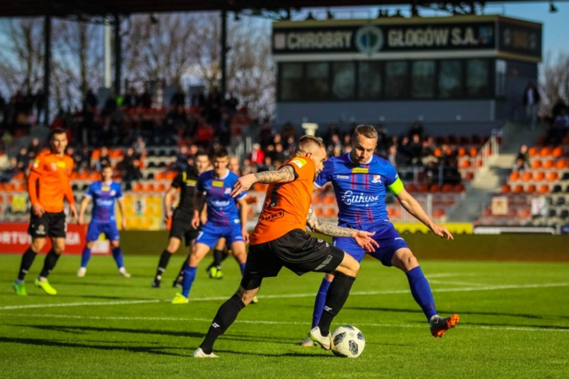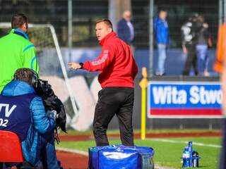 Chrobry z wartościowym punktem Pomimo mniej komfortowej sytuacji kadrowej Chrobry przedłużył serię meczów bez porażki. Po remisie 1:1 z Podbeskidziem Bielsko-Biała ma już sześć takich meczów na koncie. Wcześniej wydostał się ze strefy spadkowej, teraz… 10-11-2019 03:47 autor: ŁJ Pomimo mniej komfortowej sytuacji kadrowej Chrobry przedłużył serię meczów bez porażki. Po remisie 1:1 z Podbeskidziem Bielsko-Biała ma już sześć takich meczów na koncie. Wcześniej wydostał się ze strefy spadkowej, teraz minimalnie powiększa nad nią przewagę.Akurat na mecz z wiceliderem Chrobry trafił z dużymi kadrowymi brakami. Wcześniej było wiadomo, że nie zagrają ani Oliver Praznovsky, ani Miłosz Kozak, a już w trakcie gry doszły kolejne kłopoty w ofensywie. Kontuzji doznał Adrian Benedyczak i już w 17 minucie został zastąpiony przez Krzysztofa Kubicę.To miało wpływ na przebieg spotkania, w którym grę prowadzili goście i to oni mieli więcej okazji, ale żadna nie była na tyle groźna, aby padła z tego bramka. Już na początku niecelnie główkował Marko Roginic. Później niecelnie uderzali też Łukasz Sierpina, Adrian Rakowski i ponownie Roginic, kolejno w 11, 39 i 45 minucie.Pomarańczowo-czarni niewiele mieli. Starali się zrobić użytek ze stałych fragmentów. Po jednym z nich, w 20 minucie, zaskoczyć próbował Szymon Drewniak, lecz nie trafił w światło bramki. Po pierwszych 45 minutach mieliśmy remis.Źle zaczęła się druga połowa. W polu karnym faulował Łukasz Góra, a podyktowaną jedenastkę wykorzystał kapitan Podbeskidzia Łukasz Sierpina. Wobec kadrowych osłabień i ogółem większego zagrożenia ze strony gości wydawało się, że dalej może być już za ciężko. Głogowianie jednak nic sobie z tego nie zrobili. Nie minęło 120 sekund, a ruszyli z groźną kontrą, którą po podaniu Mikołaja Lebedyńskiego wykończył Michał Ilków-Gołąb. Wyrównanie dobrze podziałało na głogowskich piłkarzy, który odważniej poszli do przodu. Zabrakło jednak strzeleckich okazji. Te mieli goście, lecz po większości z nich futbolówka nie zmierzała w bramkę. Udało się to dopiero w 90 minucie. Już w doliczonym czasie Górale wykonywali rzut rożny jeden po drugim. Właśnie po tym drugim główkował Marko Roginic, ale koncentrację zachował Michał Szromnik, dobrze interweniował i przypieczętował swojej drużynie cenny punkt.Teraz przed Chrobrym dłuższa przerwa, bo planowany na 16 listopada mecz z Olimpią Grudziądz z powodu powołania do reprezentacji Polski Adriana Benedyczaka został przełożony na późniejszy termin. Najbliższym jest więc ten wyjazdowy z Bruk-Betem Termaliką Nieciecza - w sobotę 23 listopada.