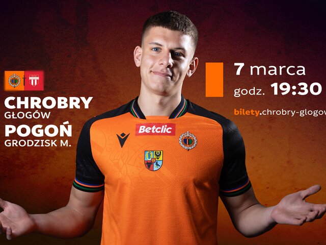 DZIEŃ MECZU: Chrobry Głogów - Stal Rzeszów Po trzech wyjazdach z rzędu przychodzi czas na mecz na własnym terenie - w sobotę o godz. 19.30 w spotkaniu 24. kolejki Betclic 1 Ligi piłkarze Chrobrego podejmą Pogoń Grodzisk Mazowiecki. 07-03-2026 12:03 autor: ŁJ DOWIEDZ SIĘ WIĘCEJ O NASZYM RYWALU: 06-03-2026 Nasz rywal: Pogoń Grodzisk Mazowiecki Chrobry podejmie sąsiada z ligowej tabeli - w sobotę o 19.30 mecz z trzecią i mającą tylko punkt więcej Pogonią Grodzisk Mazowiecki. Prezentjemy zbiór inform... BILETY: 26-02-2026 Chrobry Głogów - Pogoń Grodzisk Maz.: bilety Po wyjazdowej serii meczów w Łodzi, Legnicy i Wrocławiu, w sobotę 7 marca widzimy się na Wita Stwosza. O godz. 19.30 rozpocznie się mecz z Pogonią Grodzisk M... NAJWAŻNIEJSZE ORGANIZACYJNE INFORMACJE: 06-03-2026 Chrobry - Pogoń: organizacja dnia meczowego Najważniejsze organizacyjne informacje przed sobotnim meczem z Pogonią Grodzisk Mazowiecki (godz. 19.30).