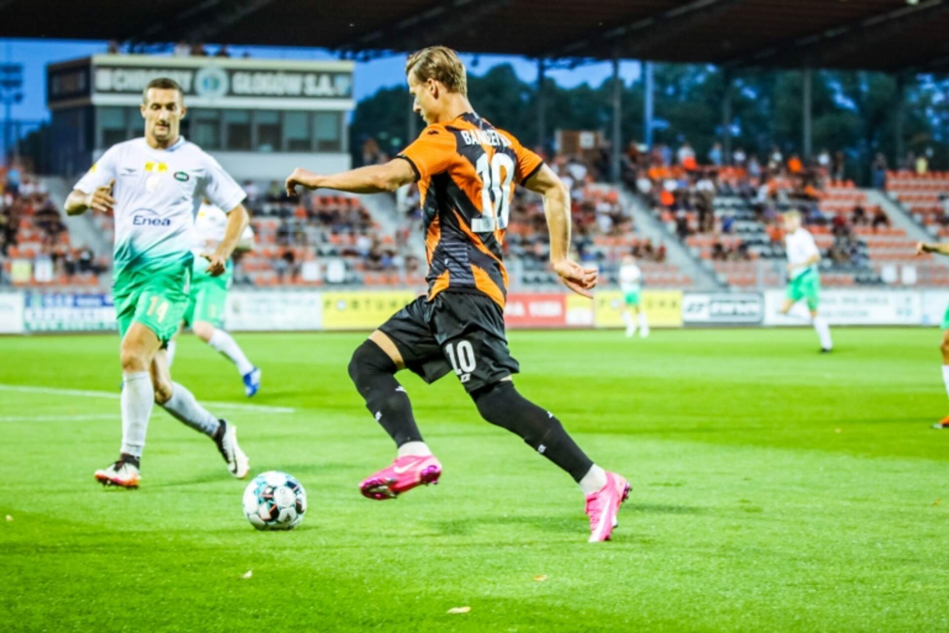 Emocje i nerwy przy WS3. Radomiak wywozi punkty Po meczu pełnym emocji i nerwów Chrobry kończący go w dziesięciu przegrał z Radomiakiem Radom 1:2. To pierwsza porażka głogowian w sezonie ligowym.Przed meczem mówiono, że Radomiak będzie jak na razie najbardziej wymagającym… 16-09-2020 10:52 autor: ŁJ Po meczu pełnym emocji i nerwów Chrobry kończący go w dziesięciu przegrał z Radomiakiem Radom 1:2. To pierwsza porażka głogowian w sezonie ligowym.Przed meczem mówiono, że Radomiak będzie jak na razie najbardziej wymagającym rywalem w lidze i to się szybko potwierdziło. Goście przycisnęli i nie pozwolili Chrobremu na częste wejścia na swoją połową, choć to głogowianie - przede wszystkim cierpliwie stopujący zapędy zespołu trenera Dariusza Banasika - jako pierwsi oddali groźne uderzenie. W 9 minucie po przejęciu piłki zza pola karnego przymierzył Damian Kowalczyk, ale przeszła ona tuż obok bramki.Z czasem jednak ofensywna inicjatywa Radomiaka przyniosła mu efekt. W 21 minucie po płaskim dograniu z prawej strony uderzeniem z pierwszej piłki Kacpra Bieszczada pokonał Karol Angielski. Młody golkiper Pomarańczowo-Czarnych był bez szans przy szybszym rozegraniu tej akcji.Prawa strona okazała się groźna w wykonaniu przeciwnika, bo po chwili w podobnej sytuacji Karol Angielski nie trafił w światło bramki.Chrobry przycisnął w końcówce. Wtedy próbowali Damian Kowalczyk i głową Oliver Praznovsky, ale w obu przypadkach golkiper radomian nie został zaskoczony.Chrobry świetnie wyszedł z szatni po przerwie. W 48 minucie po dośrodkowaniu rywale wybili piłkę, ale dopadł do niej Michał Ilków-Gołąb i pięknym uderzeniem zza szesnastki umieścił futbolówkę w środku.Mecz zaczął się na nowo i to było widać po drużynie trenera Ivana Djurdjevicia. W 66 minucie przed bardzo dobrą szansą po dokładnym przyjęciu trudnej piłki stanął starający się wyjść sam na sam Marcel Ziemann, lecz przymierzył obok bramki. 120 sekund później po akcji, której pęd nadał na boku Patryk Bryła, w ostatniej chwili przyblokowano strzelającego Maksymiliana Baneszewskiego.Ostatnie 20 minut to sporo nerwów i zarzutów w stronę sędziów. Posypały się też kartki. Dwie otrzymał wchodzący kilkanaście minut wcześniej Mikołaj Lebedyński, który na boisku spędził tylko 17 minut. Wydawało się, że mimo tego tak grający Chrobry utrzyma remis. Niestety, w 80 minucie za faul w polu karnym kolejną kartką ukarano Jarosława Ratajczaka, a podyktowaną jedenastkę wykorzystał Leandro.Pomarańczowo-Czarni do samego końca powalczyli i w ostatniej akcji, po rzucie rożnym, zmierzającą do bramki futbolówkę odbito kawałek przed linią... Na tym sędzia zakończył te pełne emocji zawody.Teraz tylko dwa dni przerwy, a właściwie przygotowań do kolejnego meczu. Już w sobotę o godz. 18.00 na stadionie przy Wita Stwosza Chrobry - GKS Jastrzębie.