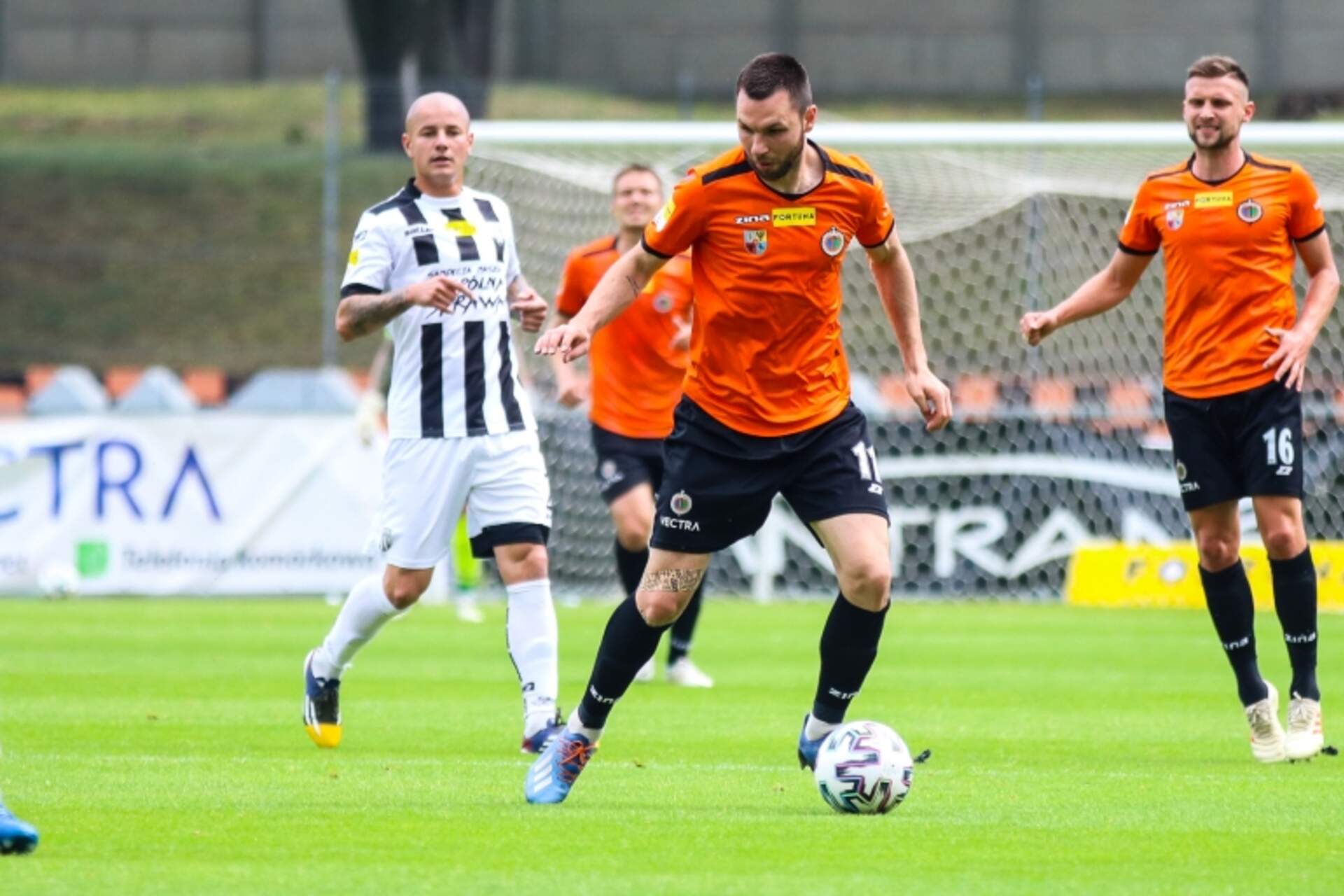 Gol równo z gwizdkiem końcowym! Komplet Chrobrego Stuprocentowy rewanż. W Nowym Sączu Chrobry przegrał po golu tuż przed końcem, teraz wygrywa po bramce zdobytej równo z gwizdkiem. Po wrzutce Damiana Piotrowskiego z rzutu rożnego i strzale Adriana Benedyczaka Chrobry pokonuje… 26-06-2020 07:08 autor: ŁJ Stuprocentowy rewanż. W Nowym Sączu Chrobry przegrał po golu tuż przed końcem, teraz wygrywa po bramce zdobytej równo z gwizdkiem. Po wrzutce Damiana Piotrowskiego z rzutu rożnego i strzale Adriana Benedyczaka Chrobry pokonuje Sandecję Nowy Sącz 1:0 i zdobywa upragnione trzy punkty.W pierwszej połowie nie działo się wiele. Z biegiem czasu zarysowała się przewaga optyczna rywali, którzy częściej przedostawali się pod pole karne. Chrobry może nie był pod nim tak często, ale jak już, to stworzył duże zagrożenie. W 10 minucie przedarł się z lewej strony Miłosz Kozak i dograł do będącego w szesnastce Adriana Benedyczaka. Napastnik Chrobrego uderzył wysoko, lecz niecelnie.Mało brakowało, a ta optyczna przewaga w końcówce przyniosłaby korzyść Sandecji. Pomarańczowo-czarni stracili piłkę na własnej połowie, a tę po chwili uderzono z dystansu na bramkę Michała Szromnika. Na szczęście - również niecelnie, choć było jeszcze bliżej celu.Druga połowa nie zaczęła się dla Chrobrego najlepiej. Goście przenieśli swoją przewagę na kolejne 45 minut i Michał Szromnik dwukrotnie wybronił zespół przed stratą gola. W 51 minucie po uderzeniu z bliska i 10 minut później, gdy Damian Chmiel strzelał z rzutu wolnego. Z czasem jednak głogowianie jakby lepiej zaczęli znosić trudy tej rywalizacji przy wysokiej temperaturze. Stopniowo ją wyrównali i następnie przechylali na swoją stronę. W 77 minucie mogło przynieść to efekt. Po dograniu od Adriana Benedyczaka, dający dobrą zmianę Maksymilian Banaszewski trafił w poprzeczkę. W 79 minucie kolejna okazja Chrobrego, znów z udziałem Benedyczaka, którą obronionym przez Daniela Bielicę strzałem kończył Miłosz Kozak. Zaczęło brakować naprawdę niewiele. I choć te zapędy jakby opadły ostatni moment meczu należał do Pomarańczowo-Czarnych. Wyczuciem wykazał się trener Ivan Djurdjević posyłając do gry Damiana Piotrowskiego. To właśnie on w 93 minucie ustawiał futbolówkę w narożniku. Po jego dośrodkowaniu do środka z bliska trafił Adrian Benedyczak. Utonął w objęciach kolegów i nic dziwnego, dawno nie było tak ważnej i tak potrzebnej bramki.Następny tydzień znów będzie intensywny, bo z dwoma wyjazdowymi meczami. Najbliższy we wtorek o godz. 17.40 w Grodzisku Wielkopolskim z Wartą Poznań. Natomiast w piątek 3 lipca o godz. 20.10 spotkanie w Sosnowcu.
