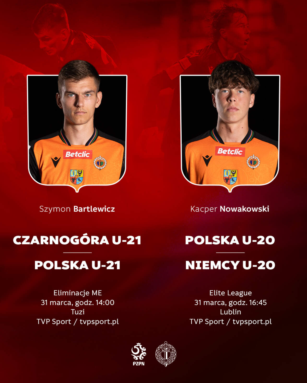 Dziś mecze kadry z naszymi zawodnikami Dziś kolejne mecze Biało-Czerwonych i szansa na występy w narodowych barwach Szymona Bartlewicza oraz Kacpra Nowakowskiego. Kadra U-21 zagra na wyjeździe z Czarnogórą, a reprezentacja U-20 z Niemcami. 31-03-2026 08:27 autor: ŁJ Bartlewicz ma szansę wystąpić w meczu eliminacji mistrzostw Europy U-21, w którym Polska zmierzy się z Czarnogórą w Tuzi. To spotkanie odbędzie się jako pierwsze - już o godz. 14.00. Z kolei Nowakowski znajdujący się w kadrze Polski U-20 szykuje się na spotkanie Elite League przeciwko Niemcom (godz. 16:45, Lublin). Oba mecze będą transmitowane na antenie TVP Sport oraz na stronie tvpsport.pl. Harmonogram występów: Szymon Bartlewicz Eliminacje ME U-2131 marca14:00TuziTransmisja: TVP Sport / tvpsport.pl Kacper Nowakowski Elite League31 marca16:45LublinTransmisja: TVP Sport / tvpsport.pl