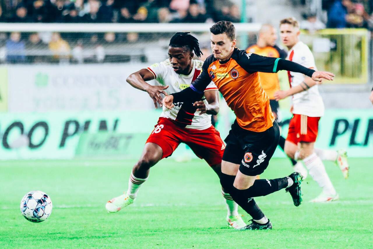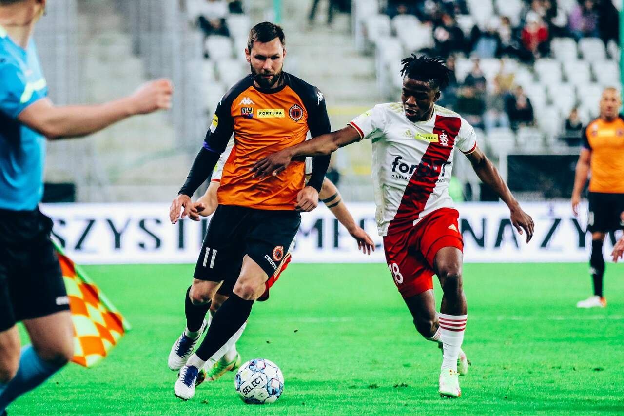 CHROBRY ZDOBYWA STADION ŁKS-U Chrobry najpierw przeczekał, następie zbudował przewagę i konsekwentnie wyczekał na ten moment. 22-04-2022 10:30 autor: ŁJ W sposób do zapamiętania na długo Chrobry wygrał z ŁKS-em Łódź 1:0. Po bardzo ładnej akcji i bramce Jaki Kolenca Pomarańczowo-Czarni punktują za trzy na nowootwartym stadionie ŁKS-u! Atmosfera udzielająca się wobec otwarcie stadionu, kilkanaście tysięcy kibiców, koncerty, występy i inne zaplanowane wydarzenia w pierwszej połowie niosły gospodarzy, którzy byli bliżej zdobycia bramki. W 16 minucie wywalczyli rzut wolny, po którym Antonio Dominguez trafił w słupek. Za tym poszły inne okazje. W tym okresie Chrobry miał trudniejszy moment, bo groźnie uderzał jeszcze Maciej Dąbrowski. W 28 minucie ŁKS cieszył się z objęcia prowadzenia, lecz tylko przez moment. Piłkę w bramce po płaskim dograniu Bartosza Szeligi umieścił Ricardinho, jednak sędziowie zareagowali szybko i wskazali pozycję spaloną u zawodnika łodzian. Pierwsza część zakończyła się na bezbramkowym remisie. Chrobry nie miał w tej odsłonie wielu szans. Raz tylko Michał Rzuchowski zdecydował się na strzał zza szesnastki, jednak futbolówka poszybowała nad poprzeczką. Po zmianie stron sytuacja zaczęła się zmieniać. W pierwszych minutach co prawda ŁKS miał kolejną dobrą szansą, gdy bliski zamknięcia akcji był nabiegający na futbolówkę Ricardinho, ale potem do głosu coraz odważniej zaczęli dochodzić głogowianie. W 66 minucie po podaniu Michała Rzuchowskiego miejsca w obrębie pola karnego poszukał Mateusz Bochnak i po jego uderzeniu gospodarzy uratował słupek. Po kilku kolejnych minutach przed świetną szansą stanął Robert Mandrysz, który głową próbował wykończyć podaniową akcję zainicjowaną przez Marcela Ziemanna z Jaki Kolencem. Niestety, golkiper ŁKS-u był na posterunku. Miejscowi coraz bardziej byli tłem, natomiast Chrobry konsekwentnie budował coraz większą przewagę i za to został nagrodzony w 87 minucie. Pomarańczowo-Czarni wręcz rozklepali defensywę rywali, a egzekutorem okazał się Jaka Kolenc. Rozgrywający dobrą połowę zespół trenera Ivana Djurdjevicia już tego nie oddał. Po meczu w Łodzi nie ma dużo czasu na przygotowanie do kolejnego. We wtorek o godz. 18.00 na stadionie w Głogowie spotkanie z Resovią Rzeszów.