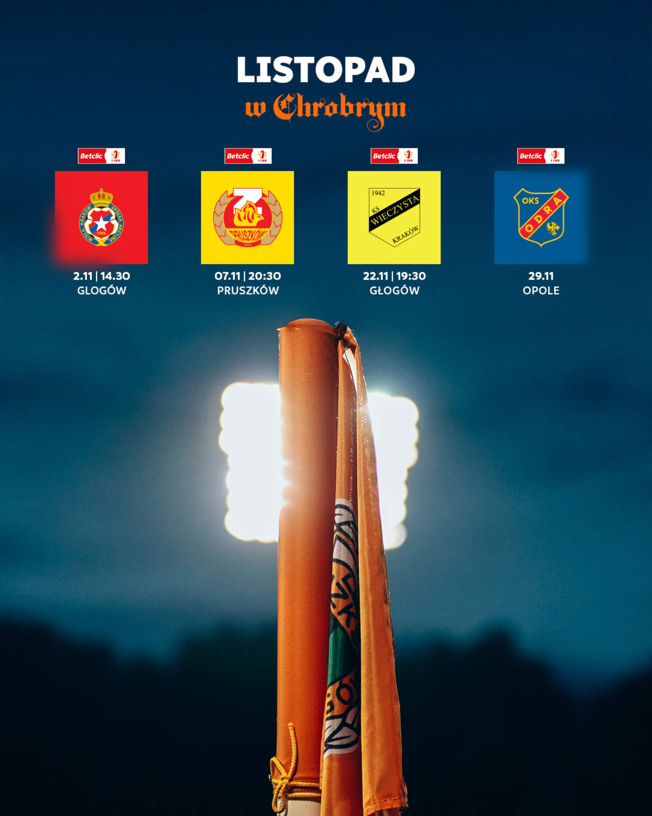 Listopad w Chrobrym Dzień dobry w listopadzie. To przedostatni piłkarski miesiąc tego roku, ale za to jaki! W nim dwa razy na wyjeździe i dwa razy u siebie - i to z czołówką, bo w Głogowie zagoszczą Wisła Kraków oraz Wieczysta Kraków. 01-11-2025 02:13 autor: ŁJ Niedziela, 2 listopada 14.30 Chrobry Głogów - Wisła Kraków (Głogów, Betclic 1 Liga) Piątek, 7 listopada 20.30 Znicz Pruszków - Chrobry Głogów (Pruszków, Betclic 1 Liga) Sobota, 22 listopada 19.30 Chrobry Głogów - Wieczysta Kraków (Głogów, Betclic 1 Liga) Sobota, 29 listopada Odra Opole - Chrobry Głogów (Opole, Betclic 1 Liga)* *dokładny termin zostanie wyznaczony przez Departament Rozgrywek Krajowych PZPN