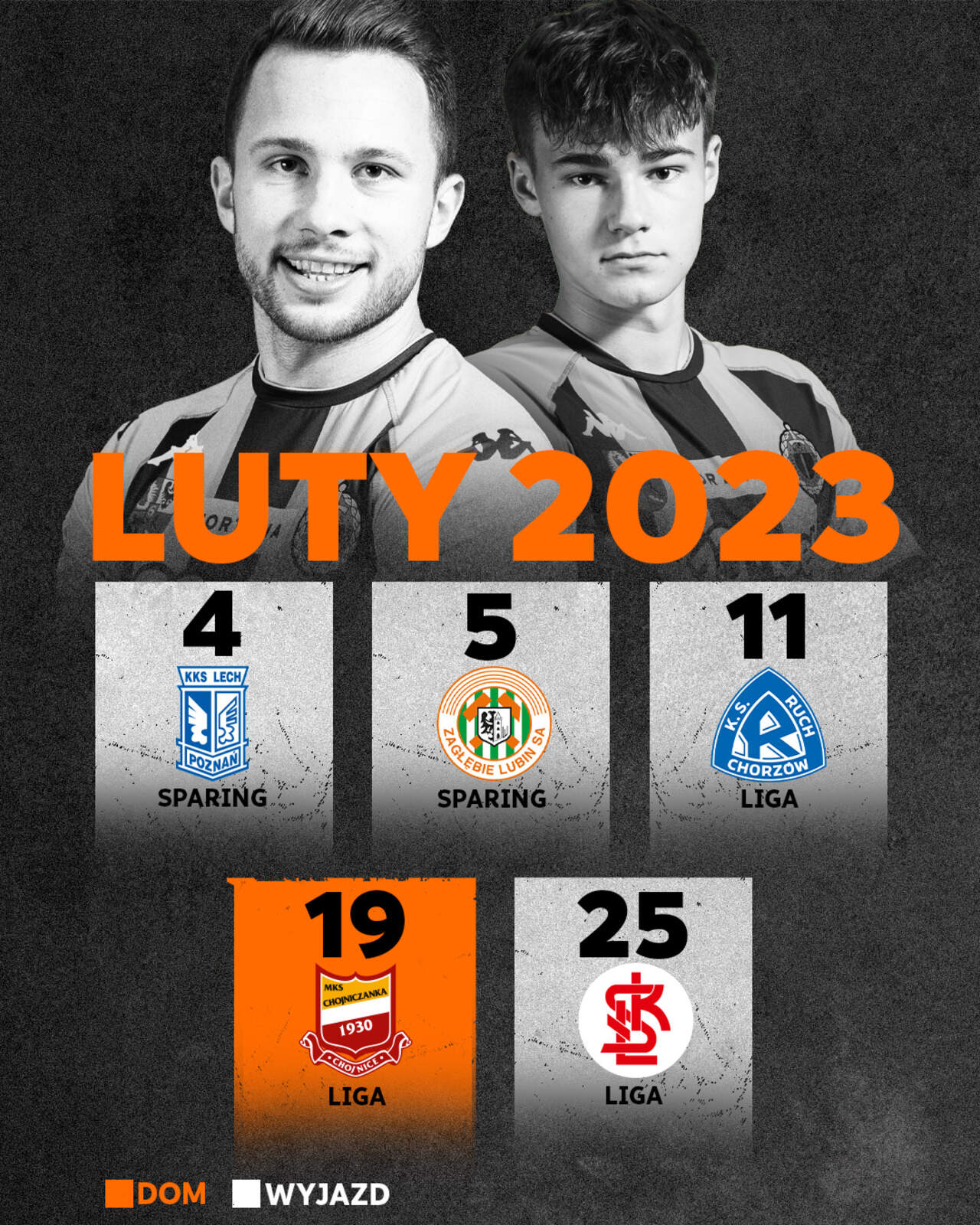 Miesiąc ligowy! Dwa sparingi, trzy o stawkę W lutym nastąpi powrót do gry o stawkę. Miesiąc zaczynamy sparingami, a potem już tylko liga. 02-02-2023 12:14 autor: ŁJ Luty pierwszym w toku roku ligowym miesiącem. Zanim jednak Chrobry wróci na pierwszoligowe stadiony, rozegra jeszcze dwa sparingi. Włącznie w nimi, w tym miesiącu zaplanowano pięć spotkań. Po weekendowych grach kontrolnych z Lechem II Poznań i Zagłębiem Lubin, głogowianie w sobotę 11 lutego w Gliwicach podczas meczu z Ruchem Chorzów zainaugurują rundę wiosenną w Fortuna 1 Lidze. Po kolejnych ośmiu dniach nastąpi wyczekiwany powrót na Wita Stwosza na pojedynek z Chojniczanką Chojnice, a koniec miesiąca to kolejne mocne uderzenie i wyjazdowa rywalizacja z aktualnym liderem – ŁKS-em Łódź. Luty w Chrobrym: 03.02.2023 (PT), G. 18.00: XV Prezentacja Chrobrego 04.02.2023 (SB), G. 14.00: Chrobry Głogów – Lech II Poznań (sparing, miejsce do ustalenia) 05.02.2023 (ND), G. 11.00: Zagłębie Lubin - Chrobry Głogów (sparing, miejsce do ustalenia) 11.02.2023 (SB), G. 17.30: Ruch Chorzów – Chrobry Głogów (Fortuna 1 Liga, Gliwice) 19.02.2023 (ND), G. 18.00: Chrobry Głogów – Chojniczanka Chojnice (Fortuna 1 Liga, Głogów) 25.02.2023 (SB), G. 20.00: ŁKS Łódź – Chrobry Głogów (Fortuna 1 Liga, Łódź)