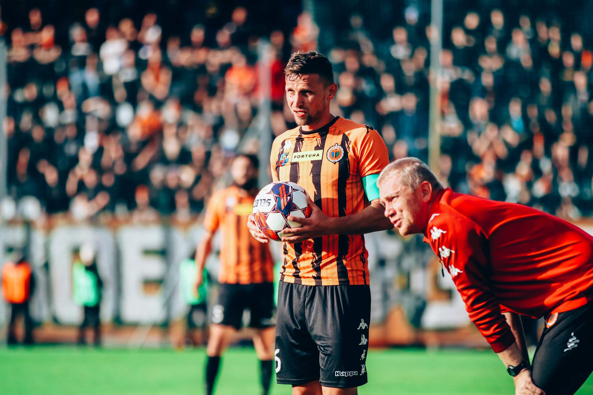 Cenny, bo derbowy punkt Po meczu wypełnionym walką Chrobry zdobywa punkt w derbowym starciu z Miedzią Legnica. Bohaterem doliczonego czasu gry został Damian Węglarz dwukrotnie stopujący rywali przed prowadzeniem. 30-09-2023 05:14 autor: ŁJ Już w pierwszych minutach w tym meczu działo się dużo. W 2 minucie przed szansą stanęli gospodarze, ale Marcel Mansfeld uderzył niecelnie. 120 sekund później odpowiedział Chrobry, tyle że skutecznie. Piłkę w pole karne posłał z lewej strony Dawid Hanc, a to wykończył nie kto inny, jak będący w wysokiej dyspozycji strzeleckiej Mikołaj Lebedyński. Głogowianie szybko objęli więc prowadzenie i ani myśleli go oddać, skutecznie broniąc dostępu do własnej bramki, dodatkowo mając przy tym szansę Bartosza Biela. Korzystny dla Chrobrego wynik utrzymał się do przerwy, ale po niej Miedź dość wyraźnie przejęła inicjatywę. Zanim jednak, mogło być… 0:2. W 51 minucie na bezpośredni strzał z rzutu wolnego, mimo ostrego kąta, zdecydował się Patryk Mucha, lecz golkiper legniczan przerzucił futbolówkę ponad poprzeczką. W 55 minucie zrobiło się jednak 1:1. Po dośrodkowaniu Damiana Węglarza pokonał Marcel Mansfeld. Po tym wszystkie emocje przeniosły się na doliczony czas gry. Drugą żółtą kartkę obejrzał wtedy Kamil Wojtyra i Chrobry dogrywał w dziesięciu. Chwilę przed tym gospodarze stanęli przed świetną szansę, ale kapitalnie po strzale Krzysztofa Drzazgi interweniował Damian Węglarz, odbijając piłkę na rzut rożny. A moment po czerwonej, znów na pierwszy plan wysunął się głogowski golkiper, którego pokonać starali się i Nemanja Mijuskovic i Patryk Pierzak. Nic z tego, Damian Węglarz zachował zimną krew i zapewnił Pomarańczowo-Czarnym cenny punkt. Następny mecz już w piątek 6 października. Na stadionie przy Wita Stwosza Pomarańczowo-Czarni podejmą były klub trenera Piotra Plewni - Odrę Opole. Początek o godz. 18.00.