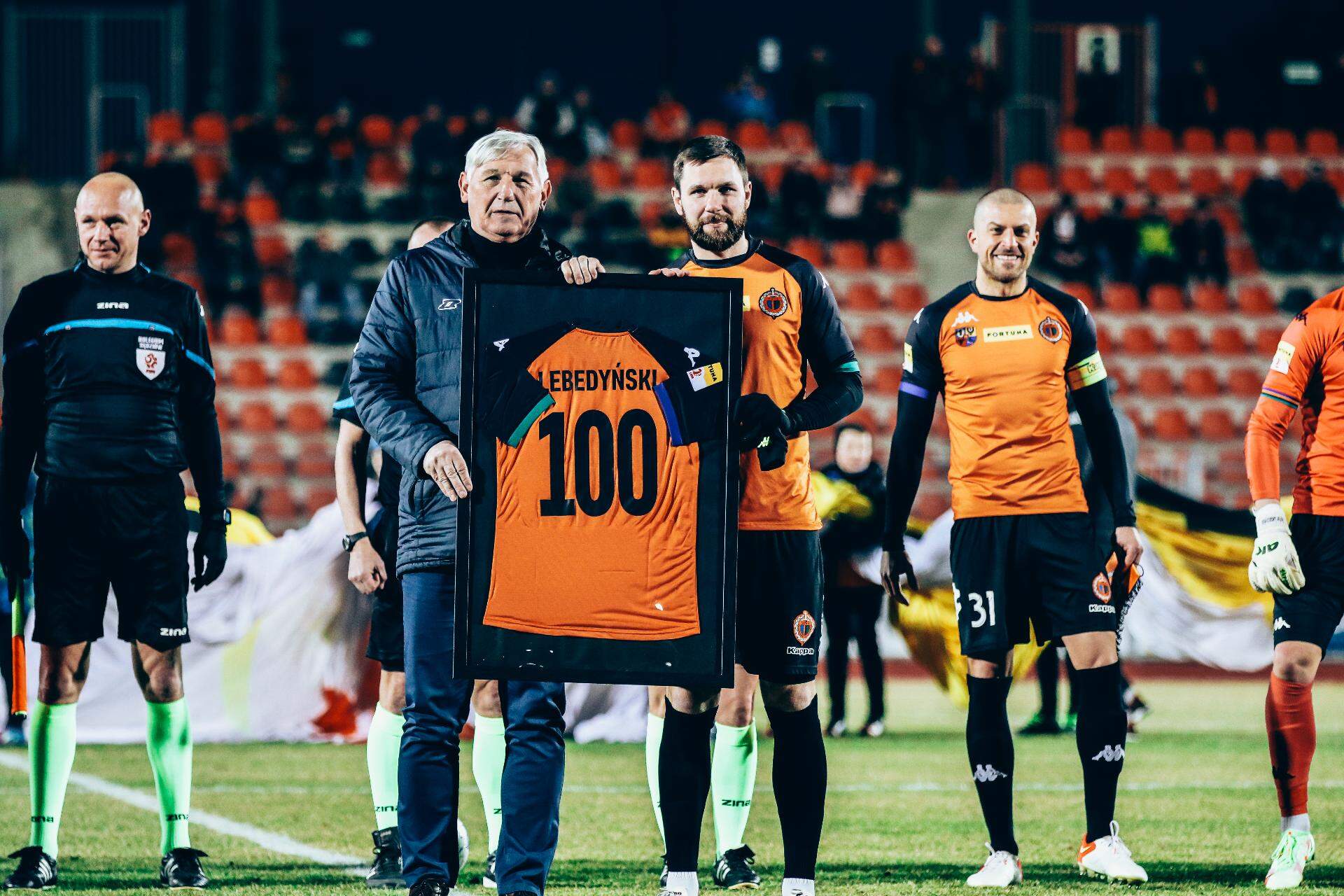 Mikołaj Lebedyński z ponad setką występów Mikołaj Lebedyński dołączył do grona zawodników, którzy dla Chrobrego rozegrali ponad 100 spotkań. Setny występ „Miekiego” miał miejsce przed tygodniem, a teraz była okazja do wręczenia mu pamiątkowej koszulki z numerem 100. 07-03-2022 08:00 autor: ŁJ Mikołaj Lebedyński dołączył do grona zawodników, którzy dla Chrobrego rozegrali ponad 100 spotkań. Setny występ „Miekiego” miał miejsce przed tygodniem, a teraz była okazja do wręczenia mu pamiątkowej koszulki z numerem 100. Mikołaj Lebedyński zaczyna ten rok z dużą sympatią ze strony kibiców. Czołowy strzelec Pomarańczowo-Czarnych najpierw zdecydował się na przedłużenie kontraktu z klubem, a na inaugurację wyszedł po raz setny w klubowych barwach, zdobył bramkę i Chrobry wygrał 2:0. Ten gol było jego 24. odkąd przeszedł do Chrobrego. Ta setka świadczy o większym przywiązaniu do miejsca i klubu, bo Mikołaj jest w Chrobrym już ponad dwa lata i zarazem jest piątym piłkarzem obecnej kadry, który ma przynajmniej 100 rozegranych spotkań. Rekordzistą pozostaje Michał Michalec z 279 występami. 249 ma ich Michał Ilków-Gołąb, a poza nimi są jeszcze Mateusz Machaj oraz Robert Mandrysz. 279 - Michał Michalec (20 bramek) 249 - Michał Ilków-Gołąb (38) 165 - Mateusz Machaj (49) 134 - Robert Mandrysz (5) 101 - Mikołaj Lebedyński (24)
