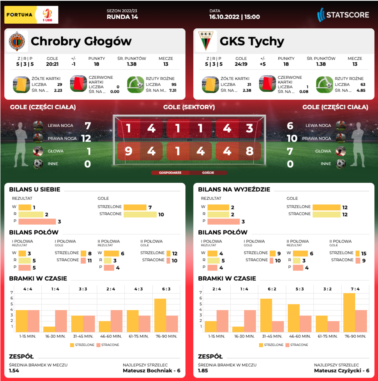 ND. 15.00: Chrobry Głogów - GKS Tychy Już dziś o godz. 15.00 na stadionie przy Wita Stwosza Chrobry zmierzy się z GKS-em Tychy. 16-10-2022 12:05 autor: ŁJ Mecz 14 kolejki stanowi dla Chrobrego dużą szansę, bo w przypadku zwycięstwa głogowianie przeskoczą w tabeli nie tylko GKS Tychy, ale mogą też kilka innych rywali, awansując nawet do pierwszej siódemki. Na razie jednak przystąpią do tego spotkania z 12 pozycji. Tyszanie zamykają dziesiątkę i mają w swoim dorobku tyle samo punktów. Przewaga GKS-u w tabeli, mimo identycznej liczby punktów, wynika z innych statystyk. Choć ofensywa jest w tym sezonie mocnym punktem Chrobrego, a 20 strzelonych bramek to rezultat na miarę czołówki, liderem pod tym względem jest właśnie GKS. Zespół trenera Dominika Nowaka zdobył do tej pory 24 gole, a strzelecką formę potwierdził w ostatniej kolejce, w której pokonał Skrę Częstochowa 5:0. 13-10-2022 Zanosi się na widowisko. Przed GKS-em Tychy Już w niedzielę o godz. 15.00 w Głogowie mecz jednym z najbardziej bramkostrzelnych zespołów w Fortuna 1 Lidze. Chrobry gra z GKS-em Tychy i przynajmniej w t... Głogowska defensywa będzie musiała przeciwstawić się sile rażenia GKS-u w osłabieniu. Trener Marek Gołębiewski nie będzie mógł skorzystać z Michała Michalca, który po czwartej żółtej kartce otrzymanej w Katowicach w tej kolejce musi pauzować. Być może do podstawowej „11” powróci Oliver Praznovsky. Z drugiej strony przeciwnicy poza tym, że dużo strzelają, sporo też tracą – po 13 kolejkach stracili 19 goli przy 21 Pomarańczowo-Czarnych. Chęć wykorzystania tego może mieć Sebastian Steblecki, który w ostatnich sezonach grał w GKS-ie, a zwykle coś w tym jest, że na pojedynek z byłym klubem motywować specjalnie nie trzeba. Bilety na mecz do momentu rozpoczęcia spotkania dostępne są na bilety.chrobry-glogow.pl (bilety ulgowe 7 zł / bilety normalne 15 zł) i do godziny przed rozpoczęciem spotkania w kasach pływalni Chrobry (bilety ulgowe 10 zł / bilety normalne 20 zł). Kasa stadionu otwarta zostanie na godzinę przed meczem, a w niej bilety będą w cenach: ulgowe 15 zł / normalne 25 zł. Dzieci do 7 roku życia na stadion wchodzą za darmo. Transmisja z meczu w Polsat Box Go. Możesz też aktywować jednorazowy dostęp do meczu - PRZEJDŹ DO STRONY TRANSMISJI O KLUBIE Pełna nazwa: Klub Piłkarski GKS Tychy Spółka Akcyjna Rok powstania: 1971 Adres: ul. Edukacji 7, 43-100 Tychy Internet: www.gkstychy.info (oficj.) Barwy: zielono-czarno-czerwone Sukcesy: wicemistrzostwo Polski - 1975/76 1/4 finału Pucharu Polski - 1976/77, 2019/20 Stadion: - Stadion Miejski Tychy - 15 150 miejsc siedzących - oświetlenie: 2000 lx Bramkarze: Kacper Dana (01), Konrad Jałocha (91), Adrian Odyjewski (97), Adrian Kostrzewski (98). Obrońcy: Petr Buchta (92), Krzysztof Machowski (03), Maciej Mańka (89), Nemanja Nedic (95), Konrad Pipia (99), Kamil Szymura (90), Bartosz Zarębski (03). Pomocnicy: Aleksander Biegański (00), Jan Biegański (02), Mateusz Czyżycki (98), Antonio Dominguez (93), Natan Dzięgielewski (04), Kamil Kargulewicz (00), Marcin Kozina (01), Dorian Orliński (04), Miłosz Pawlusiński (04), Michał Ploch (04), Dominik Połap (99), Mateusz Radecki (93), Krzysztof Wołkowicz (94), Wiktor Żytek (94). Napastnicy: Gracjan Jaroch (98), Tomas Malec (93), Patryk Mikita (93), Daniel Rumin (97). Trener: Dominik Nowak.