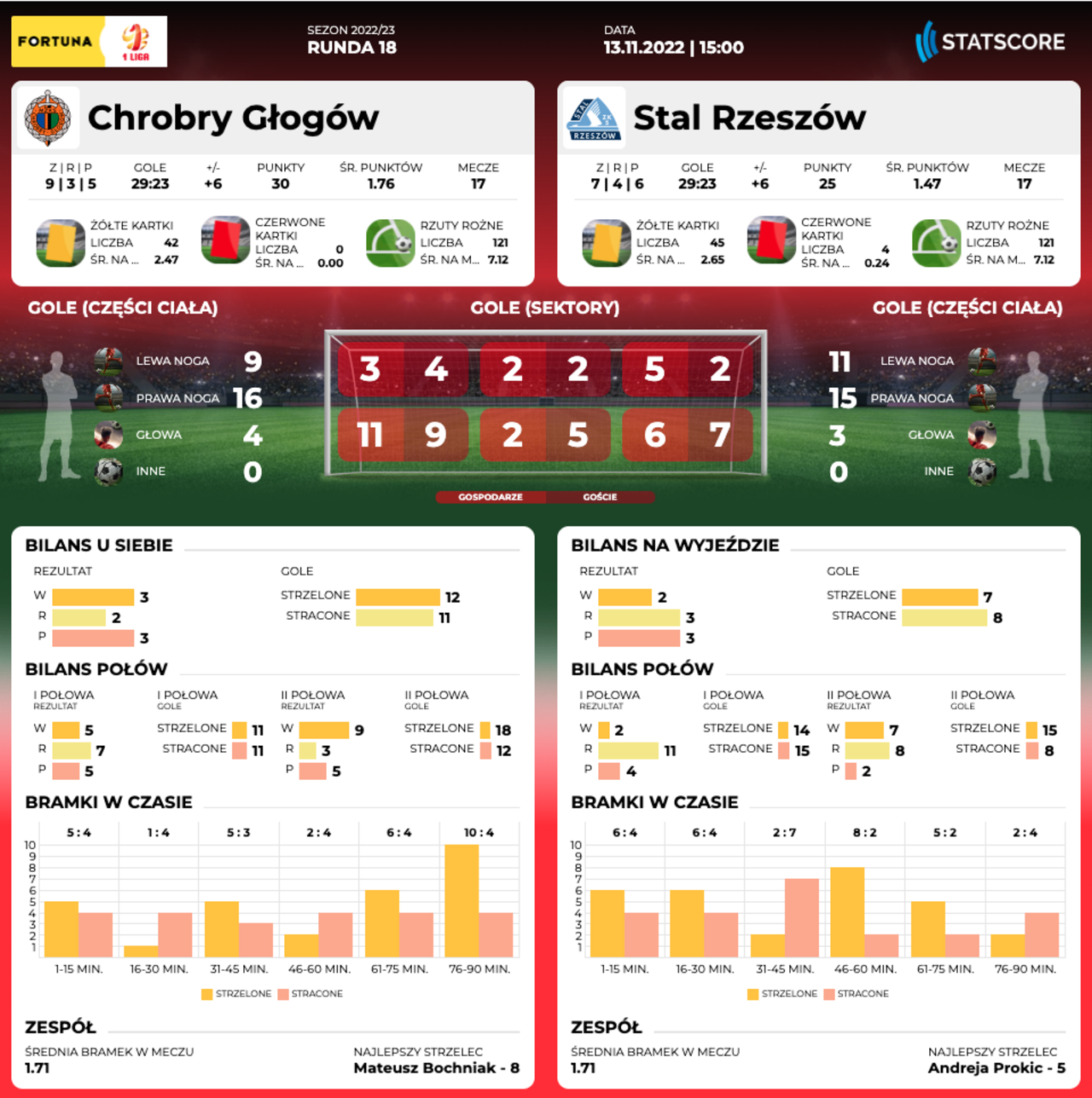 ND. 15.00: Chrobry Głogów - Stal Rzeszów Tym meczem Chrobry zakończy piłkarski rok 2022. O godz. 15.00 na Wita Stwosza początek spotkania 18 kolejki Fortuna 1 Ligi ze Stalą Rzeszów. 13-11-2022 12:05 autor: ŁJ Rok, który był bardzo dobry dla Chrobrego, zaczął się od domowego zwycięstwa z Górnikiem Polkowice 2:0. Pomarańczowo-Czarni na swoim stadionie nie tylko rozpoczęli ten okres, ale też go kończą, a kolejna wygrana byłaby świetną puentą tych kilku miesięcy. O jej odniesienie będzie jednak ciężko, bo choć Stal Rzeszów jest niżej w tabeli - na dziewiątym miejscu - to prezentuje ofensywny styl i można się spodziewać, że w Głogowie zaatakuje. Ostatnia taka wymiana ciosów pomiędzy Chrobrym a Stalą z początku sezonu zakończyła się efektownym remisem 3:3, więc ciekawe, co przyniesie ostatnia w tym roku ligowa niedziela. Dobrą w tym przypadku wiadomością jest powrót kartkowiczów, bo choć w ostatniej kolejce zespół zachował czyste konto, linia obrony wobec braku czterech defensorów wystąpiła w dosyć eksperymentalnym składzie. Teraz do tej formacji może wrócić dwóch z nich: Mavroudis Bougaidis oraz Jakub Kuzdra. 11-11-2022 Nasz rywal: Stal Rzeszów. Najtrudniejszy spośród ostatnich? Chrobry wygrał cztery ostatnie ligowe mecze, rywalizując zarówno z zespołami z dołu tabeli, jak i z samej góry. Jesień zakończy spotkaniem z dziewiątą Stalą... Mecz ze Stalą jest zarazem pierwszym z rundy rewanżowej. Jej ciąg dalszy nastąpi dopiero w lutym, ale już teraz wiadomo, że do tamtego okresu Chrobry nie zejdzie poniżej czwartego miejsca i przezimuje na najwyższej pozycji, odkąd jest w 1 Lidze. Wszystko z powodu już zakończonych spotkań 18 kolejki. Mogące wyprzedzić głogowian Arka Gdynia z GKS-em Katowice nie wygrały swoich meczów, więc w tabeli pozostaną za Chrobrym. Czwartym Chrobry, lecz mogącym być jeszcze wyżej. Na teraz do ugrania jest trzecia lokata. Bilety na mecz do momentu rozpoczęcia spotkania dostępne są na bilety.chrobry-glogow.pl (bilety ulgowe 7 zł / bilety normalne 15 zł) i do godziny przed rozpoczęciem spotkania w kasach pływalni Chrobry (bilety ulgowe 10 zł / bilety normalne 20 zł). Kasa stadionu otwarta zostanie na godzinę przed meczem, a w niej bilety będą w cenach: ulgowe 15 zł / normalne 25 zł. Dzieci do 7 roku życia na stadion wchodzą za darmo. Transmisja z meczu w Polsat Box Go. Możesz też aktywować jednorazowy dostęp do meczu - PRZEJDŹ DO STRONY TRANSMISJI O KLUBIE Pełna nazwa: Stal Rzeszów Spółka Akcyjna Rok powstania: 1944 Adres: Hetmańska 69, 35-078 Rzeszów Internet: www.stalrzeszow.pl (oficj.) Barwy: biało-niebieskie Sukcesy: - 7. miejsce w I lidze - 1965/66 - Puchar Polski - 1974/75 Stadion: - Stadion Miejski - pojemność - 12 700 miejsc siedzących - oświetlenie - - boisko - 104 m x 64 m Bramkarze: Gerard Bieszczad (93), Wiktor Kaczorowski (01), Przemysław Pęksa (02). Obrońcy: Łukasz Góra (93), Dominik Marczuk (03), Ramil Mustafaev (03), Paweł Ofiara (04), Paweł Oleksy (91), Kamil Pajnowski (98), Kacper Paśko (04), Krystian Wrona (93). Pomocnicy: Krzysztof Danielewicz (91), Piotr Głowacki (91), Miłosz Kaczor (04), Wiktor Kłos (00), Marcel Kotwica (91), Igor Ławrynowicz (03), Patryk Małecki (88), Damian Michali (92), Dawid Olejarka (01), Michał Opalski (04), Kacper Piątek (00), Benedykt Piotrowski (05), Bartłomiej Poczobut (93), Franciszek Polowiec (03), Andreja Prokic (89), Jakub Szczypek (00), Bartosz Wolski (97). Napastnicy: Kacper Sadłocha (02). Trener: Daniel Myśliwiec.