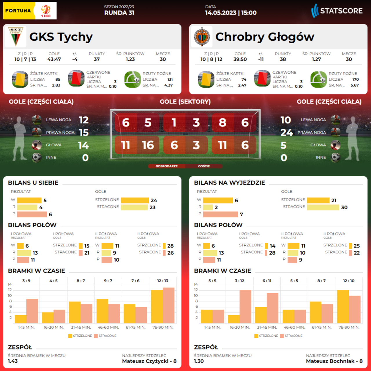 ND. 15.00: GKS Tychy - Chrobry Głogów Po raz przedostatni w tym sezonie na wyjeździe. W niedzielę o godz. 15.00 w Tychach rozpocznie się mecz z GKS-em. 13-05-2023 09:01 autor: ŁJ Objęcie 9 pozycji będzie stawką pojedynku Chrobrego z GKS-em. Na ten moment, po rozegraniu części spotkań, zespoły są obok siebie, kolejno na 11 i 12 pozycji. Zwycięzca zyska podwójnie, nie tylko 9 miejsce, ale przede wszystkim pełen spokój przez trzy ostatnie kolejki. Zarówno 41 punktów w przypadku Chrobrego i 40 w przypadku tyszan będzie oznaczało pewnie utrzymanie w Fortuna 1 Lidze. O tę czwórkę z przodu obie drużyny muszą powalczyć na boisku. 13-05-2023 Nasz rywal: GKS Tychy To już przedostatni wyjazd głogowskiej drużyny w tym sezonie. W niedzielę o godz. 15.00 na stadionie w Tychach rozpocznie się mecz z GKS-em. Przed tym meczem w korzystniejszej sytuacji w tabeli jest Chrobry, choć trochę lepsze nastroje mogą mieć w Tychach. GKS jest po dwóch zwycięstwach z rzędu i to jego pierwsza taka mini-seria składająca się z dwóch wygranych od sierpnia ubiegłego roku. Pod tym względem głogowianie nie trafiają najszczęśliwiej, ale mimo niedawnej porażki w Opolu, cały czas mają dobry bilans z rywalami drugiej części tabeli. Nawet w rundzie, podczas której nie idzie, Pomarańczowo-Czarni punktowali w starciach z GKS-em Katowice, Sandecją, Zagłębiem, Resovią czy Chojniczanką. Teraz postarają się to potwierdzić w Tychach i poczynili ku temu kroki, w ostatnich tygodniach poprawiając defensywę (jeden stracony gol w dwóch minionych dwóch kolejkach). Czas na ofensywę. Transmisja z meczu w Polsat Box Go. Możesz też aktywować jednorazowy dostęp do meczu - PRZEJDŹ DO STRONY TRANSMISJI O KLUBIE Pełna nazwa: Klub Piłkarski GKS Tychy Spółka Akcyjna Rok powstania: 1971 Adres: ul. Edukacji 7, 43-100 Tychy Internet: www.gkstychy.info (oficj.) Barwy: zielono-czarno-czerwone Sukcesy: wicemistrzostwo Polski - 1975/76 1/4 finału Pucharu Polski - 1976/77, 2019/20 Stadion: - Stadion Miejski Tychy - 15 150 miejsc siedzących - oświetlenie: 2000 lx Bramkarze: Kacper Dana (01), Konrad Jałocha (91), Adrian Kostrzewski (98), Adrian Odyjewski (97). Obrońcy: Petr Buchta (92), Krzysztof Machowski (03), Maciej Mańka (89), Nemanja Nedic (95), Konrad Pipia (99), Kamil Szymura (90), Jakub Tecław (99), Krzysztof Wołkowicz (94), Bartosz Zarębski (03). Pomocnicy: Aleksander Biegański (00), Jan Biegański (02), Mateusz Czyżycki (98), Antonio Dominguez (93), Natan Dzięgielewski (04), Marcin Kozina (01), Mikołaj Oleksy (05), Dorian Orliński (04), Miłosz Pawlusiński (04), Michał Ploch (04), Dominik Połap (99), Mateusz Radecki (93), Kacper Skibicki (01), Radosław Tuleja (03), Wiktor Żytek (94). Napastnicy: Patryk Mikita (93), Daniel Rumin (97). Trener: Dariusz Banasik.