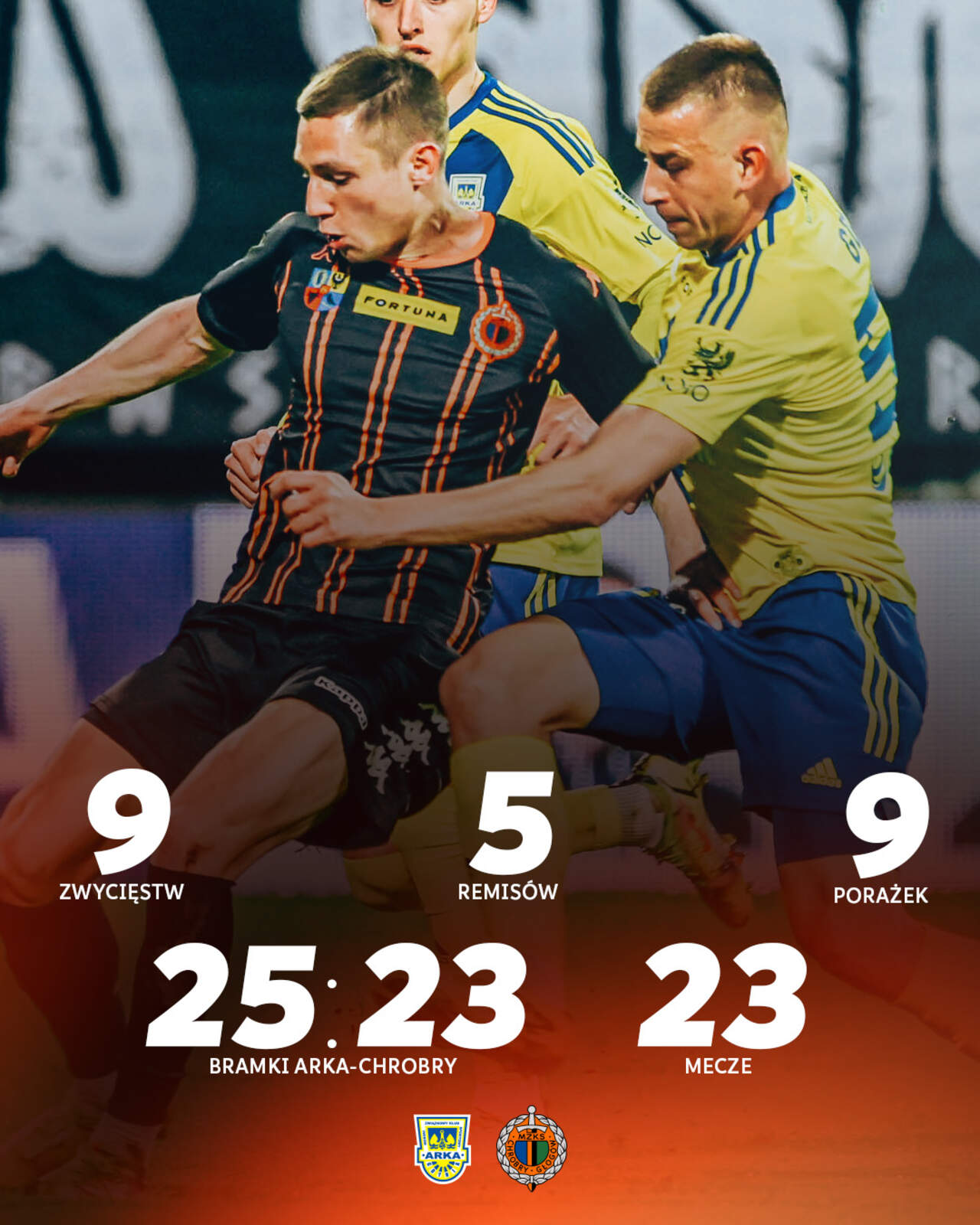 Nasz rywal: Arka Gdynia Po wyjazdowej wygranej ze Zniczem Pruszków czas na Gdynię. Przed niedzielnym meczem sprawdzamy, co słychać w Arce. 28-09-2024 11:15 autor: ŁJ Na fali wznoszącej Za Arką trudny sezon, z wymknięciem się awansu na samym finiszu i porażką z Motorem Lublin w barażach po golach w 87 i 90 minucie. Musiało zaboleć i być może na to wskazywał początek tej edycji rozgrywek. Na siedem pierwszych spotkań gdynianie wygrali w dwóch. W klubie zdecydowano się nawet na zmianę trenera. Teraz „Arkowcy” są na fali wznoszącej. Trzy ostatnie ligowe kolejki zakończyli z bilansem 9 punktów i bramkowym 8:1. Awansowali też w Pucharze Polski, po rzutach karnych eliminując Stal Stalową Wola. W tabeli Arka jest czwarta z dorobkiem 18 punktów. Trener tymczasowo czy na dłużej? Po tym, jak rozstano się z trenerem Wojciechem Łobodzińskim, tę rolę powierzono jego asystentowi Wojciechowi Grzegorczykowi. Zaznaczono, że funkcję szkoleniowca przejmuje tymczasowo, jednak z drugiej strony za nim trzy mecze z kompletem punktów i awans w PP, więc naturalnie padają pytania o dłuższy okres z tym trenerem. 43-letni Grzegorczyk, wcześniej będący trenerem Górnika Polkowice, Resovii Rzeszów czy Olimpii Elbląg, zdecydował się na kilka zmian w meczowej jedenastce, m.in. stawiając dwóch napastników (Karol Czubak, Szymon Sobczak). To czy inne rzeczy - jak na razie przynoszą one efekt. 8 goli duetu Czubak-Sobczak Przed sezonem Arka straciła kilku podstawowych piłkarzy, przede wszystkim bramkostrzelnego Olafa Kobackiego, który trafił do Sheffield Wednesday, ale nie próżnowała na rynku. Pozyskała Damiana Węglarza do bramki czy Michała Rzuchowskiego ze Śląska Wrocław do pomocy. Obaj są byłymi zawodnikami Chrobrego, którego kibice sami przekonali się o ich jakości. Do przodu trafił sprowadzony z Wisły Kraków Szymon Sobczak czy wracający do Polski, już wcześniej zaznaczający swoją obecność w Ekstraklasie (19 / 3 w Lechii Gdańsk) Joao Oliveira. W ostatnich, zwycięskich kolejkach wszyscy grają w podstawie, a duet Czubak-Sobczak ma 8 ligowych bramek na koncie. W tym sezonie sporo czasu na boisku spędzają także Dawid Gojny, związany z Arką niemal przez całą swoją wieloletnią już karierę Michał Marcjanik czy Gruzin Tornike Gaprindashvili. Tu zagramy Fot. gdyniasport.pl Klubowe powiązania W obecnej Arce nie brakuje piłkarzy z przeszłością w Chrobrym. Są nimi Przemysław Stolc (7 / 0 w tym sezonie), Michał Borecki (7 / 0), Michał Rzuchowski (10 / 0) i Damian Węglarz (3 / 0), który pomarańczowo-czarne barwy reprezentował jako ostatni, jeszcze w ubiegłym sezonie. Obsada sędziowska Sędzia główny: Piotr Rzucidło - Warszawa Sędziowie asystenci: Michał Pierściński, Piotr Zając Sędzia techniczny: Piotr Pazdecki Sędziowie VAR: Paweł Pskit, Sylwester Rasmus 24. mecz z Arką Bilans pojedynków jest wyrównany, bo oba zespoły wygrały po 9 meczów. Tak było w ubiegłym sezonie, w którym u siebie triumfował Chrobry, a w rewanżu wygrała Arka. Zespoły mierzyły się nie tylko w lidze, ale też w Pucharze Polski (awans gdynian po dwumeczu) i w półfinałowym barażu o awans do Ekstraklasy (zwycięstwo Chrobrego). Liczba meczów Chrobry - Arka: 23 Zwycięstw Chrobrego: 9 Remisów: 5 Zwycięstw Arki: 9 Bramki Chrobry - Arka: 23:25 Fot. gdyniasport.pl