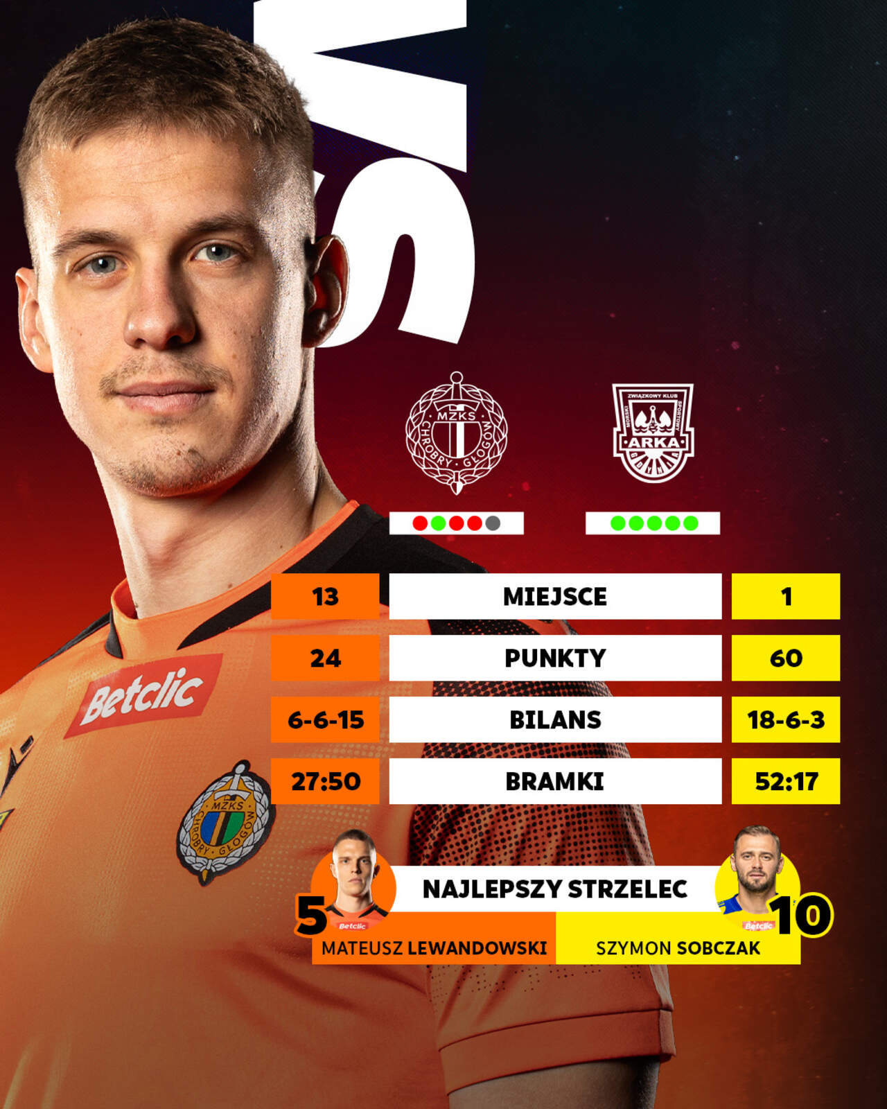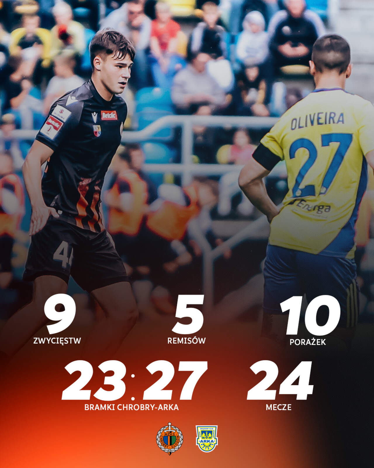 Nasz rywal: Arka Gdynia Liderująca w Betclic 1 Lidze Arka Gdynia na drodze Chrobrego. W przeddzień meczu opisujemy sobotniego przeciwnika. 11-04-2025 05:00 autor: ŁJ Arka w najwyższej dyspozycji Arka jest liderem z dwupunktową przewagą nad Termalicą Nieciecza. Pierwszą pozycję i jej utrzymanie uzyskała świetną dyspozycją w tym roku. Przypomnijmy bowiem, że jesienią miała gorszy okres, kiedy nie wygrała czterech kolejnych spotkań i kiedy klub decydował się na zmianę trenera. Teraz jednak jest jednym z dwóch zespołów bez porażki w tym roku, a w ostatnich pięciu spotkaniach zdobywającym komplet 15 punktów. Dodatkowo w kolejce, która za nami, Arka odniosła najwyższą tegoroczną wygraną, pokonując Wartę Poznań 3:0. Trener rywali: Dawid Szwarga Od grudnia ubiegłego roku trenerem Arki jest Dawida Szwarga i jest to trzeci szkoleniowiec zespołu w tym sezonie. Arkowcy zaczęli z Wojciechem Łobodzińskim na ławce, którego w sierpniu tymczasowo zastąpił Tomasz Grzegorczyk. Z końcem roku tę funkcję oddano Dawidowi Szwardze. Za byłym trenerem i asystentem Rakowa Częstochowa osiem spotkań. Gdynianie odnieśli w nich sześć zwycięstw, a dwa mecze zremisowali. Kadra rywali Podstawowym bramkarzem Arki jest były golkiper Chrobrego Damian Węglarz, który – przypominając – jeszcze jesienią rywalizował o miejsce z Pawłem Lenarcikiem. Obronę tworzą m.in. Michał Marcjanik z 87 występami w Ekstraklasie, Dawid Gojny i Hiszpan Marc Navarro. Obcokrajowcy są też w pomocy, w tym Gruzin Tornike Gaprindaszwili, który jest najlepiej asystującym w zespole. Z przodu występują wypożyczony z Legii Warszawa reprezentant Polski U-20 Jordan Majchrzak czy doświadczony na tym poziomie Szymon Sobczak. Po odejściu zimą Karola Czubaka (14 goli) to on jest najlepszym w kadrze ligowym strzelcem Arki – ma na koncie 10 bramek. 07-04-2025 Chrobry Głogów - Arka Gdynia: bilety W sobotę 12 kwietnia o godz. 19.30 na stadionie w Głogowie Pomarańczowo-Czarni zagrają z liderem Betclic 1 Ligi - Arką Gdynia. Wasze wsparcie jest w tym dniu... Klubowe powiązania W kadrze Arki jest dwóch byłych piłkarzy Chrobrego. To Damian Węglarz (20 meczów w tym sezonie), Michał Rzuchowski (26) oraz Przemysław Stolc (15). Od stycznia pomarańczowo-czarne barwy reprezentuje natomiast Paweł Lenarcik, który poprzedzające to półtora roku spędził w Gdyni. Obsada sędziowska Sędzia główny: Tomasz Musiał - Kraków Sędziowie asystenci: Sławomir Kowalewski, Maciej Kosarzecki Sędzia techniczny: Aleksander Borowiak Sędziowie VAR: Tomasz Wajda, Artur Aluszyk Wyrównany bilans W rundzie jesiennej Arka wygrała u siebie 2:0 i tym przechyliła szalę zwycięstw w całościowym bilansie na swoją korzyść. Ma teraz 10 wygranych z Chrobrym przy dziewięciu Chrobrego. Liczba meczów Chrobry - Arka: 24 Zwycięstw Chrobrego: 9 Remisów: 5 Zwycięstw Arki: 10 Bramki Chrobry - Arka: 23:27