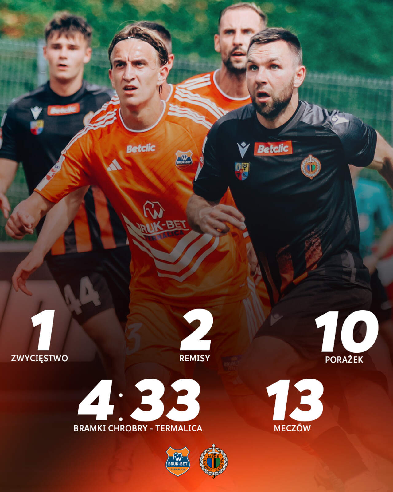 Nasz rywal: Bruk-Bet Termalica Nieciecza Na sam koniec pierwszoligowej jesieni Chrobry stoi przed najcięższym zadaniem, bo w sobotę zagra na wyjeździe z liderem - Bruk-Betem Termaliką Nieciecza. Dowiedz się więcej o tym rywalu. 06-12-2024 07:00 autor: ŁJ Awanse, spadki i baraże W ostatnich latach historia Termaliki naprzemiennie związana jest z Ekstraklasą i 1 Ligą. Zespół z Niecieczy dwukrotnie awansował na najwyższy poziom, tyle samo razy z niego spadając. Dwa razy wziął też udział w barażach o Ekstraklasę i choć ich nie przebrnął, świadczy to jakości i aspiracjach tak budowanej drużyny. Ten sezon to potwierdza. Termalica jest pierwsza z pięcioma punktami przewagi nad wiceliderem. Pierwszą porażkę w sezonie poniosła dopiero w jedenastym występie. W tamtym okresie przegrała trzy na cztery spotkania, ale szybko zażegnała ten kryzys i aktualnie za nią seria pięciu meczów bez porażki. Przed tygodniem niecieczanie wygrali z Wartą Poznań 1:0 po golu Kamila Zapolnika. Trener rywali: Maciej Brosz Trenerem Termaliki od marca tego roku jest Marcisz Brosz. Do tej pory poprowadził zespół w 29 meczach, spośród których wygrał w 16. Daje mu to punktowanie ze średnią na poziomie 1,86. Marcin Brosz w przeszłości był trenerem m.in. reprezentacji Polski U-19, Górnika Zabrze, Korony Kielce i Piasta Gliwice. Z Górnikiem awansował do eliminacji do Ligi Europy, dwukrotnie wprowadzał też swoje zespoły do Ekstraklasy - Piasta i Górnika. Teraz ma szansę zrobić to po raz trzeci, ale już z Termalicą. Kadra rywali: Karasek najlepszym strzelcem Najskuteczniejszy w Termalice jest Kacper Karasek. 22-letni zawodnik ma na swoim koncie 10 ligowych bramek. Swój dorobek wyraźnie podreperował w przedostatnim spotkaniu. Termalica pokonała Kotwicę Kołobrzeg 5:0, a Karasek skompletował hat-tricka. Cztery trafienia ma Kamil Zapolnik. To jego gol zapewnił zespołowi komplet punktów przed tygodniem w Poznaniu. On i Artem Putivtsev boisko opuścili jednak z kontuzjami. Jeśli nie zagraliby w sobotę, byłaby to duża strata, bo obaj są ważnymi zawodnikami Termaliki. Poza nimi sporo grają także Maciej Ambrosiewicz, Adrian Chovan ze Słowacji z trzykrotnym mistrzostwem tego kraju w swoim CV (z klubami AS Trencin oraz Slovan Bratysława), Ukrainiec Andriy Dombrovskyi, Arkadiusz Kasperkiewicz, Maciej Wolski czy Austriak Lukas Spendlhofer, który w przeszłości sięgnął po krajowy puchar ze Sturmem Graz. Ciekawostki Największym osiągnięciem Termaliki jest 8 miejsce w Ekstraklasie w sezonie 2016/17. Nieciecza to najmniejszy punkt na mapie Betclic 1 Ligi. Liczba ludności tej miejscowości wynosi niespełna 700. Jest tam jednak siedziba bardzo dużego producenta kostki brukowej, firmy Bruk-Bet, która jednocześnie stoi za osiągnięciami klubu, który jeszcze w 2004 roku rywalizował w Klasie A. Prezesem Termaliki jest Danuta Witkowska, prywatnie żona właściciela Bruk-Betu. Przydomek drużyny to „Słonie”. Słoń jest jednym z elementów herbu klubu. Tu zagramy fot. termalica.brukbet.com Klubowe powiązania W kadrze Chrobrego jest dwóch piłkarzy z przeszłością w Niecieczy. W latach 2016-2020 barwy Termaliki reprezentował Przemysław Szarek, grając z nią także w Ekstraklasie (13 występów). Później, bo w rundzie wiosennej sezonu 2020/21 i sezonie 2021/22, w Niecieczy był Sebastian Bonecki. Obsada sędziowska Sędzia główny: Paweł Pskit - Zgierz Sędziowie asystenci: Michał Gajda, Julia Bukarowicz Sędzia techniczny: Rafał Rokosz Sędziowie VAR: Marcin Kochanek, Piotr Szypuła Chrobry już wygrał w Niecieczy O Termalice można powiedzieć, że to najbardziej wymagający dla Chrobrego rywal w ostatnich latach. Mecz z lipca zakończył się zwycięstwem rywali 4:0. Na 13 spotkań Pomarańczowo-Czarni wygrali tylko raz, ale tak się składa, że ten raz miał miejsce w Niecieczy - w 2018 roku Chrobry wrócił stamtąd z korzystnym 2:1. Liczba meczów Chrobry - Termalica: 13 Zwycięstw Chrobrego: 1 Remisów: 2 Zwycięstw Termaliki: 10 Bramki Chrobry-Termalica: 4:33 fot. termalica.brukbet.com
