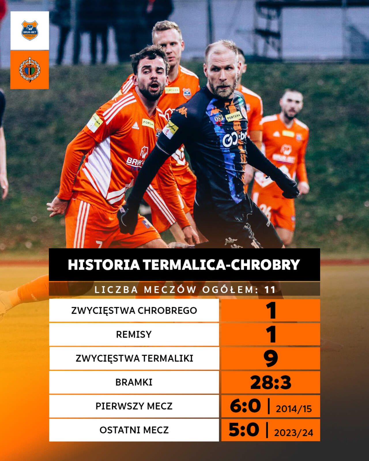 Nasz rywal: Bruk-Bet Termalica Nieciecza Od meczu w Niecieczy Chrobry rozpocznie wiosenne zmagania w Fortuna 1 Lidze. Termalica zawsze była wymagającym przeciwnikiem i biorąc pod uwagę jej obecne aspiracje do awansu nie inaczej będzie tym razem. 17-02-2024 11:15 autor: ŁJ Najczęściej w czołówce Po jesieni Bruk-Bet Termalica Nieciecza zajmuje 10 miejsce i z pewnością powalczy o awans i zarazem powrót po dwóch latach do Ekstraklasy. Już przed rokiem, w sezonie bezpośrednio po spadku, Termalica o prawo ponownej gry w „Esie” rywalizowała w barażach, dochodząc do finału, a odkąd Chrobry występuje na pierwszoligowym poziomie, „Słonie” nigdy nie wypadły poza ósemkę. Do rundy przygotowywały się na obozie w Turcji. Trener rywali Od czerwca 2023 roku trenerem Termaliki jest były reprezentant Polski Mariusz Lewandowski. Szkoleniowcem niecieczan był już w sezonie 2020/21, w którym zespół pod jego wodzą finiszował na 2 miejscu i awansował do Ekstraklasy. Aby to powtórzyć, na ten moment musi zająć się czteropunktową stratą do strefy barażowej. - Przeanalizowaliśmy rywala i mamy plan na to spotkanie. W pewnym momencie każdy mówił, że Chrobry jest do spadku, a nagle nastąpiło jego odrodzenie i to jest całkowicie inna drużyna. Szanujemy ten zespół, ale znamy swoje atuty - powiedział w wywiadzie dla klubu trener Mariusz Lewandowski. Wzmocnienie i tak silnej ofensywy Pomóc w awansie mają „zimowe” posiłki. Do Niecieczy trafili młodzieżowiec Jakub Jędrasik z Legii Warszawa, autor dwóch goli dla Sandecji Nowy Sącz w rundzie jesiennej - Jakub Wróbel (który już w przeszłości grał dla Termaliki), oraz przede wszystkim Jasse Tuominen. Ten ostatni w ubiegłym roku w lidze fińskiej wystąpił w 23 meczach, w których zdobył 4 bramki, a na koncie ma dwa tytuły mistrza Białorusi i występy dla reprezentacji Finlandii. Najlepszym strzelcem Termaliki z sześcioma golami na koncie jest Wiktor Biedrzycki. Między innymi dzięki niemu Termalica jest jednym z najbardziej bramkostrzelnych zespołów (33 gole), a wzmocnienie się z przodu wspomnianym Tuominenem zdaje się jasno pokazywać kierunek obrany przez zespół: atak. Klubowe powiązania Jedynym zawodnikiem Chrobrego w przeszłości grającym w Termalice jest Karol Dybowski, który barwy tego klubu reprezentował w sezonie 2019/20. Rozegrał wówczas 14 spotkań w Fortuna 1 Lidze. Obsada sędziowska Sędzia główny: Tomasz Wajda - Żywiec Sędziowie asystenci: Sławomir Kowalewski, Damian Rokosz Sędzia techniczny: Piotr Szypuła Sędziowie VAR: Jacek Małyszek, Mateusz Złotnicki Zawsze trudno, ale raz z Niecieczy z kompletem Termilica jest dla Chrobrego od lat bardzo wymagającym przeciwnikiem. Pierwsze spotkanie w historii, w 2014 roku, zakończyło się wygraną rywali 6:0. Ostatnie, z sierpnia 2023 roku, ich zwycięstwem 5:0. Głogowianie triumfowali raz, w 2018 roku wygrywając na stadionie w Niecieczy 2:1. Liczba meczów Chrobry - Termalica: 11 Zwycięstw Chrobrego: 1 Remisów: 1 Zwycięstw Termaliki: 9 Bramki Chrobry-Termalica: 3:28