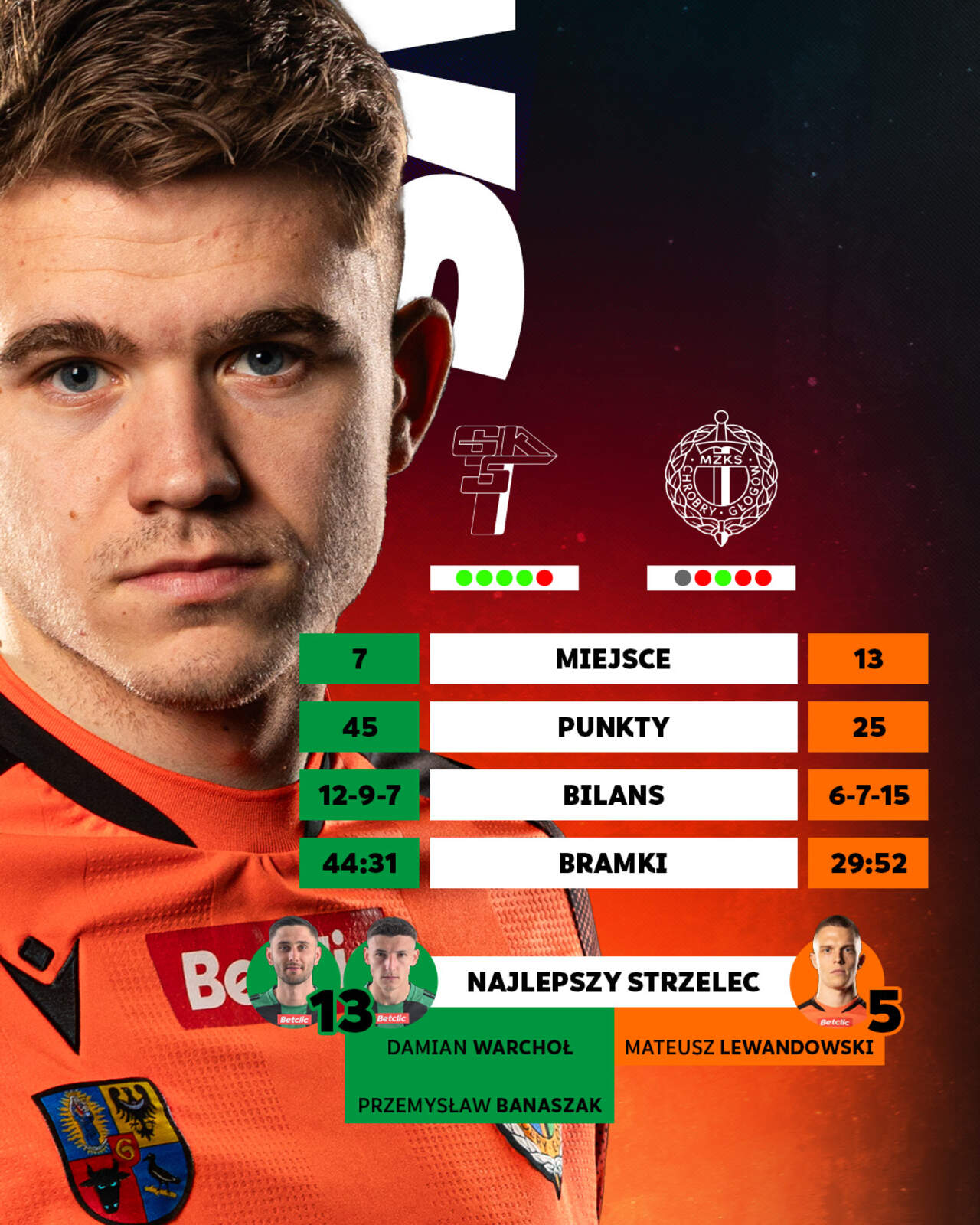 Nasz rywal: Górnik Łęczna Po raz pierwszy przyjdzie Chrobremu zagrać o ligowe punkty w świąteczny poniedziałek. Na dwa dni przed tym "wielkanocnym" meczem zaglądamy do obozu przeciwnika - Górnik Łęczna. 19-04-2025 08:15 autor: ŁJ Bez straty punktu i gola Górnik jest tuż za strefą barażową i mając cztery punkty straty do szóstej pozycji nie może pozwalać sobie na porażki. I ostatnio tego nie robi. Po tym, jak w 24 kolejce przegrał z aktualnym liderem Arką Gdynia 0:1 i była to czwarta porażka w jednym ciągu, w następnych czterech zgarnął komplet punktów – choć trochę z pomocą, bo za początkowo zremisowane spotkanie z Kotwicą Kołobrzeg „Górnikom” przyznano punkty walkowerem. Nie zmienia tego jednak faktu, że drużyna jest w dobrym dla siebie okresie. Z walkowerem czy bez – to cztery z rzędu mecze bez porażki i zarazem cztery bez straty choćby jednej bramki. W ostatniej kolejce Górnik pokonał Wartę Poznań 2:0. Trener rywali: Pavol Stano Od stycznia ubiegłego roku trenerem Górnika jest Pavol Stano. Słowacki szkoleniowiec w swojej karierze zarówno zawodniczej, jak i trenerskiej był związany z Polską. Grając: m.in. z Koroną Kielce i Jagiellonią Białystok, z którą zdobył Puchar Polski. Trenując: przed pracą w Górniku z Wisłą Płock, którą prowadził w latach 2022-23. Pod wodzą 47-letniego szkoleniowca Górnik w 29 meczach odniósł 12 zwycięstw, 9 spotkań zremisował, a w 8 przegrał. Kadra rywali: bramkostrzelny duet Duży wpływ na ofensywę Górnika mają Damian Warchoł i Przemysław Banaszak. Obaj zdobyli po 13 bramek, co daje ponad połowę ligowego dorobku całej drużyny (44). Doświadczenie obu procentuje, bo Warchoł rozegrał wyżej 39 spotkań, głównie z Wisłą Płock, a Banaszak 28 w „ekstraklasowym” okresie Górnika. Poza tą dwójką, w czołówce pod względem występów w tym sezonie są Adam Deja z bogatym CV i ponad 150 meczami w Ekstraklasie, Jakub Bednarczyk, podstawowy bramkarz Branislav Pindroch czy Filip Szabaciuk. Ważną rzeczą jest to, że w Górniku do licznych zmian doszło przed sezonem, a do Łęcznej trafił wtedy m.in. Banaszak. Zimą dokonano tylko jednego wzmocnienia. Być może właśnie ostatni okres z serią zwycięstw jest efektem dłuższego zgrania. Ciekawostki Największymi osiągnięciami Górnika są 7. miejsce w Ekstraklasie (2004/05), 1/2 finału Pucharu Polski (2022/23) i 1/2 finału Pucharu Ekstraklasy (2006/07). Tu zagramy: Fot. 1liga.org Klubowe powiązania W przeszłości w Górniku grali Robert Mandrysz, Mikołaj Lebedyński i Szymon Lewkot. Robert w sezonie 2012/13, Mikołaj później, bo wiosną 2017/18, a Szymon całkiem niedawno - w edycji 2022/23. W kadrze tego sezonu po stronie Górnika był Hubert Turski, którego pamiętamy z gry w Chrobrym w sezonie „barażowym”, jednak w trakcie zimowej przerwy przeniósł się do Pogoni II Szczecin. Obsada sędziowska Sędzia główny: Tomasz Marciniak - Płock Sędziowie asystenci: Maciej Majewski, Marcin Adamski Sędzia techniczny: Aleksander Kozieł Sędziowie VAR: Sebastian Jarzębak, Katarzyna Fijarczyk Mecz nr 10 Do tej pory odbyło się 9 meczów Chrobrego z Górnikiem. W ostatnim obie strony podzieliły się punktami, remisując 1:1. Liczba meczów Chrobry-Górnik: 9 Zwycięstw Chrobrego: 2 Remisów: 3 Zwycięstw Górnika: 4 Bramki Chrobry-Górnik: 9:12