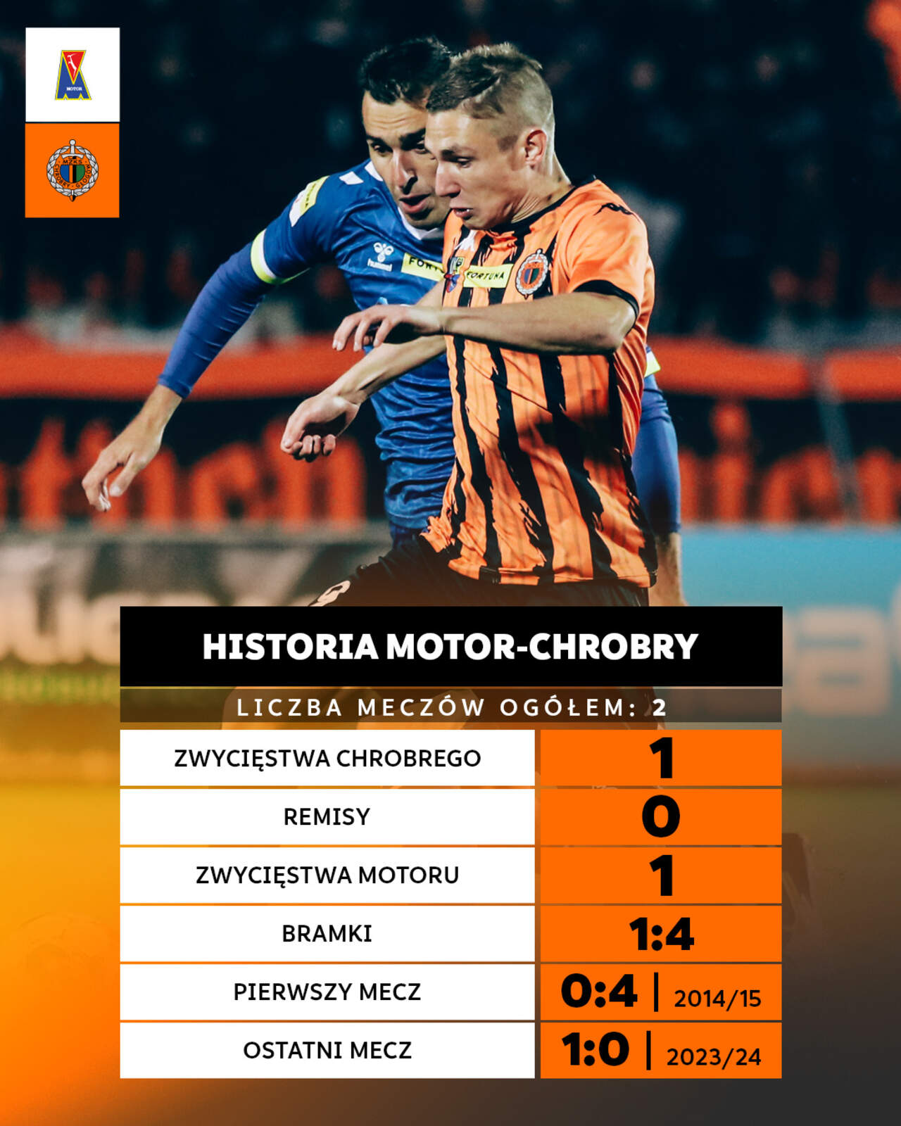Nasz rywal: Motor Lublin Co w Motorze Lublin przed czwartkowym meczem? Garść informacji o rywalu i czekającym nas pojedynku. 24-04-2024 08:15 autor: ŁJ Wiosną nie tak wysoko Zajmujący obecnie siódme miejsce Motor Lublin jest najlepszym zespołem spośród wszystkich beniaminków i to, że walczy o udział w barażach powoduje, że trudno go takim beniaminkiem nazywać. Z drugiej strony często zdarza się tak, że jakiś zespół na fali po awansie ma bardzo udaną rundę jesienną i gorszą wiosenną. Tak jest w przypadku lublinian, którzy w tym roku na dziesięć meczów wygrali trzy, w tym dwa w lutym. Cały czas daje to solidne, bezpieczne miejsce w środku tabeli za tę część sezonu, ale już nie trzecie, które Motor zajmował po całej jesieni. W ostatniej kolejce rywale przegrali w Legnicy 0:2, wcześniej remisując z Arką Gdynia 2:2 i pokonując Wisłę Kraków 3:1. Trener rywali: Mateusz Stolarski Po tym, jak Goncalo Feio opuścił Motor i objął funkcję szkoleniowca Legii Warszawa, trenerem zespołu z Lublina, dokładnie od 18 marca, jest 31-letni Mateusz Stolarski, dla którego to debiut w tej roli na poziomie centralnym. Wcześniej pozostawał asystentem w sztabie Feio. Pod jego wodzą Motor rozegrał cztery spotkania, w których zdobył pięć punktów. Kadra: 10 goli Ceglarza Liderem strzelców w Motorze jest grający w klubie od 2019 roku Piotr Ceglarz, który do tej pory zdobył 10 goli. W kadrze drużyny jest kilku zawodników z ekstraklasowym doświadczeniem, jak mający sporo ponad 100 występów na najwyższym poziomie Paweł Stolarski z Sebastianem Rudolem. Pawłem Stolarskim, dwukrotnym mistrzem Polski z Legią Warszawa, a ostatnio piłkarzem Pogoni Szczecin, wzmocniono się zimą, podobnie jak również grającymi w przeszłości wyżej Kamilem Krukiem (ost. Zagłębie Lubin) oraz Samuelem Mrazem ze Słowacji (ost. grecki Volos NPS). Wszyscy są z miejscem w podstawowym składzie. Najwięcej rozegranych minut ma wspomniany Ceglarz, a pod względem czasu spędzonego na boisku za nim są Bartosz Wolski, Michał Król i Arkadiusz Najemski. Spośród tych zawodników na pewno nie zagra jeden - ukarany ostatnio ósmą żółtą kartką Sebastian Rudol. Jako ciekawostkę warto dodać, że w pierwszym meczu Chrobrego z Motorem z 2014 roku wystąpił Rafał Król, dziś również piłkarz lublinian. 35-letni pomocnik w tym sezonie zagrał jak na razie 12-krotnie. Tu zagramy Fot. 1liga.org Klubowe powiązania Od sezonu 2022/23 barwy Motoru reprezentuje Marcel Gąsior, który w przeszłości przez okres trzech i pół roku był zawodnikiem Chrobrego. Z prowadzonym wówczas przez trenera Ireneusza Mamrota zespołem zajął 6 miejsce w 1 Lidze. W tym sezonie zagrał w 20 spotkaniach. Na „swoim” terenie może wystąpić Mateusz Ozimek. Pomocnik Chrobrego w Motorze co prawda nie grał, ale urodził się w Lublinie, na początku kariery będąc w miejscowym Widoku. Obsada sędziowska Sędzia główny: Tomasz Wajda - Żywiec Sędziowie asystenci: Krzysztof Myrmus, Sławomir Kowalewski Sędzia techniczny: Piotr Szypuła Sędziowie VAR: Łukasz Kuźma, Radosław Siejka Po raz trzeci To dopiero trzeci mecz Chrobrego z Motorem. Pierwszy odbył się w 2014 roku w ramach rozgrywek Pucharu Polski i głogowianie wygrali 4:0 po dwóch golach Mateusza Hałambca, Łukasza Szczepaniaka i Damiana Sędziaka. Jesienią tego sezonu górą był Motor, o którego jednobramkowym zwycięstwie przesądziło trafienie Mariusza Rybickiego. Liczba meczów Chrobry - Motor: 2 Zwycięstw Chrobrego: 1 Remisów: 0 Zwycięstw Motoru: 1 Bramki Chrobry - Motor: 4:1