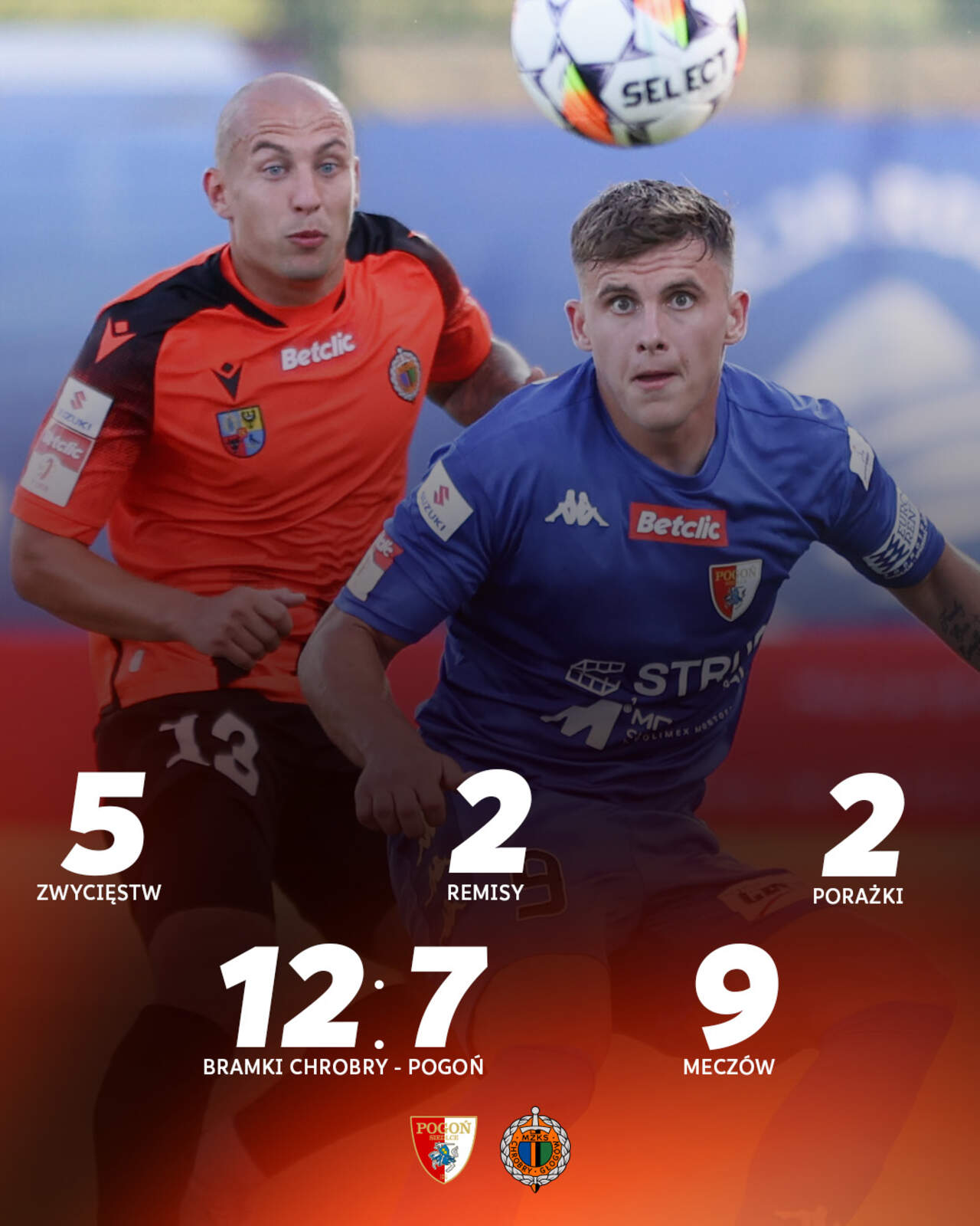 Nasz rywal: Pogoń Siedlce Mecz, który trzeba wygrać. Do Głogowa przyjeżdża Pogoń Siedlce, o której piszemy więcej w przedmeczowym tekście. 29-11-2024 07:15 autor: ŁJ Cztery punkty różnicy Pogoń Siedlce na pierwszoligowy poziom wróciła po sześciu latach gry w drugiej lidze. Razem z Chrobrym awansowała na zaplecze w 2014 roku, ale o ile głogowianie niezmiennie się w nim utrzymują, o tyle Pogoń na tych kilka lat wypadła. Wróciła jednak jako najlepszy drugoligowiec i potwierdza to w rundzie jesiennej, choć w pojedynczych występach. Pokonała dwóch innych beniaminków, Stal Stalową Wolę i Kotwicę Kołobrzeg. To jak na razie jedyne zwycięstwa siedlczan. Ostatnie, z Kotwicą, miało miejsce 8 listopada. Przed tygodniem Pogoń przegrała natomiast z Wartą Poznań 1:2. W tabeli zajmuje 18 miejsce z dorobkiem 9 punktów, mając ich o cztery mniej od Chrobrego. Trener rywali: Adam Nocoń Pogoń do Betclic 1 Ligi wprowadził trener Marek Brzozowski, ale w trakcie jesieni zdecydowano się na zmianę. Od 1 października tę funkcję pełni Adam Nocoń, były szkoleniowiec m.in. Odry Opole, Chojniczanki Chojnice, Olimpii Elbląg i Podbeskidzia Bielsko-Biała. W sześciu meczach pod jego wodzą Pogoń raz wygrała, raz zremisowała i poniosła cztery porażki. 6 goli w 8 meczach najlepszego strzelca Do tej pory w barwach Pogoni najwięcej rozegranych minut mają Mateusz Pruchniewski, Jakub Sinior, Cezary Demianiuk, Lukáš Hrnčiar ze Słowacji i Brazylijczyk Cássio. W tej czołowej piątce nie ma jednak zawodnika z największą liczbą występów w Ekstraklasie - Krzysztofa Danielewicza, który w Cracovii, Śląsku Wrocław i Górnika Łęczna rozegrał ponad 90 spotkań w najwyższej lidze, choć było to w latach 2013-2017. Nie ma też najlepszego strzelca, którym z sześcioma golami jest Karol Podliński. Podliński, były gracz m.in. Zagłębia Lubin i Górnika Łęczna, potrzebował na to ośmiu spotkań, a trzy z jego trafień to bramki zdobyte w 90 minucie. Ciekawostki Największymi osiągnięciami Pogoni są 1/4 finału Pucharu Polski (1987/88, 2022/23) oraz 10 miejsce na drugim poziomie rozgrywkowym (1949) 25-11-2024 Chrobry Głogów - Pogoń Siedlce: bilety W niedzielę ostatni tegoroczny występ na stadionie w Głogowie. O godz. 12.00 zagramy z Pogonią Siedlce. Trwa sprzedaż biletów na ten mecz. Klubowe powiązania - Obsada sędziowska Sędzia główny: Filip Kaliszewski - Gdańsk Sędziowie asystenci: Artur Zakrzewski, Dawid Nitka Sędzia techniczny: Maciej Pelka Sędziowie VAR: Sebastian Krasny, Piotr Szypuła Z Pogonią dziesiąty raz Mecz z Pogonią jest pierwszym z rundy rewanżowej, więc oba zespoły w tym sezonie zmierzyły się już na inaugurację. Chrobry wygrał w Siedlcach 2:1 po golach Sebastiana Boneckiego i Szymona Bartlewicza. To było jego piąte zwycięstwo z tą drużyną. Liczba meczów Chrobry - Pogoń: 9 Zwycięstw Chrobrego: 5 Remisów: 2 Zwycięstw Pogoni: 2 Bramki Chrobry - Pogoń: 12:7