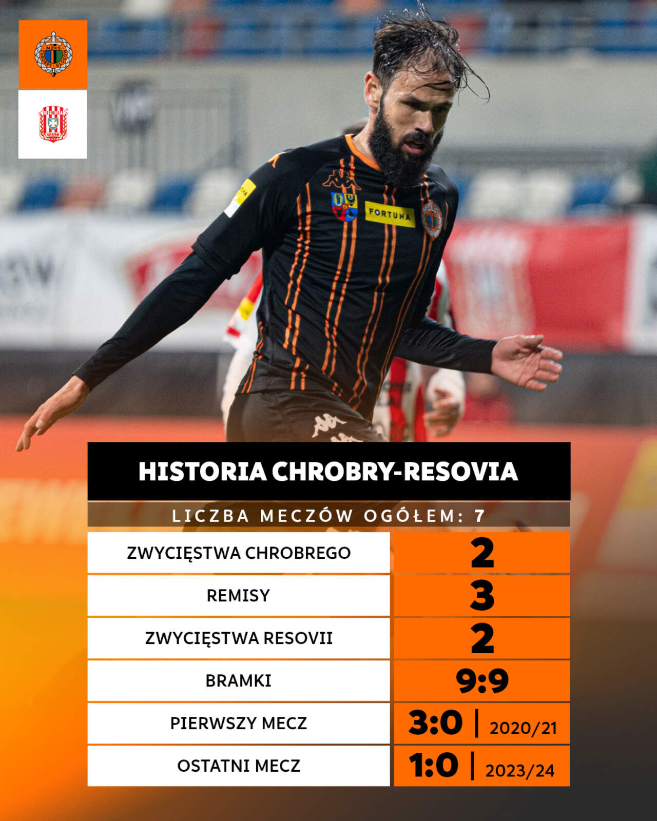 Nasz rywal: Resovia Rzeszów To ósmy mecz z Resovią, a pod względem gatunku wydaje się być najcięższym spośród dotychczasowych. 10-05-2024 07:00 autor: ŁJ Mecz z gatunkowym ciężarze Punktów do zapewnienia sobie utrzymania potrzebuje Chrobry, ale jeszcze bardziej Resovia, która otwiera strefę spadkową. Na ten moment konkuruje najbardziej z 15. w tabeli Polonią Warszawa, która ma punkt więcej (Chrobry dysponuje już pięciopunktową przewagą). Jednak scenariusz, w którym po weekendzie pomiędzy tymi trzema drużynami są tylko punkt lub dwa różnicy jest realny. Chrobry musi mu zapobiec, Resovia natomiast musi użyć wszystkich środków, aby się do takiego układu zbliżyć. Rywal będzie bardzo zdeterminowany, co pokazują ostatnie kolejki. Zremisował z Miedzią Legnica i Wisłą Kraków po golach zdobywanych kolejno w 86 i 90 minucie, pokonał GKS Tychy 3:1, a z Arką Gdynia choć przegrał 2:3, to był moment z jego jednobramkowym prowadzeniem. W tabeli za pięć ostatnich kolejek z dorobkiem pięciu punktów zajmuje 13 miejsce (głogowianie mają za ten okres o dwa oczka mniej). Ulatowski: „Wszystko jest możliwe” W grudniu trenerem Resovii został Rafał Ulatowski, który wrócił na ławkę po trzech latach przerwy po tym, jak z końcem 2020 roku przestał być szkoleniowcem Lecha II Poznań. W swojej karierze był asystentem selekcjonera reprezentacji Polski Leo Beenhakkera, a w Ekstraklasie prowadził Lecha Poznań, Lechię Gdańsk, Cracovię, Lechią Gdańsk i Zagłębie Lubin. Resovią pokierował w 15 meczach, a pod jego wodzą zespół odniósł cztery zwycięstwa, zanotował cztery remisy i siedem porażek. To daje 1.07 punkta na mecz. - Szatnia, wykonywana praca, nastawienie zawodników i chęć gry w pierwszej lidze nas wszystkich - powiedział Rafał Ulatowski na pytanie dziennikarza o to, co przemawia za Resovią, że to właśnie ona pozostanie na zapleczu. - Jest dziewięć punktów do zdobycia i wszystko jest możliwe. Remisem z Miedzią daliśmy sobie nadzieję, że pojedziemy do Głogowa i będziemy walczyć o utrzymanie, a nie o to, żeby z honorem pożegnać się z ligą. Kadra rywali W końcówce sezonu Resovii bramkami pomaga m.in. Maciej Górski. Były napastnik Chrobrego w trzech ostatnich spotkaniach zdobył trzy bramki i z sześcioma na koncie jest najlepszym strzelcem u rywala. Drugi pod tym względem (pięć trafień) jest Bartłomiej Wasiluk. Najwięcej grającymi zawodnikami u rzeszowian są Rafał Mikulec, Radosław Kanach, Adrian Łyszczarz, Marcin Urynowicz czy Kornel Osyra, spośród których wszyscy, poza Mikulcem, w przeszłości w swoich karierach doszli do poziomu Ekstraklasy. 114 rozegranych w niej spotkań ma Osyra, wcześniej reprezentujący barwy m.in. Miedzi Legnica, Piasta Gliwice czy Termaliki Nieciecza. Przebija go w tej statystyce tylko Michał Gliwa, który przed laty na najwyższym poziomie był golkiperem m.in. Zagłębia Lubin oraz Sandecji Nowy Sącz. Z tego grona w Głogowie nie zagra pauzujący za kartki Urynowicz. Klubowe powiązania Od razu nasuwa się tu postać Macieja Górskiego. Dziś, jak wspomnieliśmy, jest najlepszym strzelcem Resovii, a w sezonie 2015/16 był nim w Chrobrym. W dużej mierze dzięki jego 15 golom Pomarańczowo-Czarni zakończyli wtedy rozgrywki na szóstym miejscu, a sam Górski przeszedł do Jagiellonii Białystok. Przeszłość w Rzeszowie ma za to Karol Dybowski. Bramkarz Chrobrego grał tam w sezonie 2020/21, a przez cześć tego okresu jego trenerem pozostawał Mateusz Wójcik, czyli dziś szkoleniowiec bramkarzy w głogowskim teamie. Obsada sędziowska Sędzia główny: Piotr Urban - Warszawa Sędziowie asystenci: Michał Gajda, Maciej Majewski Sędzia techniczny: Sebastian Tarnowski Sędziowie VAR: Damian Kos, Piotr Idzik Mecz numer osiem Liczba meczów Chrobry-Resovia: 7 Zwycięstw Chrobrego: 2 Remisów: 3 Zwycięstw Resovii: 2 Bramki Chrobry-Resovia: 9:9