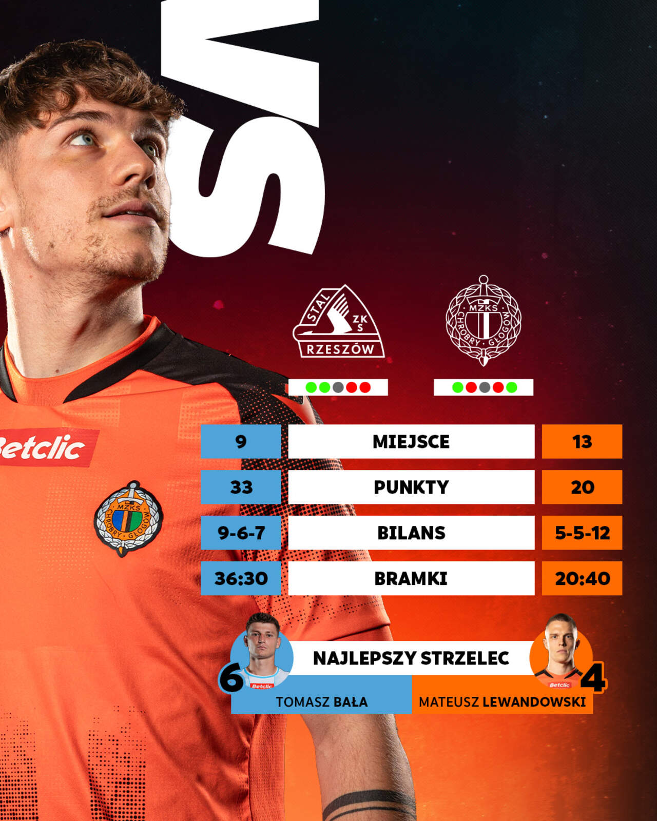 Nasz rywal: Stal Rzeszów Garść informacji o przeciwniku przed niedzielnym meczem w Rzeszowie. 08-03-2025 09:15 autor: ŁJ W tym roku niepokonani Stal Rzeszów poprzedni rok zakończyła gorzej (jeden punkt w trzech meczach), ale bardzo dobrze zaczęła nowy (siedem punktów w trzech meczach). Za Stalą tegoroczny remis z Miedzią Legnica oraz jednobramkowe zwycięstwa z Kotwicą Kołobrzeg i Wartą Poznań. Zespół ma obecnie 33 punkty, a to klasyfikuje go na dziewiątej pozycji w tabeli. Obecna forma nie jest jednak najlepszą tego sezonu. W sierpniu i we wrześniu zespół miał sześć spotkań bez porażki, w tym cztery wygrane z rzędu. Dopiero teraz próbuje nawiązać do tamtego okresu. Wtedy Chrobremu nie udało się przerwać tej serii, a Stal pokonując Chrobrego 3:1 zwyciężyła właśnie po raz czwarty, ale głogowianie mogą zrobić to teraz. Trener rywali: Marek Zub 60-letni Marek Zub jest trenerem Stali od czerwca 2023 roku, a do kraju powrócił po bardzo udanej przygodzie za granicą, gdzie dwukrotnie został mistrzem Litwy z Zalgirisem Wilno. W pierwszym sezonie swojej pracy w Rzeszowie zajął ze Stalą 11 miejsce ze średnią punktów 1.41. W obecnej edycji ta średnia została zwiększona do 1.50. 🎙️ | 𝐊𝐨𝐧𝐟𝐞𝐫𝐞𝐧𝐜𝐣𝐚 𝐩𝐫𝐚𝐬𝐨𝐰𝐚 przed meczem z Chrobry Głogów 👉 https://tiny.pl/kxp9r_c2Opublikowany przez Stal Rzeszów Czwartek, 6 marca 2025 Kadra rywali: Stal młodzieżowym liderem Najlepszym strzelcem Stali z sześcioma golami na koncie jest Tomasz Bała. Stal jest liderem klasyfikacji Pro Junior System (11 296 punktów do 5792 drugiego ŁKS-u Łódź i 4332 trzeciego Chrobrego) i samo to dużo mówi o stylu, w jakim buduje swoją kadrę. Ma w niej zawodników z występami w młodzieżowych reprezentacjach Polski: Michała Synosia, Patryka Warczaka, Szymona Kądziołkę czy Szymona Łyczko. To właśnie ten ostatni 19-latek jest najlepiej punktującym graczem Stali w PJS. Najwięcej minut na boisku rozegrał jednak 21-letni Patryk Warczak, który status młodzieżowca miał jeszcze w ubiegłym sezonie. Nie znaczy to jednak, że Stal nie dobudowuje się doświadczeniem. Takim dysponują choćby Kamil Kościelny z 58 występami w Ekstraklasie czy Andreja Prokic (49 meczów). Kościelny ostatni swój występ zakończył czerwoną kartką i w niedzielę nie zagra. Tu zagramy: Fot. stalrzeszow.pl Klubowe powiązania - Obsada sędziowska Sędzia główny: Tomasz Musiał - Kraków Sędziowie asystenci: Marcin Ciepły, Dominik Paul Sędzia techniczny: Patryk Świerczek Sędziowie VAR: Sebastian Jarzębak, Damian Gawęcki Ze Stalą szósty raz Niewiele do tej pory było meczów ze Stalą Rzeszów, ale jak już, to w nich się dzieje. W sezonie 2022/23 Chrobry doprowadził do stanu 3:3, choć rywale prowadzili już 3:0. W poprzednim głogowianie wygrali 2:1 po wolnym Dawida Hanca w 90 minucie. Dla odmiany, w sierpniu 2023 roku, w taki sam sposób, bo po golu w doliczonym czasie gry, to rzeszowianie triumfowali 2:1. Liczba meczów Chrobry-Stal: 5 Zwycięstw Chrobrego: 1 Remisów: 2 Zwycięstw Stali: 2 Bramki Chrobry-Stal: 10:12