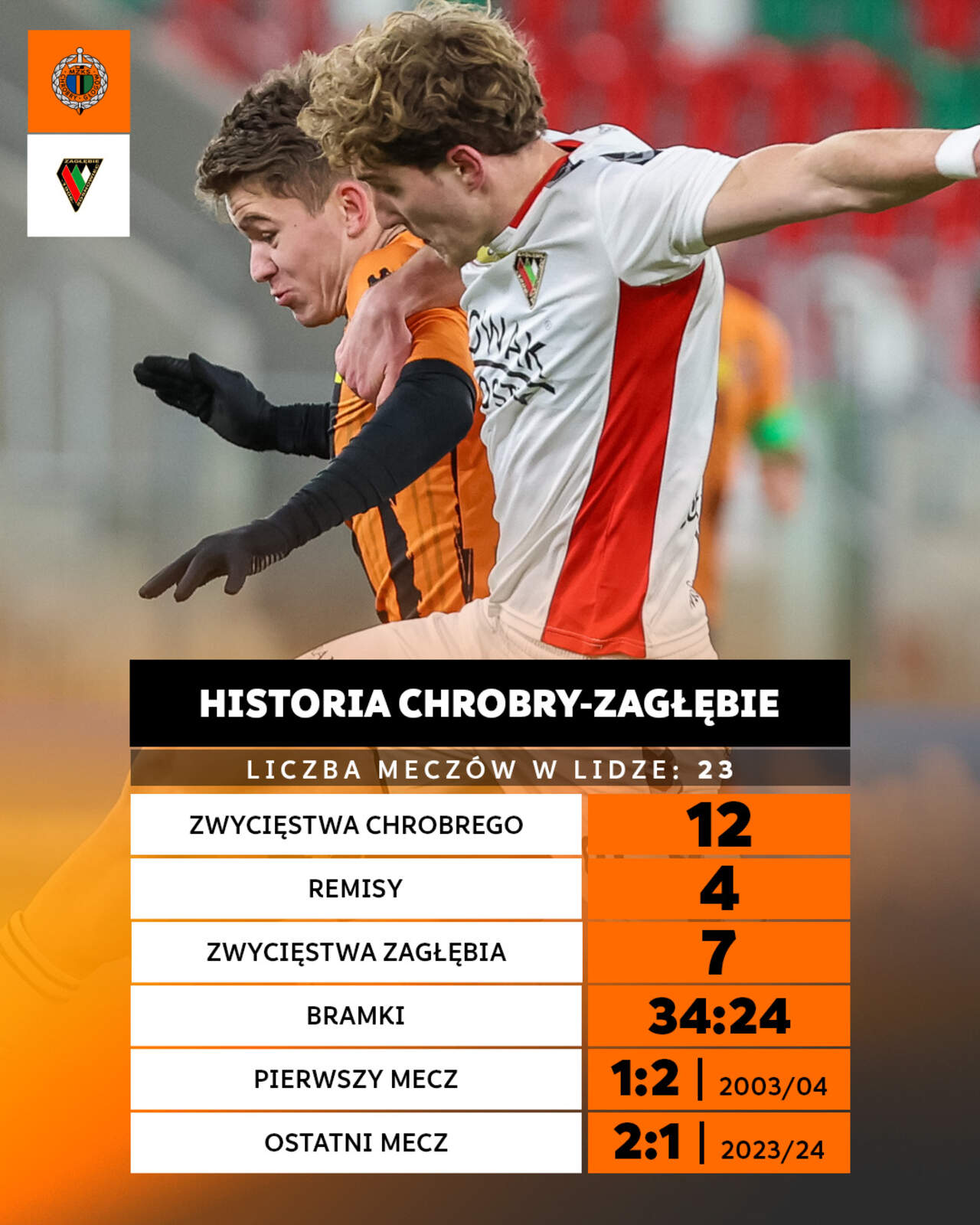 Nasz rywal: Zagłębie Sosnowiec To już ostatni mecz tego sezonu. Chrobry w niedzielę podejmie Zagłębie Sosnowiec. Sprawdzamy, co słychać w zespole, który żegna się z Fortuna 1 Ligą. 24-05-2024 07:00 autor: ŁJ Próbują odejść z honorem Przed sezonem w Zagłębiu pojawiło się kilka ciekawych nazwisk (Kamil Biliński, Joel Valencia czy Juan Camara). Poza kadrą także, bo przez część sezonu za pion sportowy odpowiadał kojarzony z telewizją Rafał Collins. Jednak to wszystko nie wypaliło. Świadczy o tym liczba szkoleniowców, których na przestrzeni całego sezonu Zagłębie miało czterech. Zespół jako pierwszy pożegnał się z rozgrywkami Fortuna 1 Ligi. Obecnie ma za sobą 25 meczów z rzędu bez wygranej. Ostatnie zwycięstwo miało miejsce 27 września z Gryfem Wejherowo w ramach Pucharu Polski. Trzeba jednak przyznać, że pomimo statusu spadkowicza, sosnowiczanie nie żegnają się z ligą bez honoru. Były momenty, w których dużo wcześniej przegrywali po 0:4, a ostatnie mecze to 1:2 z Miedzią Legnica, 0:1 z Arką Gdynia czy - uwaga - 1:1 z Wisłą Kraków. Trener rywali: Marek Saganowski Obecnym i zarazem czwartym w tym sezonie trenerem Zagłębia jest Marek Saganowski - piłkarsko były reprezentant kraju, trenersko pracujący wcześniej w Wiśle Płock, Pogoni Siedlce i Motorze Lublin. Oficjalnie prowadzi zespół od 4 kwietnia. Przejął drużynę, która dwa razy z rzędu przegrała 0:4. Za jego kadencji do takiego wyniku nawet się wyraźnie nie zbliżyła, tylko raz wyżej przegrywając z GKS-em Tychy, jeśli tak można to nazwać, bo mowa o 0:2. - Wiem, jak i co zrobić, żeby ten pogrzeb, który dziś jest gotowany przez nas kibicowi, został zapomniany - powiedział Marek Saganowski. Biliński cały czas bramkostrzelny Podobnie, jak w przypadku Podbeskidzia, same nazwiska w kadrze nie wskazywałyby na to, że Zagłębie może spaść do 2 Ligi. Wspomniani Joel Valencia i były król strzelców na tym poziomie Kamil Biliński, Michał Janota, mistrz kraju z Legią Warszawa William Remy czy wieloletni gracz Pogoni Szczecin Hubert Matynia to piłkarze z doświadczeniem lub dobrym CV. Zagłębiu w odsłonie z tego sezonu jednak się nie wiedzie, choć indywidualnie znów nieźle idzie Bilińskiemu. Daleko mu do 19 zdobytych bramek w sezonie 2021/22, ale z ośmioma trafieniami to nadal najlepszy strzelec swojego teamu. 15-05-2024 Ostatni mecz Mateusza i Michała 26 maja. Tego dnia bądź na WS3 Chrobry Głogów - Zagłębie Sosnowiec, czyli ostatni występ Mateusza Machaja i Michała Michalca w Chrobrym w niedzielę 26 maja o godz. 15.00. Wszystkich, którz... Klubowe powiązania W Zagłębiu nie brakuje piłkarzy w przeszłości reprezentujących pomarańczowo-czarne barwy. Są nimi Maksymilian Rozwandowicz, Marcel Ziemann - członek zespołu awansującego do finału baraży o Ekstraklasę przed dwoma laty, i Sebastian Bonecki. Spośród tej trójki w Głogowie nie wystąpi na pewno Rozwandowicz, który pauzuje za cztery żółte kartki. Obsada sędziowska Sędzia główny: Sebastian Tarnowski - Wrocław Sędziowie asystenci: Krzysztof Stępień, Jakub Szkutnik Sędzia techniczny: Kornel Paszkiewicz Sędziowie VAR: Piotr Rzucidło, Łukasz Szczech Zagramy po raz 24-ty Liczba meczów Chrobry-Zagłębie: 23 Zwycięstw Chrobrego: 12 Remisów: 4 Zwycięstw Zagłębia: 7 Bramki Chrobry-Zagłębie: 34:24