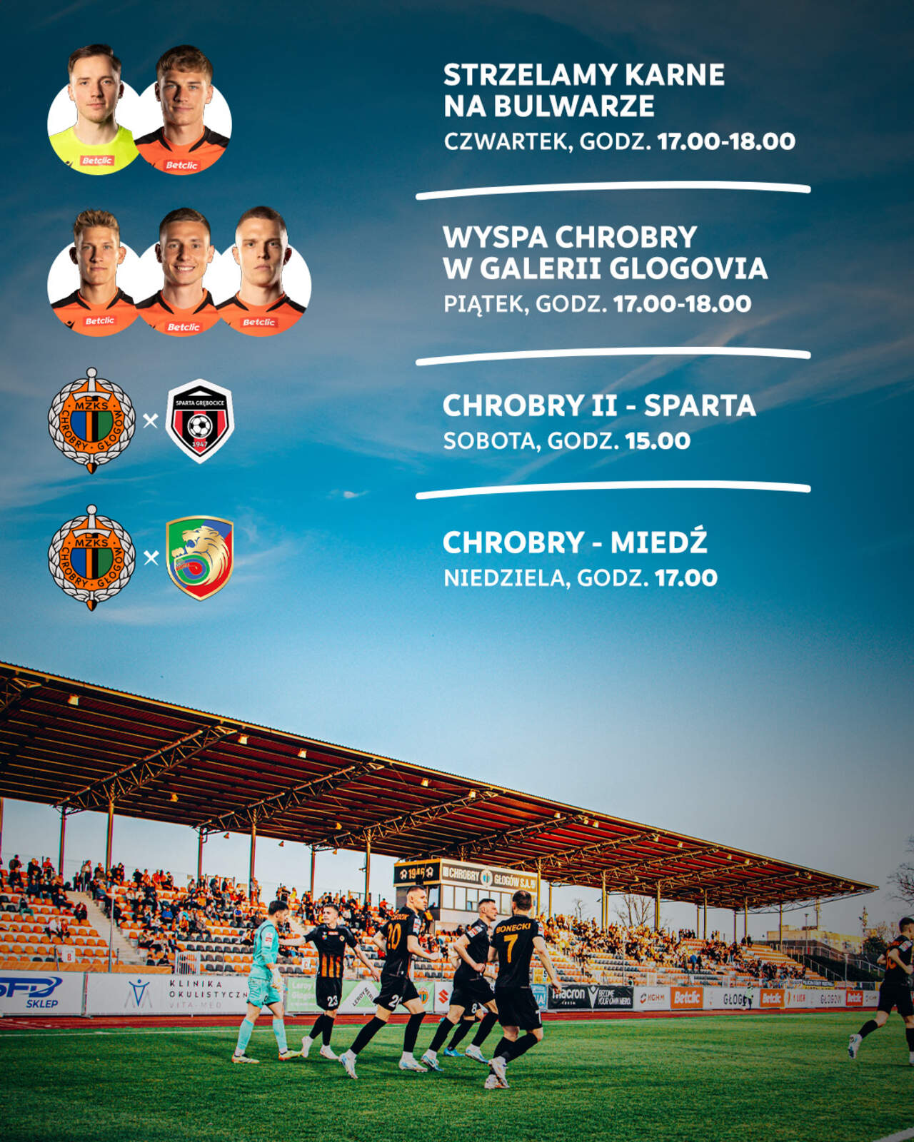 Nie tylko derby Plan na ten tydzień jest intensywny. Sprawdźcie, gdzie jeszcze - poza niedzielnymi derbami - spotkacie się z Pomarańczowo-Czarnymi. 23-04-2025 11:43 autor: ŁJ Czwartek 17.00 - 18.00: strzelamy karne na Bulwarze Nadodrzańskim. Będą z nami Paweł Lenarcik i Kacper Tabiś oraz Tygrysek. Do wygrania bilety na mecz z Miedzią i klubowe upominki. Piątek 17.00 - 18.00: o godz. 9.00 otwieramy klubową wyspę w Galerii Glogovia. Odwiedźcie ten punkt, a już na pewno w godz. 17.00 - 18.00, kiedy to pojawią się tam nasi piłkarze: Mateusz Lewandowski, Paweł Tupaj oraz Mateusz Ozimek. Sobota 15.00: mecz Chrobry II Głogów - Sparta Grębocice w Koleje Dolnośląskie 4 Lidze. Spotkanie odbędzie się na II płycie. Wstęp jest bezpłatny. Niedziela 17.00: derby, czyli mecz, na którym zawsze obecność jest obowiązkowa! Chrobry Głogów - Miedź Legnica w Betclic 1 Lidze na dobry koniec tygodnia, w niedzielę o godz. 17.00 na Wita Stwosza. Bilety na www.bilety.chrobry-glogow.pl.