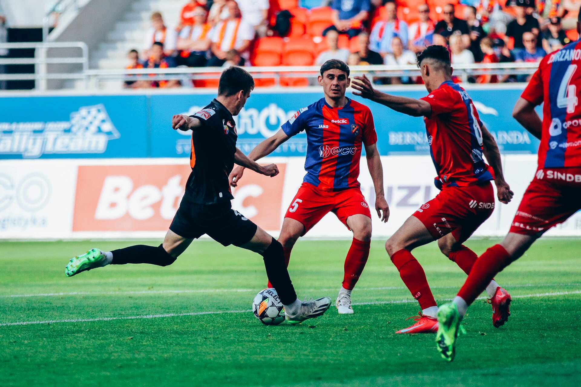 Chrobry kończy z trzema punktami Trudny sezon zakończony dobrą serią Pomarańczowo-Czarnych, którzy pokonując Odrę Opole 2:0 zaliczają trzecie spotkanie z rzędu bez porażki. 25-05-2025 07:26 autor: ŁJ Mecz aktywniej zaczęła Odra, która już w pierwszej minucie stanęła przed dużą szansą. Na strzał zdecydował się Szymon Kobusiński, a piłka trafiła w słupek. W kolejnej sytuacji opolan interweniować musiał Dawid Arndt broniący uderzenie Szymona Szklińskiego. Po drugiej stronie próbował inny… Szymon – Bartlewicz. W tej połowie oddał trzy strzały zza szesnastki i zwłaszcza po tym trzecim był blisko wpisania się na listę strzelców – mowa o 36 minucie, kiedy to futbolówka obiła słupek bramki gospodarzy. Druga część zaczęła się od zagrożenia miejscowych, którzy mogli wykorzystać stały fragment gry. W 52 minucie na strzał z rzutu wolnego zdecydował się Adam Chrzanowski, lecz Dawid Arndt był na posterunku. Po kilku kolejnych minutach akcja przeniosła się na drugą stronę, gdzie sam na sam wychodził Patryk Szwedzik, posyłając piłkę tuż obok słupka. Chrobry coraz bardziej napierał i stwarzał kolejne okazje. Mateusz Abramowicz w efektowny sposób przerzucił piłkę po główce Kacpra Tabisia, ale ostatecznie skapitulował w ostatnim kwadransie. I to dwukrotnie. W 79 minucie na 0:1 trafił Szymon Bartlewicz poprawiający wcześniejszą próbę Tabisia. 120 sekund później było już 0:2, gdy po dograniu od Bartlewicza wstrzelił się wchodzący na boisko w drugiej połowie Mateusz Ozimek. Odra była w stanie odpowiedzieć już tylko nieuznanym golem będącego na spalonym Oskara Zawady. W efekcie dobrej postawy głogowian, zwłaszcza w ostatnich kilkudziesięciu minutach, trzy punkty jadą do Głogowa.