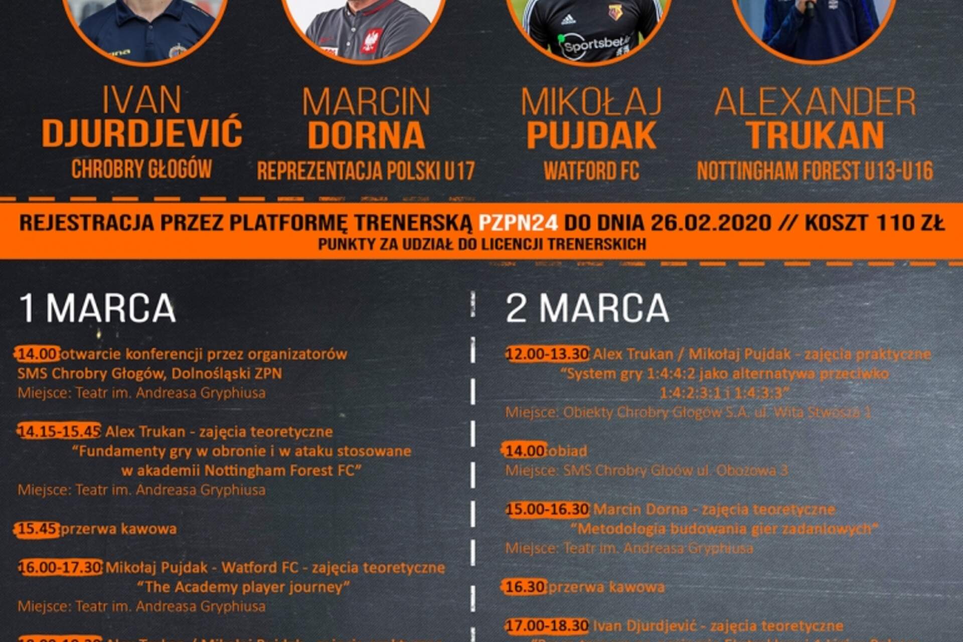Ostatnie 2 dni zapisów na konferencję Jeszcze tylko 2 dni potrwają zapisy na konferencję szkoleniową, która w dniach 1-2 marca odbędzie się w Głogowie. Rejestracja uczestników odbywa się przez platformę trenerską PZPN 24 do 26 lutego.Przypomnijmy, że konferencję… 25-02-2020 11:03 autor: ŁJ Jeszcze tylko 2 dni potrwają zapisy na konferencję szkoleniową, która w dniach 1-2 marca odbędzie się w Głogowie. Rejestracja uczestników odbywa się przez platformę trenerską PZPN 24 do 26 lutego.Przypomnijmy, że konferencję poprowadzą trener Chrobrego Ivan Djurdjević, trener reprezentacji Polski U-17 Marcin Dorna, trener Mikołaj Pajdak z Watford FC i trener Aleksander Trukan z Nottingham Forest. Zajęcia o charakterze teoretycznym i praktycznym odbędą się w Teatrze im. Andreasa Gryphiusa i na obiektach Chrobrego Głogów.To pierwsze takie wydarzenie piłkarskie w Głogowie. Dwudniową konferencją organizują Wydział Szkolenia Dolnośląskiego ZPN, Dolnośląskie Stowarzyszenie Trenerów i Instruktorów Piłki Nożnej, SMS Chrobry Głogów, Chrobry Głogów i Gmina Miejska Głogów przy wsparciu marki Zina.Konferencja jest kończona uzyskaniem certyfikatu uczestnictwa na profilu trenerskim oraz zaliczeniem 6 godzin do przedłużenia licencji.Odpłatność za szkolenie wynosi 110 zł z płatnością na konto:61 8669 0001 2020 0218 3776 0006z dopiskiem imię i nazwisko uczestnika, konferencja Głogów 1-2.03.2020.Osoby chcące otrzymać fakturę muszą w przelewie wpisać dane do faktury.1 marca14.00 otwarcie konferencji przez organizatorów SMS Chrobry Głogów, Dolnośląski ZPNMiejsce: Teatr im. Andreasa Gryphiusa14.15-15.45 Alex Trukan - zajęcia teoretyczne "Fundamenty gry w obronie i w ataku stosowane w akademii Nottingham Forest FC"Miejsce: Teatr im. Andreasa Gryphiusa15.45 przerwa kawowa16.00-17.30 Mikołaj Pujdak - Watford FC - zajęcia teoretyczne"The Academy player journey"Miejsce: Teatr im. Andreasa Gryphiusa18.00-19.30 Alex Trukan / Mikołaj Pujdak - zajęcia praktyczne "Fundamenty gry w obronie stosowane w akademii Nottingham Forest FC"Miejsce: Obiekty Chrobry Głogów S.A. ul. Wita Stwosza 119.30 zakończenie I dnia konferencji2 MARCA12.00-13.30 Alex Trukan / Mikołaj Pujdak - zajęcia praktyczne"System gry 1:4:4:2 jako alternatywa przeciwko 1:4:2:3:1 i 1:4:3:3"Miejsce: Obiekty Chrobry Głogów S.A. ul. Wita Stwosza 114.00 obiad Miejsce: SMS Chrobry Głoów ul. Obozowa 315.00-16.30 Marcin Dorna - zajęcia teoretyczne"Metodologia budowania gier zadaniowych"Miejsce: Teatr im. Andreasa Gryphiusa16.30 przerwa kawowa17.00-18.30 Ivan Djurdjević - zajęcia teoretyczne"Praca trenera na poziomie Ekstraklasy i 1 Ligi w Polsce: stawianie celów, dobór środków, funkcjonowanie codzienne"Miejsce: Teatr im. Andreasa Gryphiusa18.30 zakończenie konferencji