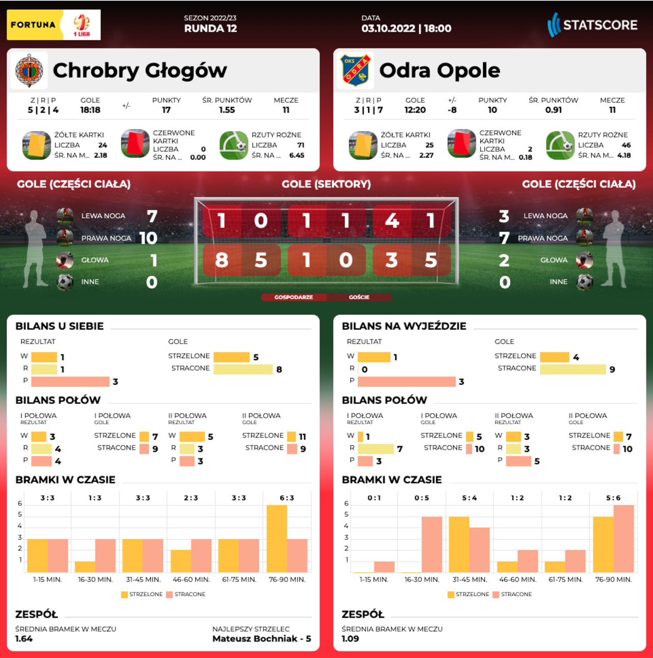 PN. 18.00: Chrobry Głogów - Odra Opole Po serii sześciu spotkań bez porażki Chrobry zagra z Odrą Opole, z którą ubiegłosezonowa rywalizacja była bardzo zacięta. Mecz 12 kolejki Fortuna 1 Ligi już dziś o godz. 18.00 na stadionie przy Wita Stwosza. 03-10-2022 12:05 autor: ŁJ O ile Chrobry na sześć ostatnich spotkań wygrał w pięciu, o tyle Odra tylko w dwóch. Opolanie mają więc trudniejszą sytuację w tabeli i zajmują w niej 17 miejsce. Właśnie dlatego, że próbują opuścić strefę spadkową powoduje, że należy spodziewać się twardej rywalizacji. Taka była pomiędzy Chrobrym i Odrą w ubiegłym sezonie. Oba zespoły awansowały do baraży, a na jesienną porażkę w Opolu 1:0, Pomarańczowo-Czarni odpowiedzieli wygraną w rundzie wiosennej w takich samych rozmiarach po golu Mateusza Bochnaka. 02-10-2022 #CHRODR: przed tym meczem szczególna ostrożność Choć Odra Opole zajmuje 17 miejsce w tabeli, trzeba zachować szczególną ostrożność przed tym meczem. Tym bardziej, że wcześniejsze spotkania z innymi zespoła... Mimo tak bardzo różniącej się dyspozycji w ostatnich kolejkach, podobieństwem przemawiającym za zaciętym pojedynkiem są wyniki ostatniej serii. Odra pokonała Skrę Częstochowa 1:0 po bramce Mateusza Kamińskiego w 84 minucie, a Chrobry komplet punktów w Gdyni również zgarnął w końcówce – po trafieniu Miłosza Jóźwiaka w doliczonym czasie. Mecz z Odrą to dla Chrobrego duża szansa. Podtrzymanie bardzo dobrej serii i kolejne zwycięstwo da głogowianom awans do pierwszej czwórki. To byłaby najwyższa pozycja Chrobrego od rundy wiosennej ubiegłego sezonu, więc jest o co walczyć. Bilety na mecz do momentu rozpoczęcia spotkania dostępne są na bilety.chrobry-glogow.pl (bilety ulgowe 7 zł / bilety normalne 15 zł) i do godziny przed rozpoczęciem spotkania w kasach pływalni Chrobry (bilety ulgowe 10 zł / bilety normalne 20 zł). Kasa stadionu otwarta zostanie na godzinę przed meczem, a w niej bilety będą w cenach: ulgowe 15 zł / normalne 25 zł. Dzieci do 7 roku życia na stadion wchodzą za darmo. Transmisja z meczu w Polsat Box Go. Możesz też aktywować jednorazowy dostęp do meczu - PRZEJDŹ DO STRONY TRANSMISJI O KLUBIE Pełna nazwa: OKS Odra Opole Spółka Akcyjna Rok powstania: 1945 Adres: Oleska 51, 45-231 Opole Internet: www.oksodraopole.pl (oficj.) Barwy: niebiesko-czerwone Sukcesy: - 3. miejsce w I lidze - 1963/64 - 3. miejsce w Pucharze Polski - 1961/62 - 1/2 finału Pucharu Polski - (4x) - 1954/55, 1966/67, 1980/81, 2000/01 Stadion: - Stadion Miejski Odra - pojemność - 3300 miejsc - oświetlenie - 1600 lx - boisko - 105 x 72m Bramkarze: Artur Haluch (95), Dominik Kalinowski (98), Błażej Sapielak (03). Obrońcy: Mateusz Kamiński (88), Łukasz Kędziora (98), Konrad Kostrzycki (96), Bernard Petrak (99), Mateusz Spychała (98), Jakub Szrek (97), Maksymilian Tkocz (02), Piotr Żemło (95). Pomocnicy: Stanisław Hrebeń (99), Michal Klec (95), Antoni Klimek (02), Mikołaj Łabojko (01), Szymon Łapiński (00), Maciej Makuszewski (89), Mateusz Marzec (94), Tomáš Mikinic (92), Rafał Niziołek (89), Konrad Nowak (94), Oskar Paprzycki (98), Maksymilian Paszkowski (04), Maciej Urbańczyk (95), Maciej Wróbel (03). Napastnicy: Michał Bednarski (96), Dawid Czapliński (92), Bartosz Guzdek (02). Trener: Piotr Plewnia.