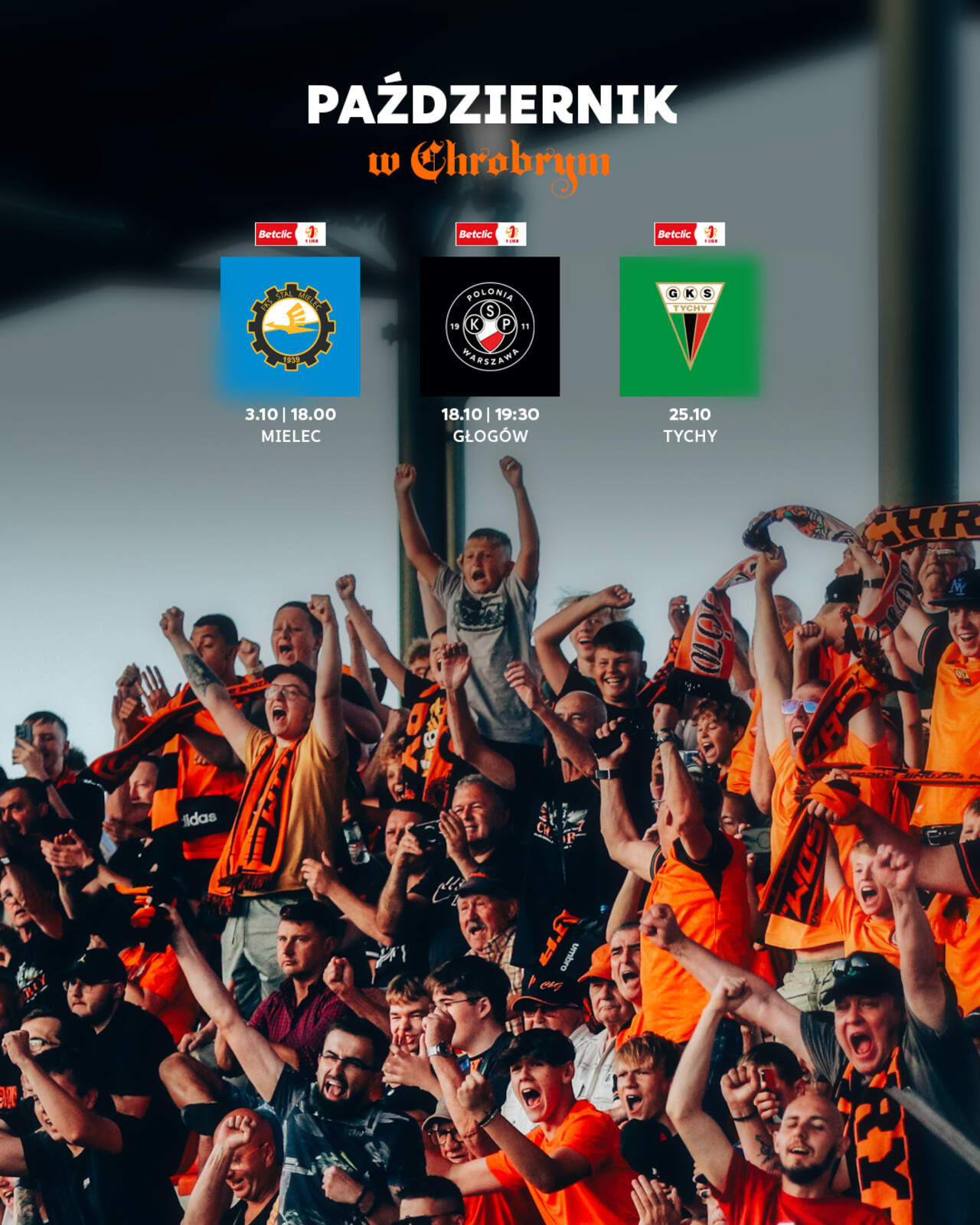 Październik w Chrobrym Wkraczamy w październik, w którym zagramy trzykrotnie. Pierwszy mecz już w piątek w Mielcu, po którym nastąpi przerwa reprezentacyjna i dopiero po niej odbędą się dwa kolejne spotkania. 01-10-2025 07:13 autor: ŁJ Piątek, 3 października 18.00 Stal Mielec - Chrobry Głogów (Mielec, Betclic 1 Liga) Sobota, 18 października 19.30 Chrobry Głogów - Polonia Warszawa (Głogów, Betclic 1 Liga) 25 października GKS Tychy - Chrobry Głogów (Tychy, Betclic 1 Liga)* *dokładny termin zostanie wyznaczony przez Departament Rozgrywek Krajowych PZPN