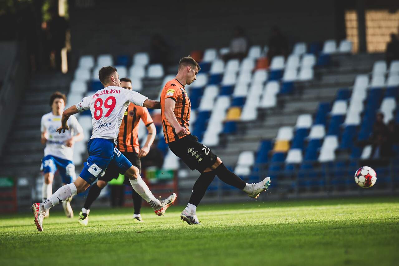 Przełamanie Chrobrego i Mikołaja Lebedyńskiego Po siedmiu meczach bez wygranej Chrobry wreszcie z kompletem punktów. Po bramce Mikołaja Leebedyńskiego, też pierwszej po siedmiu występach bez wpisania się na listę, Pomarańczowo-Czarni pokonali Podbeskidzie 1:0. 20-05-2024 07:50 autor: ŁJ Pierwsze fragmenty należały do gospodarzy, czego dokumentacją był groźny, choć niecelny strzał Miroslava Ilicicia z 12 minuty. Potem inicjatywę przejął Chrobry. W 20 minucie po ładnej akcji z podaniem Mikołaja Lebedyńskiego do Pawła Tupaja i uderzeniem tego drugiego piłka poszybowała nad poprzeczką. W 30 minucie po wrzutce Mateusza Machaja z rzutu rożnego niecelnie główkował Albert Zarówny. Inny z młodzieżowców, Szymon Bartlewicz, dwukrotnie próbował pokonać bramkarza rywali, ale nic z tego. A w 39 minucie długo wyczekiwanego gola z rzutu wolnego mógł zdobyć Mateusz Machaj, jednak skutecznie interweniował Patryk Procek. Na półmetku mieliśmy całkiem sporo szans głogowian, lecz bezbramkowy remis. Efektownie w drugą część mógł wejść Chrobry, a zwłaszcza znany z tych efektów Szymon Bartlewicz. Piłkę na niego posłał Mateusz Machaj, a Bartlewicz uderzał z powietrza, ale ta przeszła obok słupka. W 58 minucie golkiper Podbeskidzia stanął na przeszkodzie strzelającemu z ostrzejszego kąta Mikołajowi Lebedyńskiemu. Godzina gry, a nic nie chciało wpaść. Próbowało także Podbeskidzie, choć nie tak często. Zagrożenie stworzyło już po 60 minucie, gdy Damiana Węglarza próbował pokonać były gracz Pomarańczowo-Czarnych Maksymilian Banaszewski. Futbolówka nie zmierzała jednak w światło bramki, choć głogowski bramkarz dla spokoju i tak interweniował. Wreszcie, w 69 minucie, piłka znalazła drogę do bramki. Zaczęło się od Patryka Muchy, który z rzutu wolnego dośrodkował w pole karne. Bramkarz Górali co prawda odważnie wypiąstkował, ale w odpowiednim miejscu był Szymon Lewkot. To on strzelił jako pierwszy i choć piłkę wybito sprzed linii, w innym właściwym miejscu był Mikołaj Lebedyński, który tym samym zdobył swojego 11. gola w sezonie. Ta bramka przesądziła o wygranej Chrobrego, ale pomogła też defensywa. W 87 minucie widowiskową akcję przeprowadzili miejscowi. Zamykał ją Maksymilian Sitek, a po obronie Damiana Węglarza futbolówkę wybijano już z linii bramkowej. Ostatecznie głogowianie dowieźli ten wynik do końca i wracają do siebie z kompletem. W niedzielę 26 maja ostatni występ tego sezonu. O godz. 15.00 Chrobry na swoim stadionie zmierzy się z Zagłębiem Sosnowiec. Fot. 400mm.pl