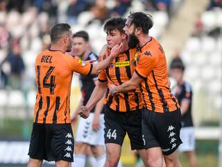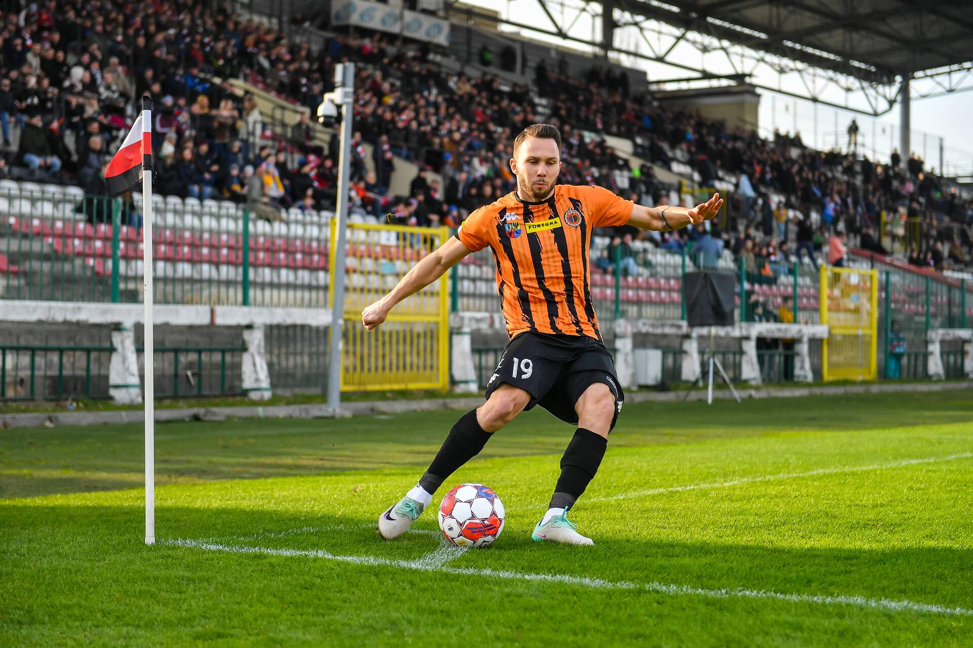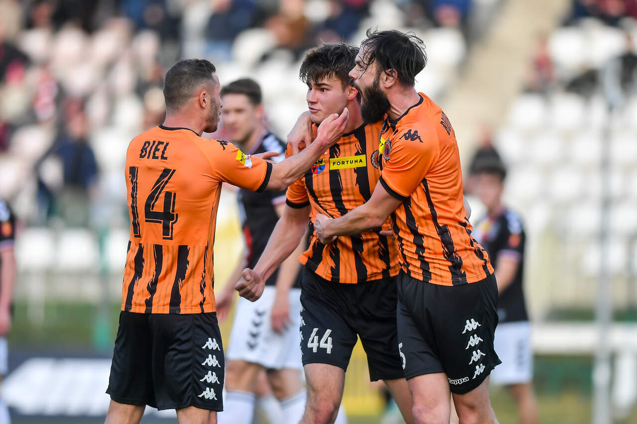 Plan minimum wykonany Chrobry z kolejnym punktem na swoim koncie po remisie 1:1 z Polonią Warszawa. 03-03-2024 04:03 autor: ŁJ Już w 2 minucie głogowianie sprawdzili bramkarza Polonii, kiedy po wrzutce Patryka Muchy z rzutu rożnego główkował Mikołaj Lebedyński. Piłka padła łupem Krzysztofa Bąkowskiego i po tym inicjatywę zaczęli przejmować gospodarze. W 9 minucie po dośrodkowaniu z lewej strony głową Damiana Węglarza pokonał Xabi Auzmendi i dość szybko zrobiło się dla Chrobrego niebezpiecznie. Po tym golu Chrobry nie miał łatwo z atakami, ale wywalczył korner i zrobił z niego użytek. W 28 minucie znów z narożnika futbolówkę posłał Patryk Mucha, a z kilku metrów do bramki głową wpakował ją Albert Zarówny, tym samym zdobywając swojego drugiego gola w pomarańczowo-czarnych barwach. Na remisie pierwsza odsłona dobiegła końca. Zza szesnastki w światło bramki uderzał jeszcze Robert Mandrysz, a ostatecznie nieuznanego gola zdobył Jakub Kuzdra, i ogółem Chrobry po wyrównaniu stał się aktywniejszy, ale remis po gorszym początku był jak najbardziej do przyjęcia. W drugich 45 minutach Chrobry zaatakował. Na zegarze nie było 60 minuty, a już miał dwie świetne okazje. Najpierw po podaniu Roberta Mandrysza strzelał Mikołaj Lebedyński, któremu na przeszkodzie stanął broniący Krzysztof Bąkowski. Bramkarz Polonii był też bohaterem kolejnej akcji głogowian, gdy po rzucie rożnym uderzali Lebedyński z Bartlewiczem i mimo tego ostrzeliwania golkiper gospodarzy pozostał niepokonany. Wydawało się, że gra toczy się na warunkach Chrobrego, który może już tak bardzo nie zagroził Czarnym Koszulom, ale był wyraźnie aktywniejszy z przodu i częściej gościł pod bramką przeciwników. Więc gdy sędzia zagwizdał po raz ostatni, ten mecz - oceniając go z gry i osiągniętego punktu - bardziej powinien zadowolić głogowian. W sobotę kolejne „bezpośrednie” starcie, tym razem ze Stalą Rzeszów na Wita Stwosza. Fot. 400mm.pl
