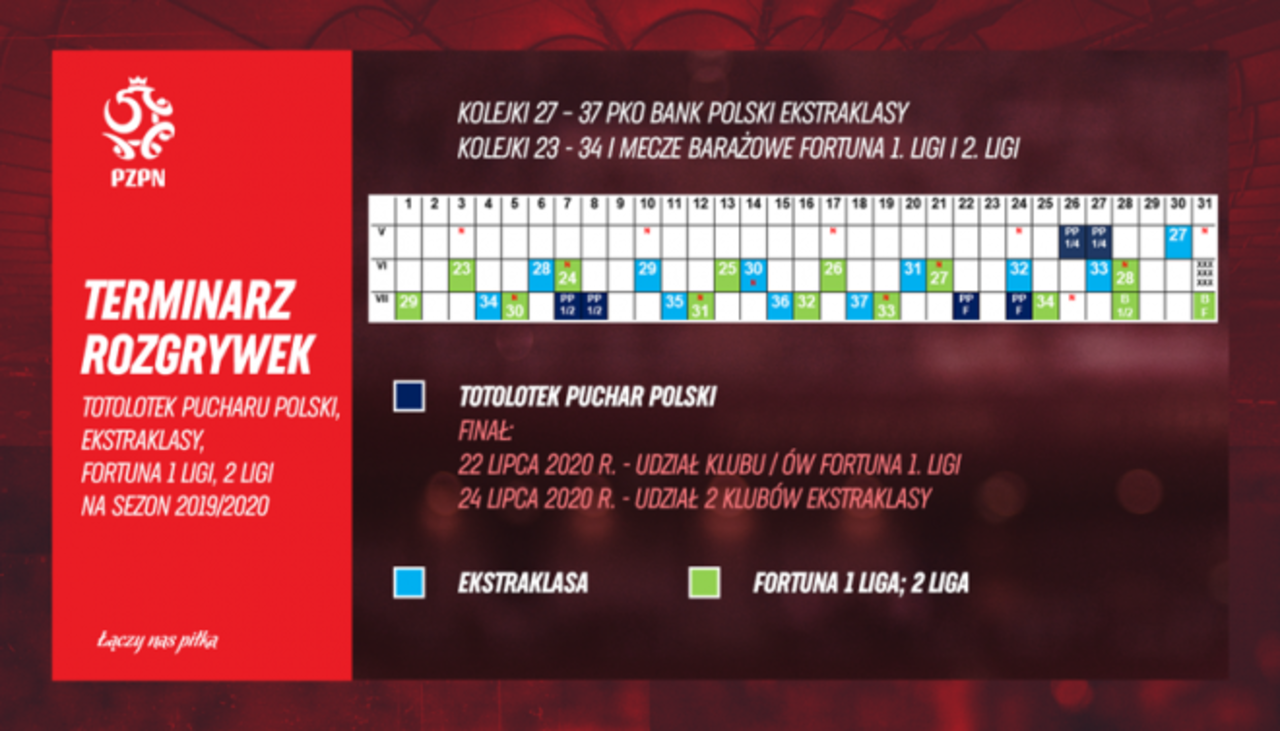 Powrót za 21 dni! Wznowienie rozgrywek Fortuna 1 Ligi zaplanowano na dni 2-3 czerwca (wtorek / środa), a zainauguruje je odwołana w marcu 23 kolejka. Chrobry tego dnia zmierzy się na wyjeździe ze Stomilem Olsztyn. Ramowy terminarz dokończenia sezonu… 13-05-2020 03:13 autor: ŁJ Wznowienie rozgrywek Fortuna 1 Ligi zaplanowano na dni 2-3 czerwca (wtorek / środa), a zainauguruje je odwołana w marcu 23 kolejka. Chrobry tego dnia zmierzy się na wyjeździe ze Stomilem Olsztyn. Ramowy terminarz dokończenia sezonu przedstawił dziś Polski Związek Piłki Nożnej.Plan zakłada, że ostatnia kolejka odbędzie się 25 lipca.Terminarz Fortuna 1 Ligi (podkreślono terminy w środku tygodnia)Kolejka 23 - 3 czerwcaStomil Olsztyn - Chrobry GłogówKolejka 24 - 6/7 czerwcaChrobry Głogów - GKS BełchatówKolejka 25 - 13/14 czerwcaRadomiak Radom - Chrobry GłogówKolejka 26 - 17 czerwcaChrobry Głogów - GKS JastrzębieKolejka 27 - 20/21 czerwcaOdra Opole - Chrobry GłogówKolejka 28 - 27/28 czerwcaChrobry Głogów - Sandecja Nowy SączKolejka 29 - 1 lipcaWarta Poznań - Chrobry GłogówKolejka 30 - 4/5 lipcaZagłębie Sosnowiec - Chrobry GłogówKolejka 31 - 11/12 lipcaChojniczanka Chojnice - Chrobry GłogówKolejka 32 - 16 lipcaStal Mielec - Chrobry GłogówKolejka 33 - 19 lipcaChrobry Głogów - Wigry SuwałkiKolejka 34 - 25 lipcaPodbeskidzie Bielsko-Biała - Chrobry Głogów