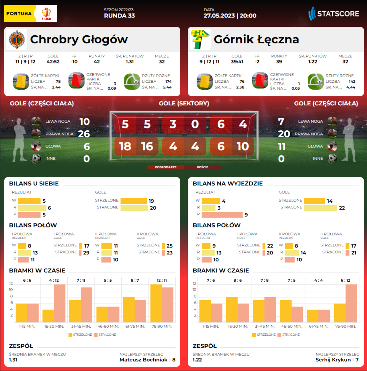 DZIEŃ MECZU: Chrobry Głogów - Górnik Łęczna Po raz ostatni w tym sezonie widzimy się na Wita Stwosza. O godz. 20.00 rozpocznie się mecz 33 kolejki Fortuna 1 Ligi z Górnikiem Łęczna. 27-05-2023 12:13 autor: ŁJ Chrobry przed kilkoma dniami pokonując Skrę Częstochowa zapewnił sobie utrzymanie w lidze. Taki wynik spowodował, że również jego rywal – Górnik Łęczna jest pewny pozostania na tym poziomie. Teraz obie ekipy po prostu rywalizują o jak najwyższe miejsce na koniec rozgrywek. Pomarańczowo-Czarni, poza tym, że spróbują pójść za ciosem i po raz pierwszy w tym roku odnieść dwa zwycięstwa z rzędu, powalczą o utrzymanie obecności w górnej połowie tabeli. Chrobry jest dziewiąty z dorobkiem 42 punktów. Górnik jest jedenasty i ma na swoim koncie trzy oczka mniej, więc pod względem umiejscowienia ten pojedynek ma znaczenie i może dostarczyć emocji. Mecz podwójnie szczególny: ostatni przy #WS3 i z dedykacją dla obchodzącego jubileusz naszego KKN-u.🆚 Górnik Łęczna🏆 Fortuna 1 Liga🚩 #WS3🕐 20.00🎟 https://t.co/XGom9SiqpC📺 Polsat Box Go / PPV: https://t.co/bixGsfC9a1💰 Zerknij na ofertę: https://t.co/Ialsx2mmSM pic.twitter.com/kWvEP5Q803— Chrobry Głogów (@ChrobryGlogowSA) May 27, 2023 26-05-2023 Nasz rywal: Górnik Łęczna W sobotę po raz ostatni na stadionie w Głogowie, na który przyjeżdża trener Ireneusz Mamrot ze swoim Górnikiem Łęczna. Transmisja z meczu w Polsat Box Go. Możesz też aktywować jednorazowy dostęp do meczu - PRZEJDŹ DO STRONY TRANSMISJI O KLUBIE Pełna nazwa: Górnik Łęczna Spółka Akcyjna Rok powstania: 1979 Adres: Aleja Jana Pawła II 13, 21-010 Łęczna Internet: www.gornik.leczna.pl (oficj.) Barwy: zielono-czarne Sukcesy: 7. miejsce w I lidze - 2004/05 1/4 finału Pucharu Polski - (2x) - 2000/01, 2021/22 1/2 finału Pucharu Ekstraklasy - 2006/07 Stadion: - pojemność - 7200 miejsc - oświetlenie - 1400lx - boisko - 105x68m Bramkarze: Maciej Gostomski (88), Mikołaj Kiliszek (05) Tomasz Woźniak (02). Obrońcy: Marcin Biernat (92), Souleymane Cissé (99), Jonathan de Amo (90), Daniel Dziwniel (92), Viktor Lykhovydko (92), Karol Turek (00), Damian Zbozień (89). Pomocnicy: Jakub Bednarczyk (99), Jakub Czelej (97), Damian Gąska (96), Łukasz Grzeszczyk (87), Grzegorz Gulczyński (96), Miłosz Kozak (97), Egzon Kryeziu (00), Sergiy Krykun (96), Jakub Kwiatkowski (03), Szymon Lewkot (99), Michał Pawlik (95), Patryk Pierzak (03), Arkadiusz Pluta (04), Michał Steszuk (06), Łukasz Szramowski (02), Dawid Tkacz (05), Michał Wachowicz (07), Szymon Zabłotny (05), Kacper Żabiński (06). Napastnicy: Mateusz Golba (03), Karol Podliński (97), Hubert Sobol (00), Michał Szałachowski (04). Trener: Ireneusz Mamrot.