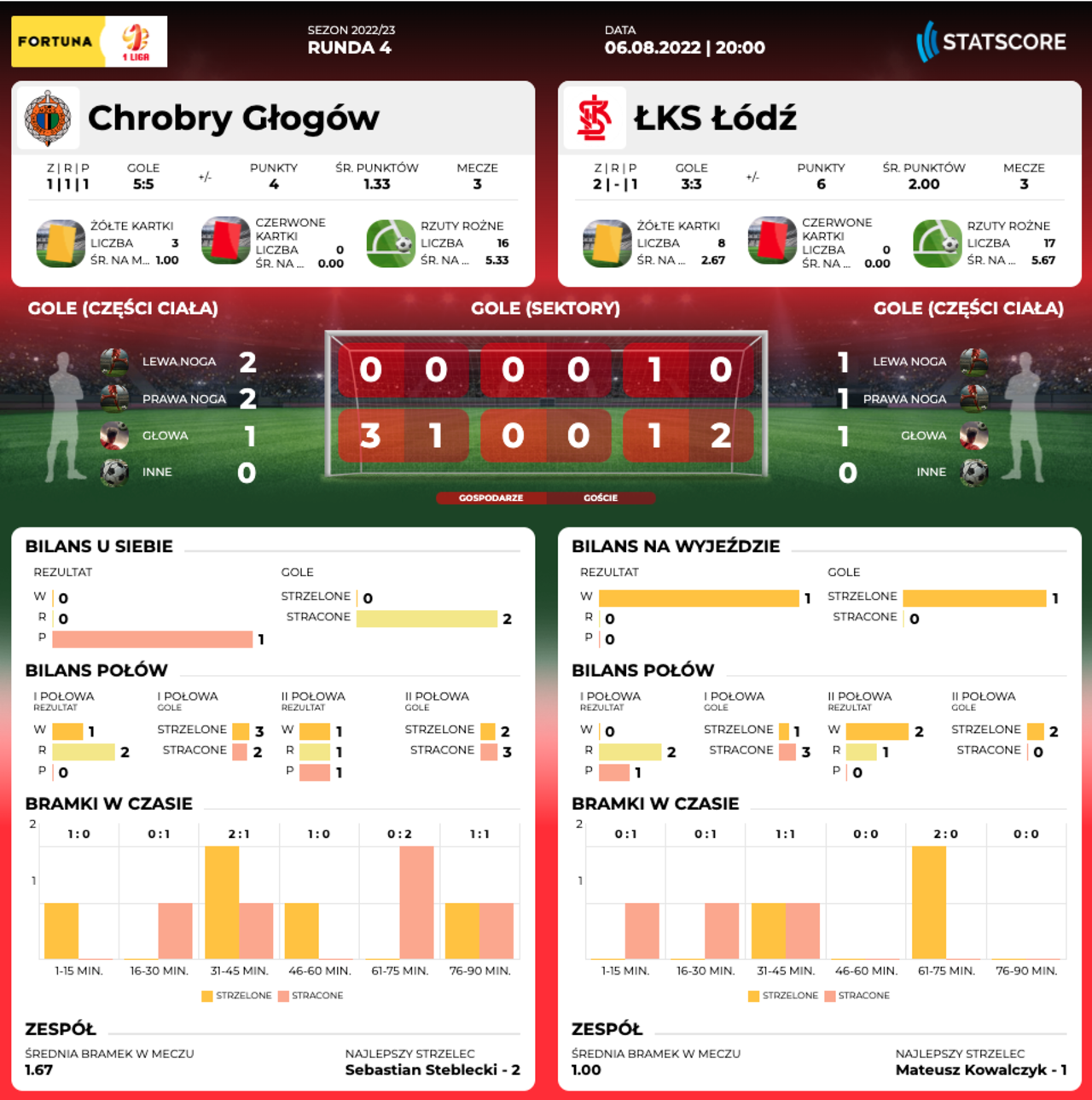 SB. 20.00: Chrobry Głogów - ŁKS Łódź Sobota, godz. 20.00, Wita Stwosza - podejmujemy ŁKS Łódź. 06-08-2022 04:13 autor: ŁJ Czwarty w sezonie, a drugi u siebie. O godz. 20.00 na stadionie przy Wita Stwosza rozpocznie się spotkanie 4 kolejki Fortuna 1 Ligi z ŁKS-em Łódź. Do tej pory głogowianie lepiej punktowali poza swoim terenem. W Rzeszowie zremisowali 3:3, a ostatnio w Chojnicach pokonując Chojniczankę 2:0 odnieśli pierwsze zwycięstwo sezonu. W międzyczasie w Głogowie przegrali z Ruchem Chorzów 0:2. Tym sposobem przed weekendową serią Chrobry ma 4 punkty i z tym dorobkiem zajmuje 10 miejsce w tabeli. ŁKS ma o dwa więcej i zamyka pierwszą piątkę. Zespół trenera Kazimierza Moskala w dotychczasowych spotkaniach przegrał na inaugurację z GKS-em Katowice 0:2, ale dwie ostatnie kolejki kończył z kompletem, wygrywając kolejno GKS-em Tychy 1:0 i Skrą Częstochowa 2:1. 04-08-2022 ŁKS w Głogowie po raz czwarty Przed sobotnim meczem z ŁKS-em Łódź opisujemy naszego rywala. Bilety na mecz do momentu rozpoczęcia spotkania dostępne są na bilety.chrobry-glogow.pl (bilety ulgowe 7 zł / bilety normalne 15 zł). Kasa stadionu otwarta zostanie na godzinę przed meczem, a w niej bilety będą w cenach: ulgowe 15 zł / normalne 25 zł / 0 zł to 7 roku życia. Transmisja z meczu w Polsat Box Go. Możesz też aktywować jednorazowy dostęp do meczu - PRZEJDŹ DO STRONY TRANSMISJI O KLUBIE Pełna nazwa: ŁKS Łódź Rok powstania: 1908 Adres: Aleja Unii Lubelskiej 2, 94-020 Łódź Internet: www.lkslodz.pl (oficj.) Barwy: biało-czerwono-białe Sukcesy: - Mistrzostwo Polski - 1958, 1997/98 - wicemistrzostwo Polski - 1954 - Puchar Polski - 1956/57 Stadion: - pojemność - 18 029 miejsc - oświetlenie - 2000 lx - boisko - 105 m x 68 m Bramkarze: Dawid Arndt (01), Aleksander Bobek (04), Michał Kołba (92), Marek Kozioł (88). Obrońcy: Mateusz Bąkowicz (01), Kamil Dankowski (96), Maciej Dąbrowski (87), Oskar Koprowski (99), Adam Marciniak (88), Nacho Monsalve (94). Pomocnicy: Bartosz Biel (94), Piotr Gryszkiewicz (01), Piotr Janczukowicz (00), Dawid Kort (95), Mateusz Kowalczyk (04), Jan Kuźma (03), Mikołaj Lipień (03), Mieszko Lorenc (01), Javi Moreno (97), Damian Nowacki (98), Vladyslav Okhronchuk (97), Pirulo (92), Jakub Romanowicz (00), Bartosz Szeliga (93), Jakub Tosik (87), Michał Trąbka (97), Marcel Wszołek (02). Napastnicy: Nelson Balongo (99), Dariusz Gmosiński (01), Kelechukwu Ibe-Torti (02), Stipe Juric (98), Maciej Radaszkiewicz (97), Ricardinho (89). Trener: Kazimierz Moskal.