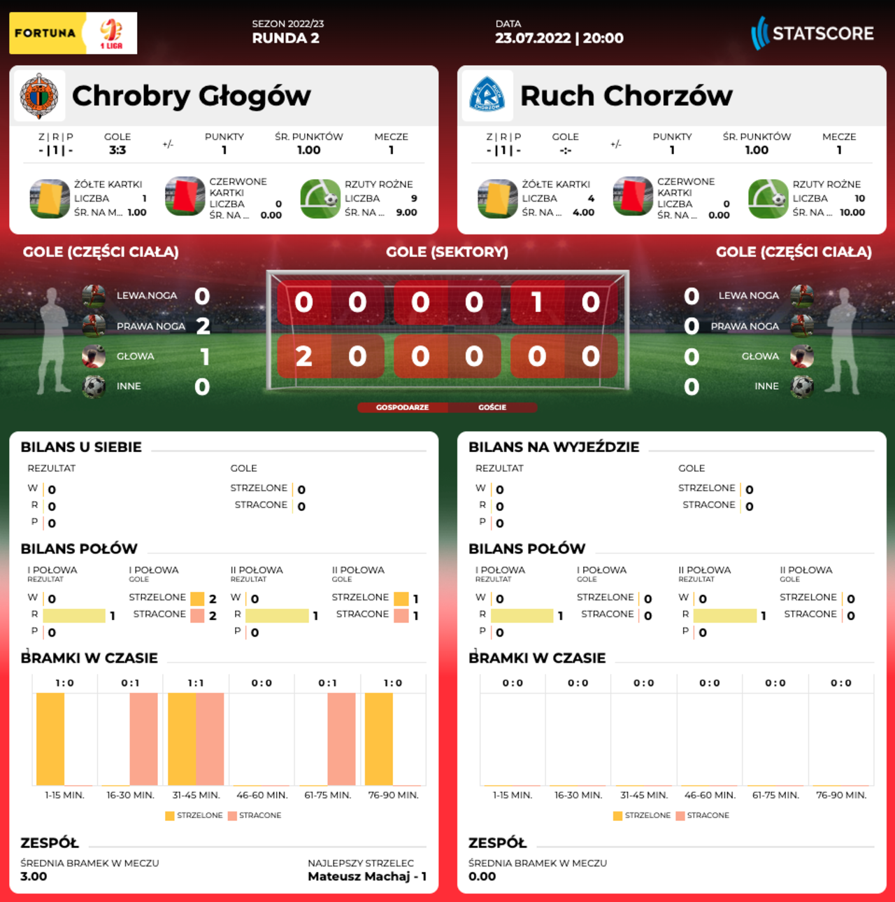 SB. 20.00: Chrobry Głogów - Ruch Chorzów Po raz drugi w sezonie, a po raz pierwszy u siebie. Dziś wieczorem gramy z Ruchem Chorzów. 23-07-2022 07:13 autor: ŁJ Po dwóch miesiącach przerwy wracamy na Wita Stwosza. O godz. 20.00 rozpocznie się mecz 2 kolejki Fortuna 1 Ligi z Ruchem Chorzów. Po inauguracji oba zespoły mają po punkcie. Chrobry wywiózł remis z Rzeszowa (3:3 ze Stalą), natomiast Ruch bezbramkowo zremisował ze Skrą Częstochowa. – Zabrakło trochę szczęścia. Myślę, że po tym spotkaniu zejdzie z nas trochę ciśnienia i w następnych będzie lepiej, zwłaszcza w przypadku wykończania akcji – komentował trener chorzowian Jarosław Skrobacz. Ligowy mecz wraca na Wita Stwosza po dwumiesięcznej przerwie, a rywalizacja z Ruchem po niemal pięcioletniej przerwie. Ostatni pojedynek odbył się w 2017 roku. W listopadzie Pomarańczowo-Czarni po bramce Mateusza Machaja w 90 minucie wygrali 1:0. Kilka miesięcy później Ruch jako spadkowicz z Ekstraklasy spadł po drugiej ligi, a jeszcze potem do trzeciej. Teraz jednak kurs obrócił o 180 stopni, a ciężej grać z drużynami w ten sposób rozpędzonymi, tym bardziej, że na starcie sezonu, tuż po awansie. O ile z tamtego meczu w kadrze Chrobrego pozostali Mateusz Machaj, Michał Ilków-Gołąb czy Michał Michalec, o tyle w szeregach Ruchu po tak dużych perturbacjach zespół, nie licząc klubowej młodzieży, zmienił się w stu procentach. Jego kapitanem jest doświadczony Tomasz Foszmańczyk, a zawodnikami z najbardziej rozbudowanymi CV Łukasz Janoszka z Maciejem Sadlokiem, którzy w sumie rozegrali prawie 600 meczów w Ekstraklasie. Poza tym obaj w Chorzowie występowali już w przeszłości w momencie, gdy klub był na najwyższym poziomie, a teraz po powrocie mogą pomóc nawiązać do lepszego dla Ruchu okresu. 18-07-2022 Chrobry - Ruch: bilety Bilety na mecz do momentu rozpoczęcia spotkania dostępne są w kasach pływalni Chrobry i na bilety.chrobry-glogow.pl. W kasach pływalni do godz. 19.00 oraz w internetowym systemie do samego meczu obowiązują korzystniejsze dla kibiców ceny przedsprzedażowe. Kasa stadionu otwarta zostanie na godzinę przed meczem i od tego momentu, włącznie z punktem w pływalni, bilety będą w cenach: ulgowe 15 zł / normalne 25 zł / 0 zł to 7 roku życia. Transmisja z meczu w Polsat Box Go. Możesz też aktywować jednorazowy dostęp do meczu - PRZEJDŹ DO STRONY TRANSMISJI Wszystkie spotkania Fortuna 1 Ligi możesz obstawiać na www.efortuna.pl Kurs w Fortunie, że Chrobry wygra z Ruchem wynosi 2.25. Fortuna online zakłady bukmacherskie sp. z o.o. to legalny bukmacher posiadający zezwolenia na urządzanie zakładów wzajemnych w Polsce. Udział w nielegalnych grach hazardowych grozi konsekwencjami prawnymi. Hazard związany jest z ryzykiem. O KLUBIE Pełna nazwa: Ruch Chorzów Spółka Akcyjna (Klub Sportowy Ruch w Chorzowie) Rok powstania: 1920 Adres: Cicha 6, 41-506 Chorzów Internet: ksruch.com (oficj.) Barwy: niebiesko-białe Sukcesy: - Mistrzostwo Polski - (14x) - 1933, 1934, 1935, 1936, 1938, 1951, 1952, 1953, 1960, 1967/68, 1973/74, 1974/75, 1978/79, 1988/89 - wicemistrzostwo Polski - (6x) - 1950, 1956, 1962/63, 1969/70, 1972/73, 2011/12 - Puchar Polski - (3x) - 1950/51, 1973/74, 1995/96 - finalista Pucharu Polski - (6x) - 1962/63, 1967/68, 1969/70, 1992/93 (rezerwy), 2008/09, 2011/12 - 1/4 finału Pucharu Ekstraklasy - 2008/09 - 1/4 finału Pucharu Europy Mistrzów Krajowych - 1974/75 - 1/4 finału Pucharu UEFA - 1973/74 - finalista UEFA Intertoto - 1998 Stadion: - Stadion Miejski - pojemność - 9300 miejsc - oświetlenie - 1715 lx - boisko - 107 m x 67 m Bramkarze: Jakub Bielecki (00), Tomasz Nowak (02), Jakub Osobiński (00). Obrońcy: Antoni Franke (06), Konrad Kasolik (97), Kacper Michalski (00), Filip Nawrocki (98), Maciej Sadlok (89), Przemysław Szur (96), Remigiusz Szywacz (95), Mateusz Wacławski (04). Pomocnicy: Kacper Bąk (04), Tomasz Foszmańczyk (86), Łukasz Janoszka (87), Mikołaj Kwietniewski (99), Łukasz Moneta (94), Krystian Mucha (04), Jakub Piątek (98), Maksymilian Roguła (03), Patryk Sikora (99), Tomasz Swędrowski (93), Mateusz Winciersz (00), Jakub Witek (02), Mateusz Wojtek (03), Tomasz Wójtowicz (03). Napastnicy: Bartłomiej Barański (06), Artur Pląskowski (93), Daniel Szczepan (95). Treener: Jarosław Skrobacz.