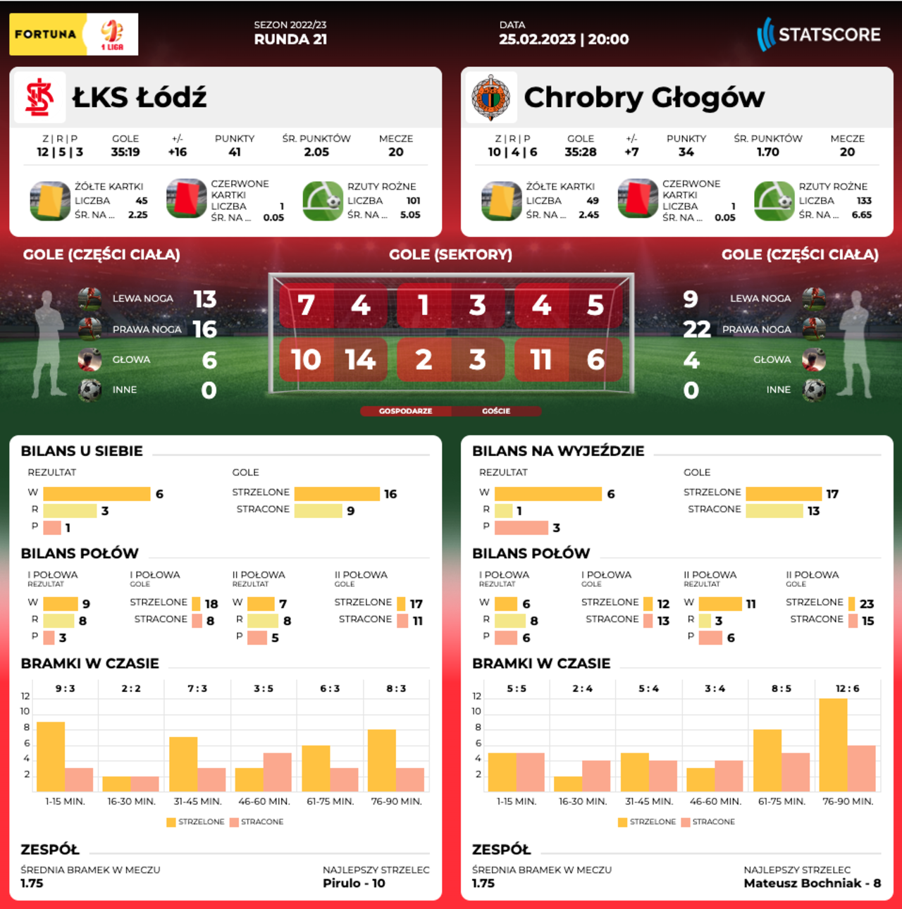 DZIEŃ MECZU: ŁKS ŁÓDŹ - CHROBRY GŁOGÓW Dziś wieczorem duży mecz. O godz. 20.00 w Łodzi rozpocznie się pojedynek ŁKS-u z Chrobrym. 25-02-2023 12:13 autor: ŁJ Od początku roku Chrobry ma mecze z zespołami grającymi o dużą stawkę. Rywalizował już i z walczącym o awans Ruchem Chorzów, i o utrzymanie Chojniczanką Chojnice, ale to ten trzeci tegoroczny pojedynek może uchodzić za najtrudniejszy. ŁKS jest liderem i zarazem zespołem niepokonanym przez 12 ostatnich kolejek. Na własnym stadionie poniósł tylko jedną porażkę, która zresztą miała miejsce całe miesiące temu, bo na inaugurację sezonu. Ma sporo, aby awansować do Ekstraklasy, od stadionu, przez bogatą historię po silną drużynę będącą w wysokiej, równej dyspozycji. 23-02-2023 Szykuje się widowisko. Przed #ŁKSCHR Najważniejsze i najciekawsze informacje przed sobotnim widowiskiem w Łodzi. Tyle że w Fortuna 1 Lidze nie wszystko jest tak oczywiste. Faworytem są gospodarze, ale głogowianie nie pojechali tam tylko nie przegrać. Tym bardziej, że z delegacji wracali już z sześcioma zwycięstwami, pokonując m.in. Arkę Gdynia. Może być łatwiej obstawić, że to będzie po prostu dobry do obejrzenia mecz. Obie drużyny mają po 35 zdobytych goli i są najskuteczniejsze w lidze, a pierwsze spotkania pomiędzy nimi zakończyło się na pięciu bramkach. Łodzianie mają Pirulo z 10 trafieniami, głogowianie z kolei bardzo skutecznego ze stałych fragmentów Mateusza Machaja czy Kamila Wojtyrę z trzema trafieniami w trzech ostatnich kolejkach. Co do widowiska, zgodni są trenerzy: - Będzie to fajne dla publiczności, otwarte widowisko, bo obie drużyny chcą grać w piłkę - powiedział trener Chrobrego Marek Gołębiewski. I wtóruje mu szkoleniowiec ŁKS-u Kazimierz Moskal, o czym mówił podczas przedmeczowej konferencji: - Słyszałem wypowiedź trenera Gołębiewskiego, zgadzam się i z mojej strony też jest chęć, abyśmy w tę piłkę grali. W tabeli pierwszy ŁKS ma 41 punktów. Trzeci w stawce Pomarańczowo-Czarni tracą do rywali siedem punktów. W ostatniej kolejce obie mierzyły się z drużynami walczącymi o utrzymanie i obie sprostały zadaniu. Chrobry jest po 3:1 z Chojniczanką, ŁKS natomiast pokonał Skrę 2:1, oba gole zdobywając w ciągu pierwszych 20 minut. Sędzią wieczornego meczu będzie Łukasz Szczech. Transmisja w Polsat Box Go. Transmisja z meczu w Polsat Box Go. Możesz też aktywować jednorazowy dostęp do meczu - PRZEJDŹ DO STRONY TRANSMISJI O KLUBIE Pełna nazwa: ŁKS Łódź Rok powstania: 1908 Adres: Aleja Unii Lubelskiej 2, 94-020 Łódź Internet: www.lkslodz.pl (oficj.) Barwy: biało-czerwono-białe Sukcesy: - Mistrzostwo Polski - 1958, 1997/98 - wicemistrzostwo Polski - 1954 - Puchar Polski - 1956/57 Stadion: - pojemność - 18 029 miejsc - oświetlenie - 2000 lx - boisko - 105 m x 68 m Bramkarze: Dawid Arndt (01), Aleksander Bobek (04), Michał Kołba (92), Marek Kozioł (88). Obrońcy: Mateusz Bąkowicz (01), Kamil Dankowski (96), Maciej Dąbrowski (87), Oskar Koprowski (99), Adam Marciniak (88), Nacho Monsalve (94), Artemijus Tutyskinas (03). Pomocnicy: Bartosz Biel (94), Piotr Janczukowicz (00), Dawid Kort (95), Mateusz Kowalczyk (04), Mikołaj Lipień (03), Mieszko Lorenc (01), Michał Mokrzycki (97), Damian Nowacki (98), Vladyslav Okhronchuk (97), Pirulo (92), Jakub Romanowicz (00), Milan Spremo (95), Bartosz Szeliga (93), Maciej Śliwa (01), Michał Trąbka (97), Marcel Wszołek (02). Napastnicy: Nelson Balongo (99), Grzegorz Glapka (02), Kelechukwu Ibe-Torti (02), Stipe Juric (98), Ricardinho (89). Trener: Kazimierz Moskal.