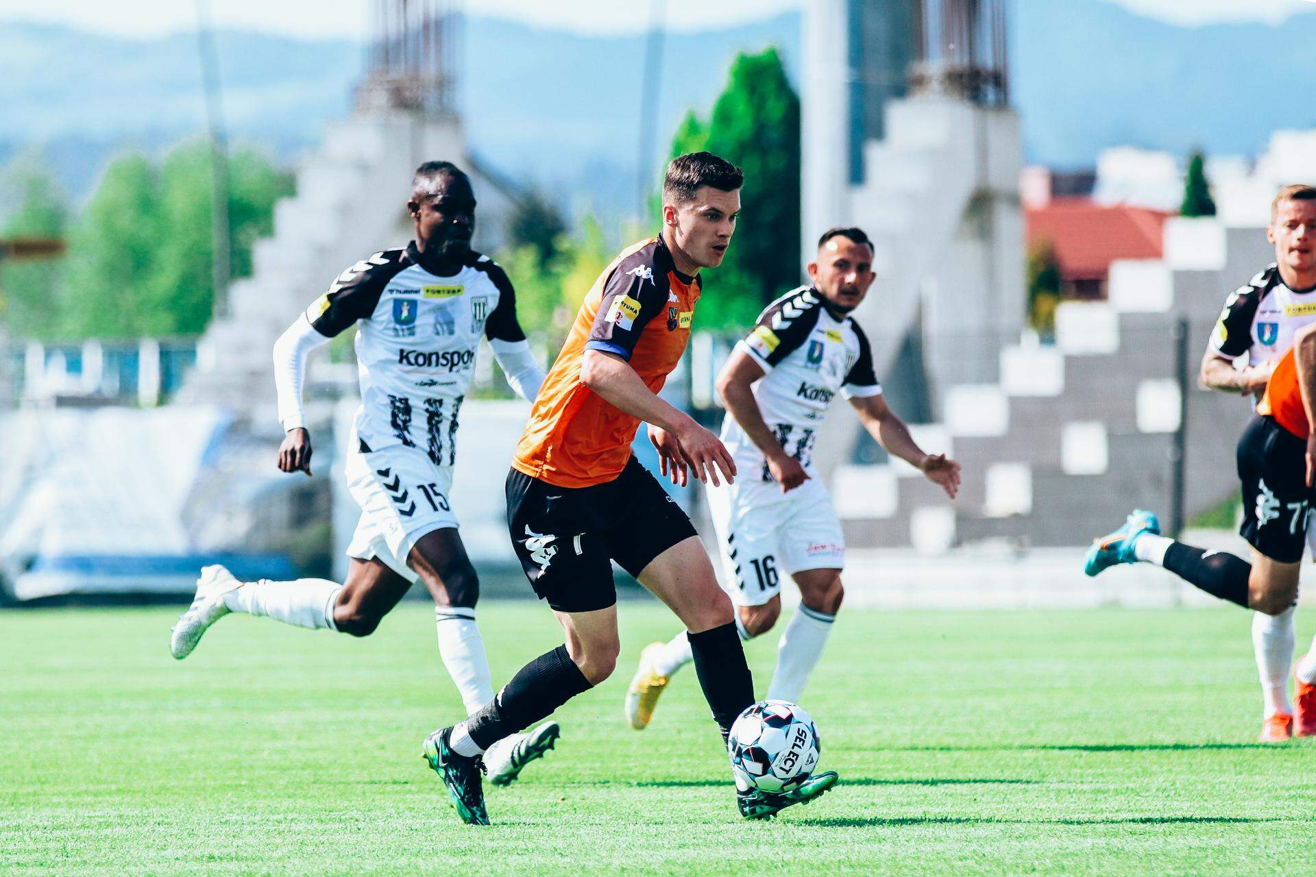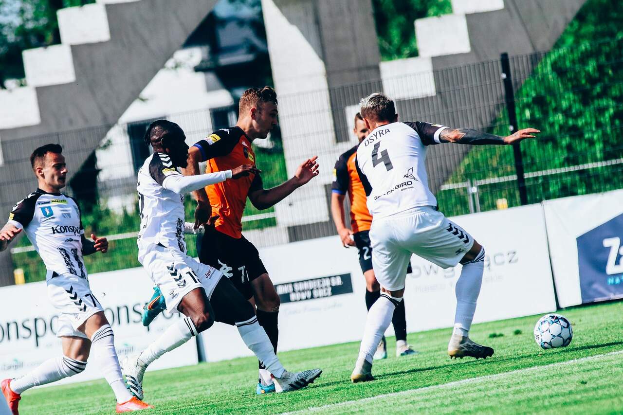 WSZYSTKO ROZSTRZYGNIE OSTATNIA KOLEJKA Po remisie w Nowym Sączu wszystkie emocje skierowane są na ostatnią kolejkę. 15-05-2022 04:49 autor: ŁJ Chrobry podzielił się punktami z Sandecją Nowy Sącz w meczu przedostatniej kolejki i sprawę baraży rozstrzygnie dopiero ta ostatnia. Mecz lepiej zaczęli gospodarze, którzy częściej znajdowali się na połowie swojego rywala. Chrobry jednak sprawnie opanował sytuację i dość szybka gra się wyrównała. Wtedy swoich szans szukali głogowianie, mając m.in. uderzenia z dystansu Roberta Mandrysza czy Michała Rzuchowskiego. Żaden nie mógł zaskoczyć bramkarza Sandecji, lecz w meczu o takim ciężarze gatunkowym ważna jest każda próba. Końcówka to znów optyczna przewaga miejscowych, którzy w 36 minucie mieli dobrą okazję na objęcie prowadzenia. Po dłużej rozegranym rzucie wolnym i posłanej wzdłuż bramki piłce z bliska starał się umieścić ją w środku Damian Chmiel, lecz Rafał Leszczyński nie dał się zaskoczyć. W przypadku Chrobrego szkoda 45 minuty, gdy o futbolówkę skutecznie powalczyli Mikołaj Lebedyński z Mateuszem Bochnakiem. Ten drugi ruszył wyżej, lecz niestety nie oddał czystego strzału z kilkunastu metrów, przez co piłka przeszła obok słupka Po przerwie przez jakiś czas obie strony dość długo miały po jednej niezłej okazji. W ekipie gospodarzy bardzo groźnie, choć niecelnie z dalszej odległości uderzył Tomasz Nawotka. Z kolei w Chrobrym strzał na bramkę oddał Mateusz Bochnak, lecz golkiper Sandecji wyszedł z tego obronną ręką. W 77 minucie czerwoną kartkę otrzymał Kamil Słaby, który wcześniej sfaulował na granicy linii pola karnego wychodzącego na czystą pozycję Michała Rzuchowskiego. Sędzia najpierw pokazał mu żółty kartonik, ale zdecydował się na analizę tej sytuacji za pośrednictwem VAR i ostatecznie usunął piłkarza gospodarzy. Tak czy inaczej zawodnik Sandecji być może zapobiegł w ten sposób utracie gola, bo rzutu wolnego Chrobry nie wykorzystał i po nim piłkę chwycił broniący Dawid Pietrzkiewicz. Z przewagą zawodnika Pomarańczowo-Czarni wyraźnie napierali, jednak mimo wielu prób nie udało się wypracować na tyle dużego zagrożenia, aby zdobyć zwycięskiego gola. Bez względu na wynik dzisiejszego spotkania ŁKS-u Łódź, o tym, kto znajdzie się w barażach wyjaśni dopiero ostatnia kolejka. W niedzielę 22 maja Chrobry podejmie w niej Zagłębie Sosnowiec. Początek o godz.12.40.