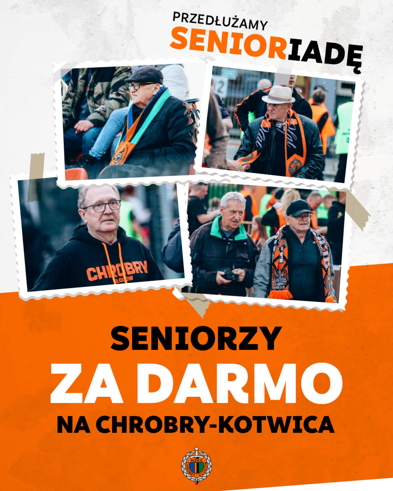 Seniorzy na piątkowy mecz za darmo! Choć kolejna edycja głogowskiej Senioriady już się zakończyła, przedłużamy ją o jeszcze jeden akcent. Seniorzy na piątkowy mecz Chrobrego Głogów z Kotwicą Kołobrzeg wejdą za darmo. 21-10-2024 02:04 autor: ŁJ Seniorzy są ważną częścią społeczności skupionej przy klubie. Są przy Chrobrym od lat, pamiętając jego najodleglejsze czasy, dzieląc się wspomnieniami oraz przekazując swoje przywiązanie i poszanowanie do barw innym pokoleniom. My zapraszamy ich do siebie jeszcze liczniej. Mecz Chrobrego z Kotwicą Kołobrzeg już w piątek 25 października o godz. 18.00. Z okazji głogowskiej Senioriady wszyscy seniorzy na to spotkanie wejdą za darmo. Jak wejść za darmo na #CHRKOT? - będąc urodzonym w 1964 roku i latach wcześniejszych (od 60. roku życia) - odbierając na podstawie dokumentu tożsamości bezpłatny bilet w kasach pływalni Chrobry (w okresie trwania przedsprzedaży, codziennie do czwartku 24 października włącznie) lub w kasach stadionu (w dniu meczu od godz. 17.00).