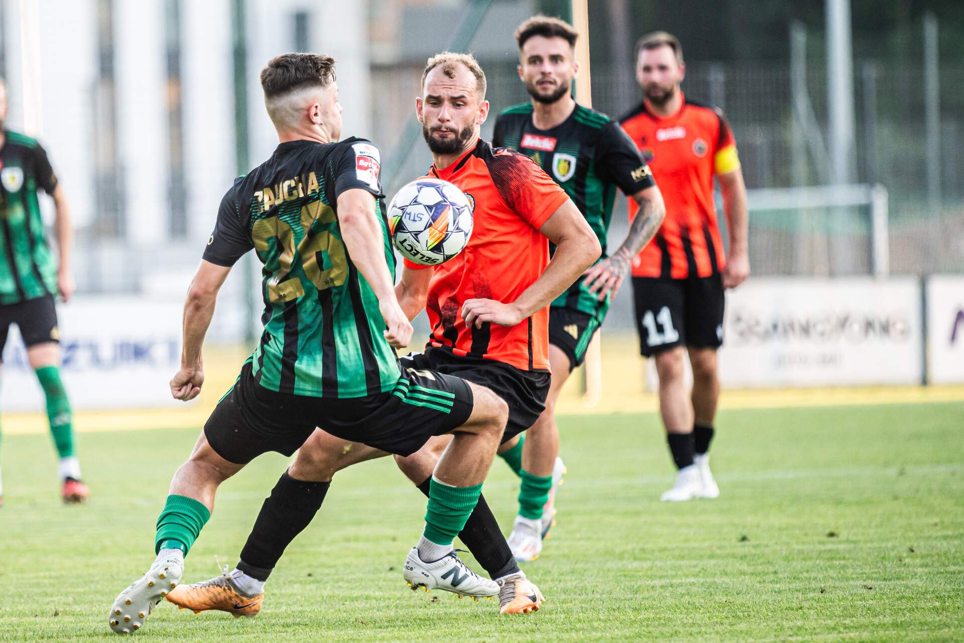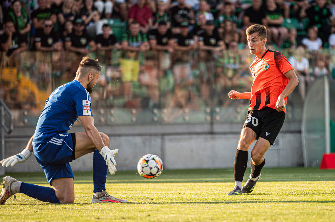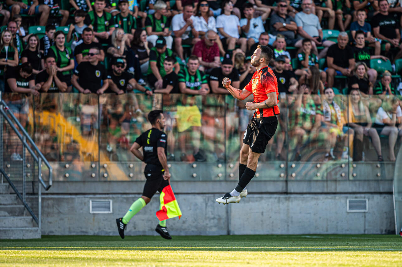 Punkt z dalekiej wyprawy do Stalowej Woli Dwa gola i dwa w pierwszej połowie. Chrobry remisuje ze Stalą Stalowa Wola 1:1. 16-08-2024 08:00 autor: ŁJ Ten mecz tak naprawdę na dobre rozpoczął się po 10 minucie. Po tym okresie groźnie zrobiło się za sprawą gości, którzy podeszli bardzo blisko bramki, ale po chwili Chrobry ruszył z bardzo efektowną kontrą. Piłkę przechwycił Sebastian Bonecki, oddał ją po chwili Szymonowi Bartlewiczowi, który świetnie odegrał do Patryka Muchy. Ten z kilkunastu metrów pokonał bramkarza Stali i od 14 minuty było 0:1. Po golu mocno pomógł w głogowskiej bramce Krzysztof Wróblewski, który w 17 minucie skutecznie interweniował po strzale Patryka Zauchy, a w 23 minucie po próbie Cypriana Pchełki. Na to błyskawicznie odpowiedział Chrobry, ruszający z kolejną kontrą w 24 minucie, którą - gdyby nie broniący Adam Wilk - wykończyłby Szymon Bartlewicz. 1:1 zrobiło się w 27 minucie. I było to trochę pechowe. Taką niefortunną interwencję zaliczył przy wrzutce z lewej strony Szymon Lewkot. Próbował wybić futbolówkę głową, ale zupełnie przypadkowo skierował ją do własnej bramki. Ten gol podbudował gospodarzy, którzy od tego momentu byli groźniejsi, choć w samej końcówce znów uaktywnił się Chrobry. W 41 minucie po dobrym podaniu na dobrej pozycji znalazł się Patryk Mucha, który miał przed sobą tylko bramkarza, ale to wszystko działo się na ostrym kącie i ostatecznie górą był golkiper Stali. Miejscowi mieli jeszcze świetną okazję na gola do szatni. W 45 minucie po ręce Szymona Lewkota w polu karnym sędzia wskazał na jedenastkę, której nie wykorzystał przestrzelający Adam Imiela. Przed tygodniem w meczu z GKS-em Tychy Krzysztof Wróblewski obronił rzut karny, teraz co prawda nie musiał, ale można powiedzieć, że w tym elemencie sprzyja Pomarańczowo-Czarnym. Po zmianie stron szkoda 57 minuty. Po wrzutce Patryka Muchy i przedłużeniu Szymona Bartlewicza strzelał Mikołaj Lebedyński, a poprawiał Bartlewicz, jednak Adam Wilk wraz z partnerami z zespołu interweniował ofiarnie i skutecznie. W tej odsłonie już tak efektownie nie było. W 74 minucie co prawda Adam Imiela skierował futbolówkę do bramki, ale sędzia tego nie uznał, wychwytując faul na Robercie Mandryszu. Do końca rezultat z pierwszych 45 minut nie uległ zmianie, lecz piłkę meczową w doliczonym czasie miał przestrzelający z kilku metrów Sebastian Strózik. Oba zespoły podzieliły się punktami. Stal ma pierwszy, Chrobry piąty. Po Stalowej Woli i długiej podróży powrotnej z tego miasta nie będzie dużo czasu na regenerację i treningowe sesje, bo kolejny mecz już we wtorek. O godz. 20.30 na stadionie przy Wita Stwosza Chrobry - Stal Rzeszów. Fot. 400mm.pl