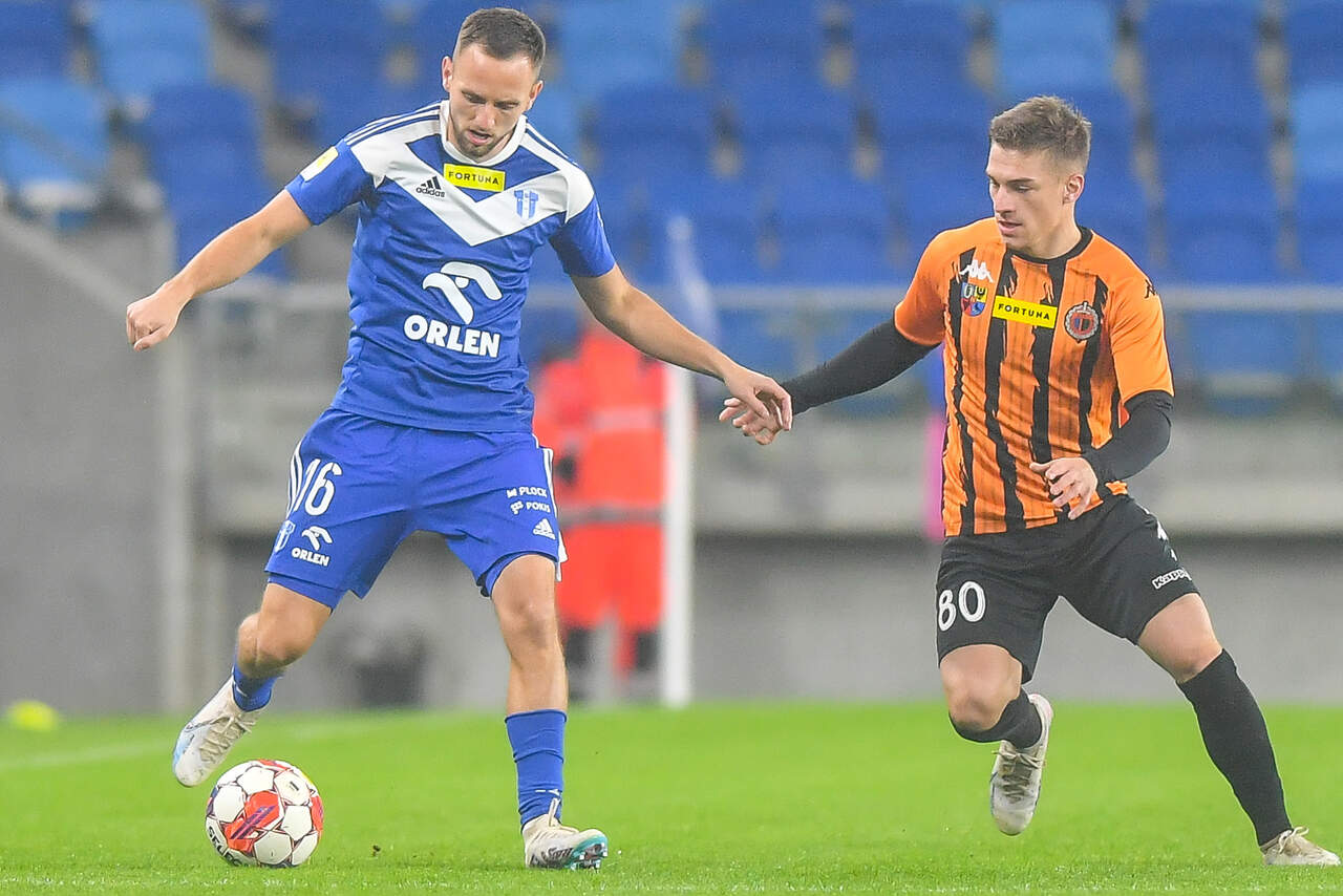 Mimo wielu okazji bez punktów w Płocku Znacznie bardziej aktywny w ofensywie i mający więcej sytuacji Chrobry nie zasłużył na taki koniec, ale po 90 minutach na tablicy zostało 2:1 dla Wisły Płock. 27-10-2023 07:55 autor: ŁJ Trener Piotr Plewnia zdecydował się na kilka zmian w zestawieniu jedenastki. Obronę zasilił Gabriel Estigarribia, zastępując Mavroudisa Bougaidisa, a w podstawie pojawili się też Szymon Bartlewicz z Arturem Boguszem, wobec czego na ławce usiedli Robert Mandrysz i Bartosz Biel. W porównaniu do ostatniego meczu z Motorem Lublin, Chrobry robił dużo w ofensywie, aby mieć z czego strzelić. Co prawda jako pierwszy uderzał Fabian Hiszpański, przy czym interweniował Damian Węglarz, ale głogowianie odpowiadali. Artur Bogusz przymierzył ładnie, choć niecelnie z dystansu, a w 20 minucie po rajdzie Patryka Muchy prawą stroną i jego dograniu w szesnastkę, strzelał Mateusz Ozimek, tyle że i w tym przypadku futbolówka poszybowała ponad poprzeczką. W 32 minucie dobrze na będącego w polu karnym Mikołaja Lebedyńskiego dośrodkował Kacper Tabiś. Mocna główka napastnika Chrobrego, podobnie jak wcześniejsze próby Pomarańczowo-Czarnych, była niecelna, ale trudno było nie odnieść wrażenia, że głogowianie wyciągnęli wnioski, bo konsekwentnie przedzierali się do przodu. Tym bardziej, że po raz drugi w tym pojedynku na uderzenie z dystansu zdecydował się Artur Bogusz. Było to groźne dla gospodarzy, choć ostatecznie piłka nie zmierzała w światło bramki. Mimo tych chęci wynik po 45 minutach pozostawał bez zmian. Celny strzał był po stronie Wisły, lecz więcej miał Chrobry. W drugiej połowie Chrobry nadal intensywnie szukał swojej chociaż jednej, jedynej okazji. Mógł prowadzić w 52 minucie, gdy po wrzutce Patryka Muchy z rzutu rożnego tuż obok bramki główkował Mikołaj Lebedyński. To była najlepsza sytuacja tego meczu, który zaraz po niej zaskakująco ułożył się dla gospodarzy. Jednym wejściem w szesnastkę wywalczyli rzut karny, gdy faulował Kacper Tabiś, i dokładnie w 54 minucie Damiana Węglarza z jedenastego metra pokonał najlepszy strzelec płocczan Łukasz Sekulski. Pomarańczowo-Czarni odpowiedzieli błyskawicznie. Pewny w tym spotkaniu egzekutor stałych fragmentów Patryk Mucha dośrodkował tym razem z rzutu wolnego, a głową golkipera Wisły pokonał Gabriel Estigarribia. To pierwszy gol tego zawodnika w barwach Chrobrego. Wydawało się, że to napędzi głogowian, jednak wykazywać się zaczęli miejscowi. W 65 minucie pomógł Damian Węglarz, który obronił strzał Mateusza Szwocha i dobitkę. W tym okresie to rywale naciskali i 120 sekund później znów objęli prowadzenie, a na listę strzelców po raz drugi wpisał się Łukasz Sekulski. To trochę podcięło skrzydła aktywnemu w tym spotkaniu Chrobremu, choć nie na tyle, aby nie mieć kolejnych sytuacji. Próbowali jeszcze Kamil Wojtyra z Mateuszem Ozimkiem, a już w 90 minucie po kolejnej główce Wojtyry piłkę z linii bramkowej wybił Jakub Gric... Następnie niemal to samo po strzale Bartosza Biela zrobił Beniamin Czajka… Trzy punkty zostały więc w Płocku. Co za pech. Teraz ponad tydzień przerwy, bo mecz 14 kolejki ze Zniczem Pruszków w poniedziałek 6 listopada. Rozpocznie się o godz. 18.00 na stadionie w Głogowie. Fot. 400mm.pl